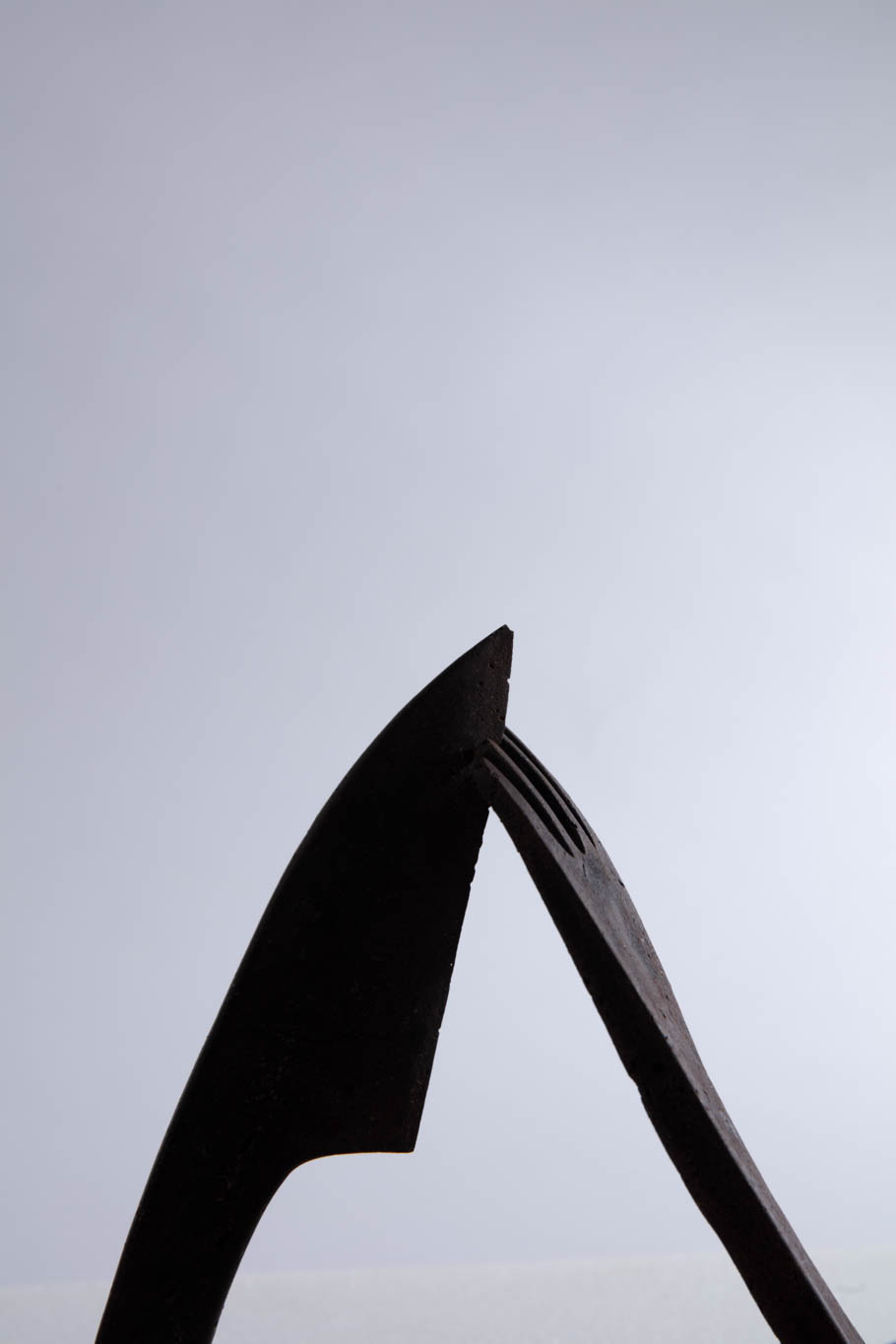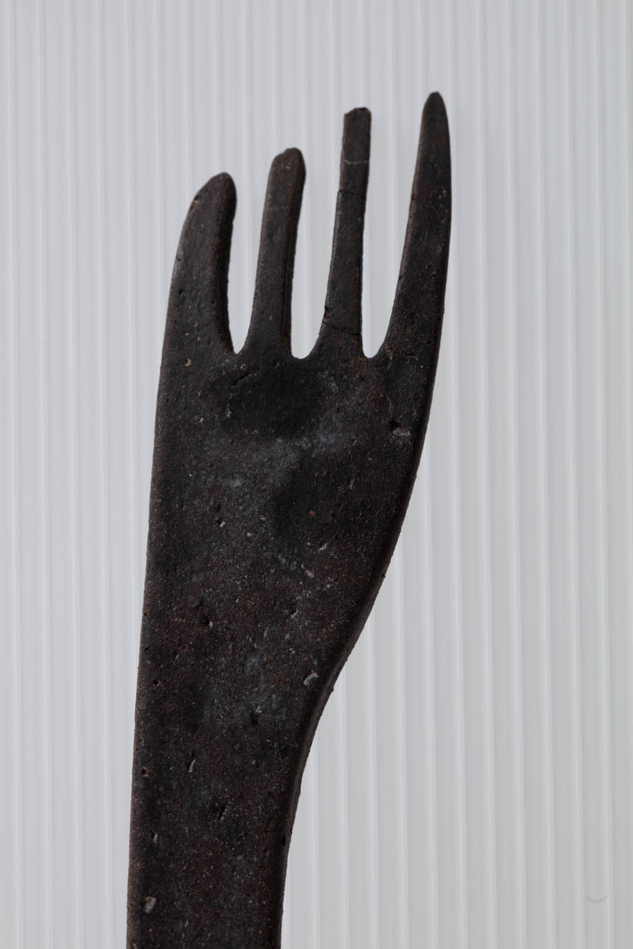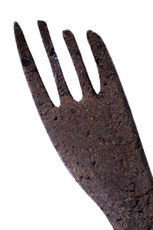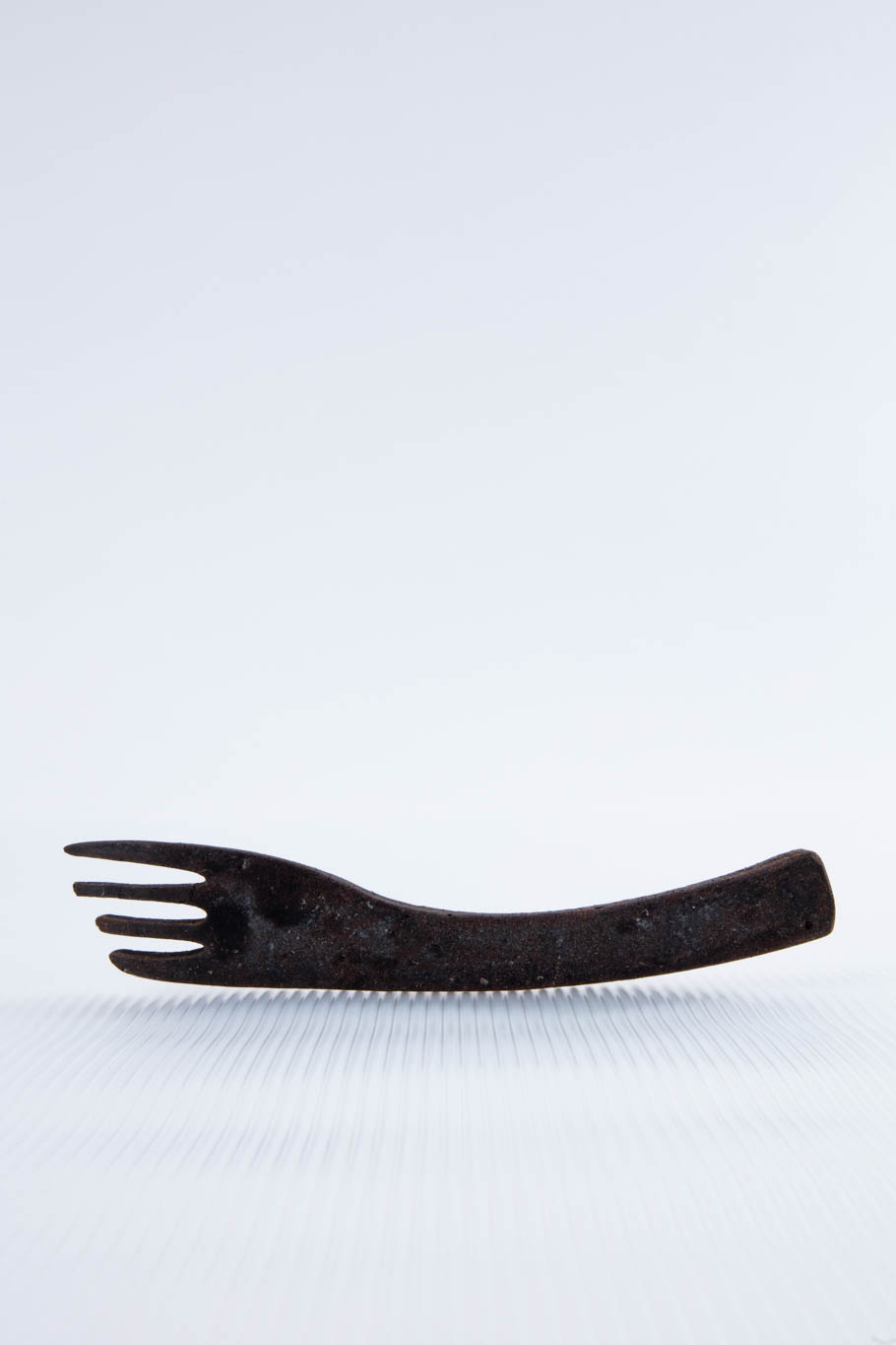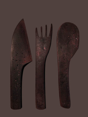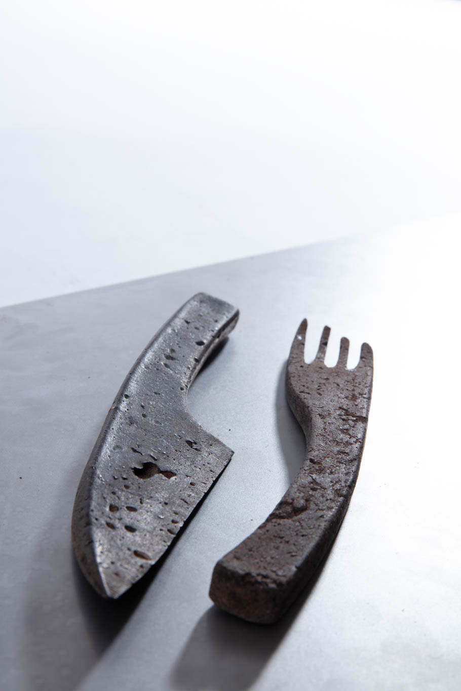 Die Idee, das Material symbolisch in Form eines Besteck Sets auszustellen, entstand aus dem Wunsch, eine intime Beziehung zwischen Betrachter und Objekt herzustellen, um somit eine möglichst starke Reaktion auf das Material hervorzurufen. Das archaisch anmutende Besteck kann durch diesen Effekt außerdem für eine bewusstere Ernährung sensibilisieren – gerade in Hinblick auf unseren alltäglichen Fleischkonsum.