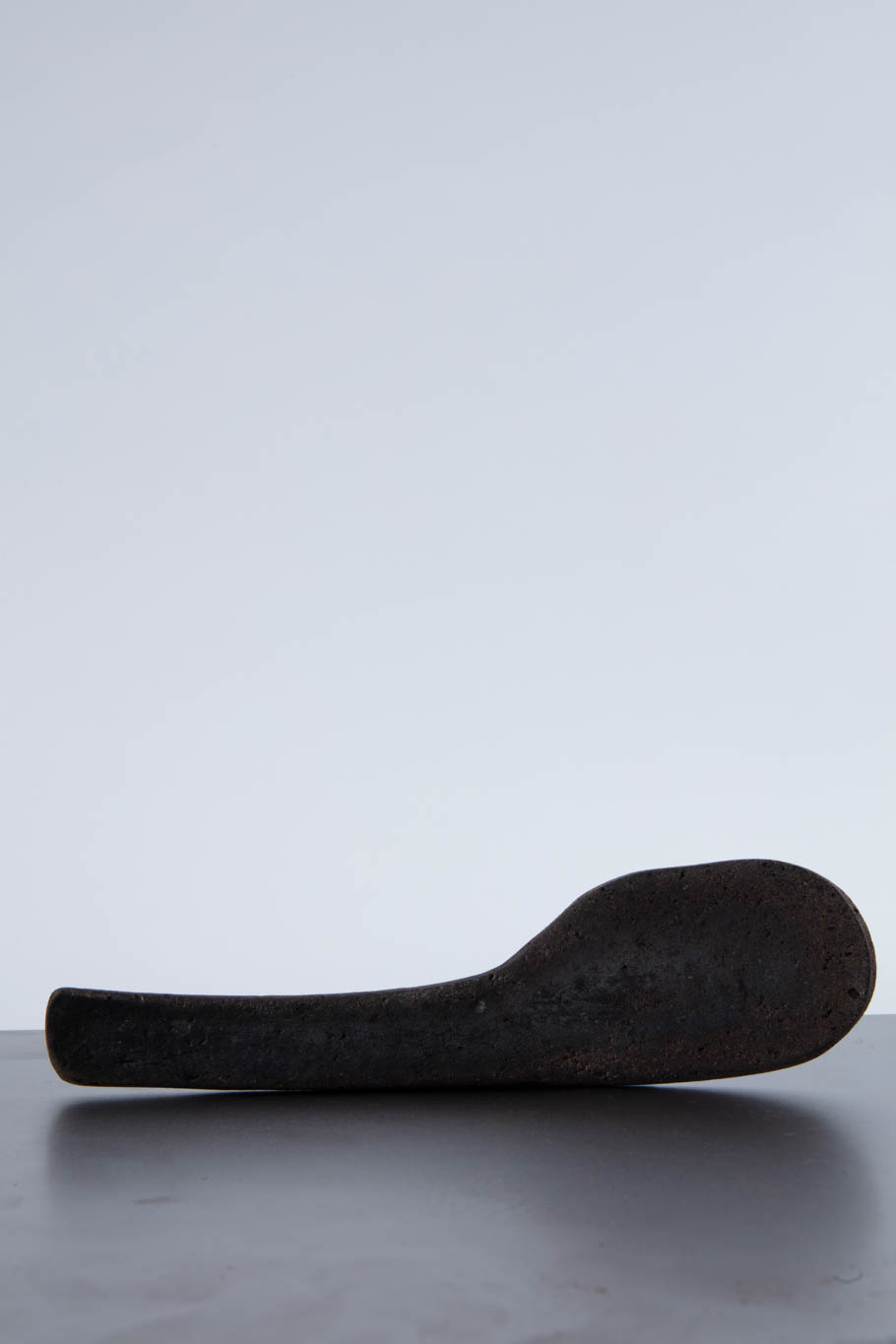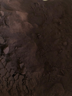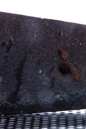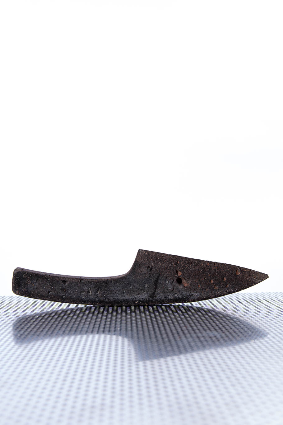 Ausgehend von dieser Recherche begann ich mit dem Rohstoff Blut zu experimentieren und entwickelte eine neue Rezeptur aus getrockneten Schweineblut und Sägemehl in einem zwei zu eins Mischverhältnis. Das Blutpulver und der fein gesiebte Holzstaub werden hierbei mit Wasser zu einer dickflüssigen Masse vermischt, in eine zweiteilige Gipsform eingestrichen, mit Gewichten im Ofen zu einem Block getrocknet und in Form gepresst. Anschließend trocknet das Material ein bis zwei Tage nach und wird dann in die gewünschte Form gefeilt und geschliffen.