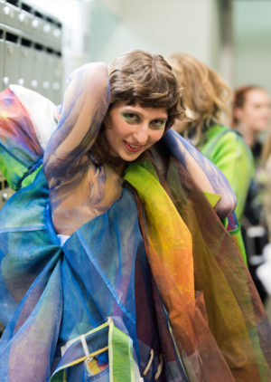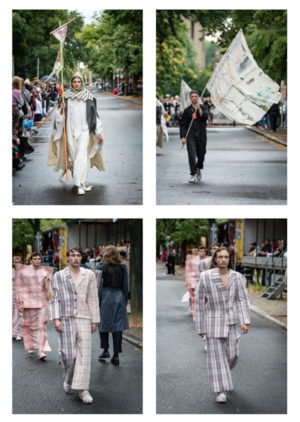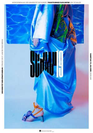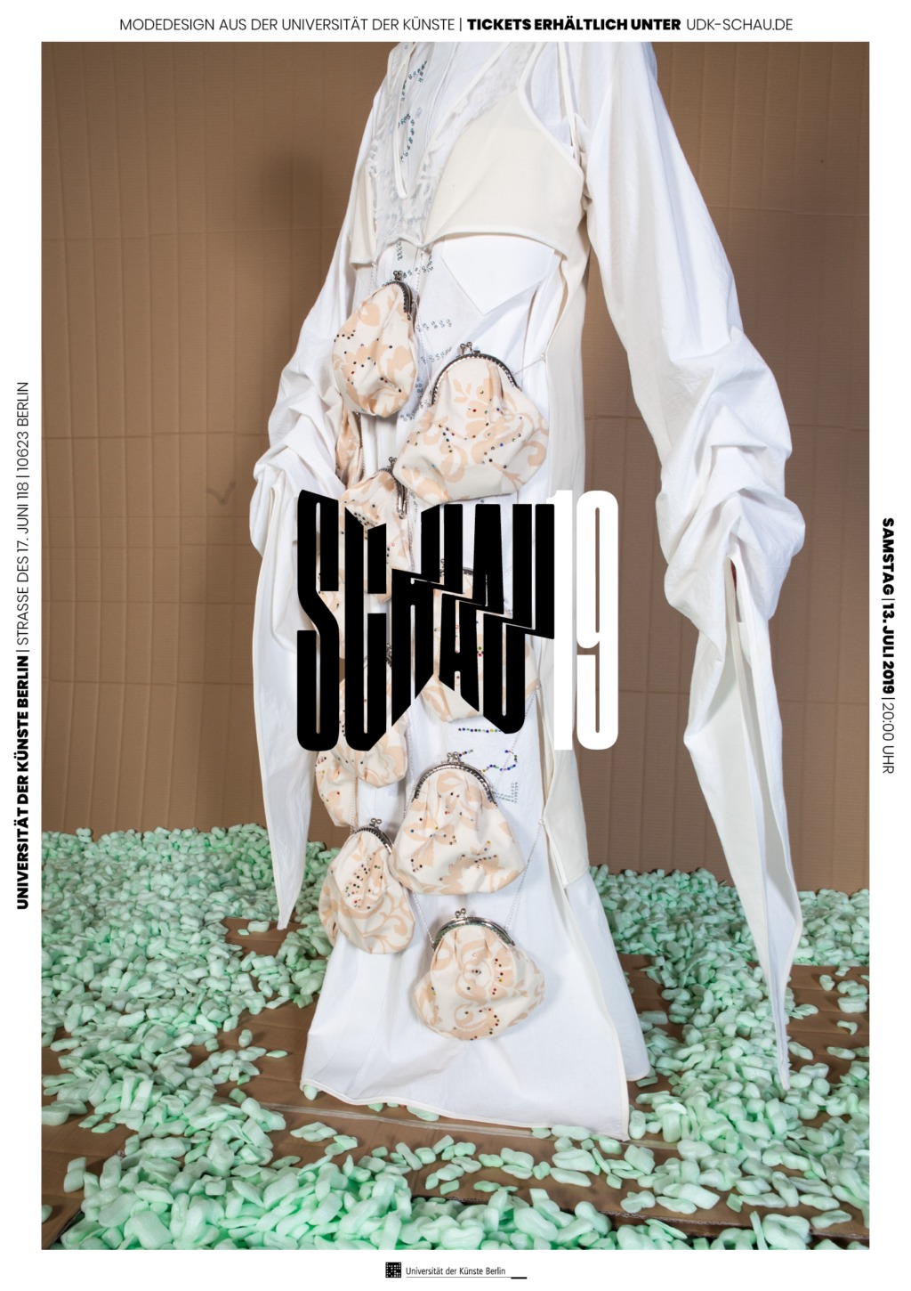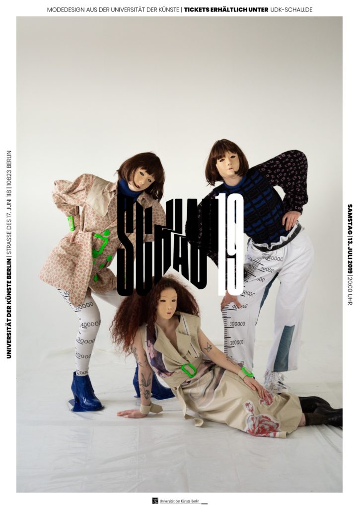 „Unkonventionelle Dekonstruktionen und innovative Schnittführungen: Am Samstag, 13. Juli 2019 präsentierten die Studierenden des Instituts für experimentelles Bekleidungs- und Textildesign der Universität der Künste(UdK) Berlin im Rahmen der SCHAU19 ihre Projektarbeiten und Abschlusskollektionen erstmalig auf der Straße des 17. Juni. Dem Publikum wurde eine stilistische und thematische Bandbreite aus experimentellen Herangehensweisen, interdisziplinären Positionen, New Age-Flair und performativen Inszenierungen vorgeführt. Ein Modefestival für Pressevertreter, Industrieinsidern und Mode-Interessenten.“