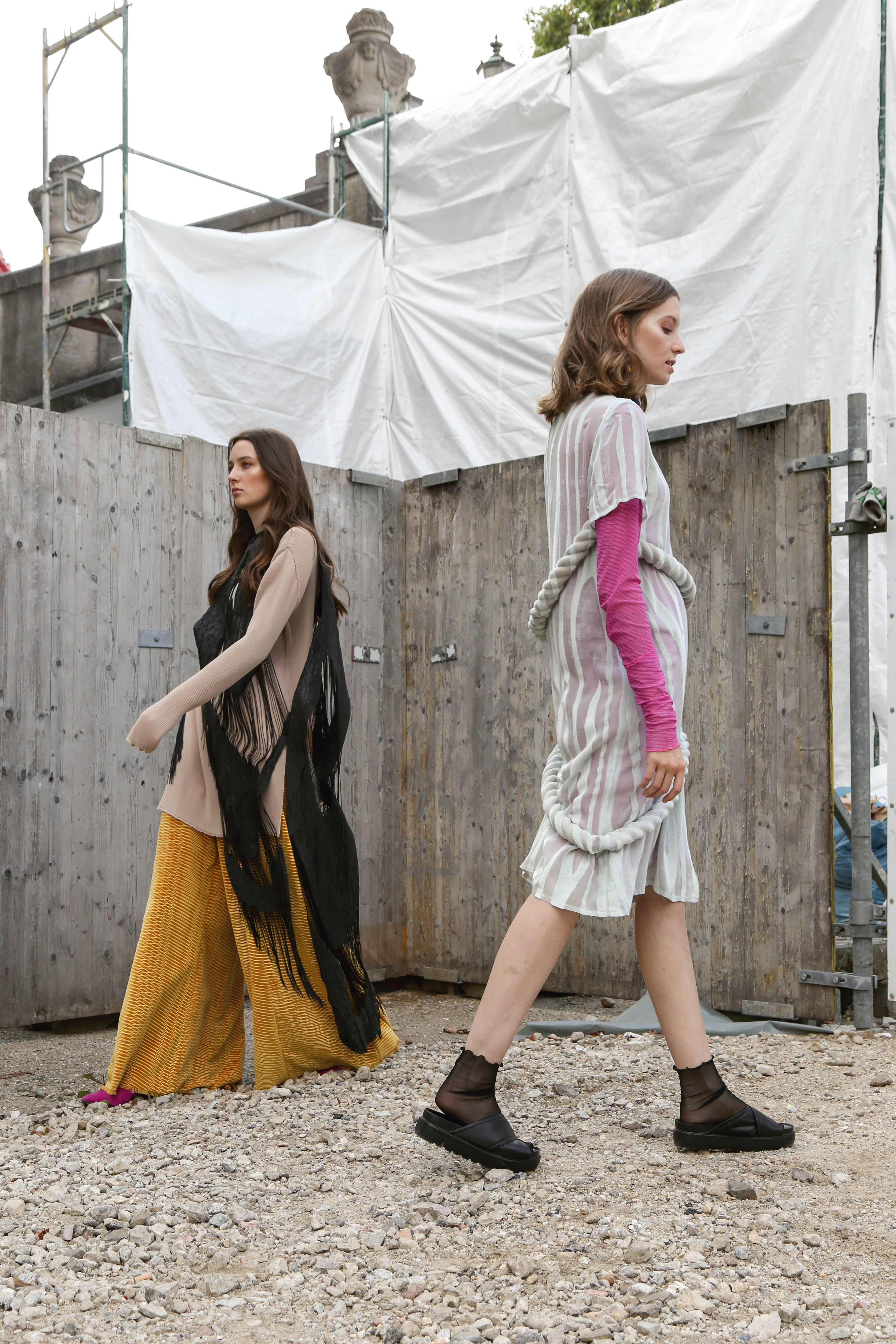 I was searching for new ways of working with the idea of decoration in order to reconcile it with minimalism. I did this by developing different techniques of fabric manipulation. Inspired by 18th century rococo, I used industrial-strength ropes, clear plastic tubes and full-body-length fringes coated in foaming pastes as analogies to traditional surface embellishments and body-forming elements of the time. The cut of the clothes, however, is strongly influenced by minimalist fashions of the 20th century.