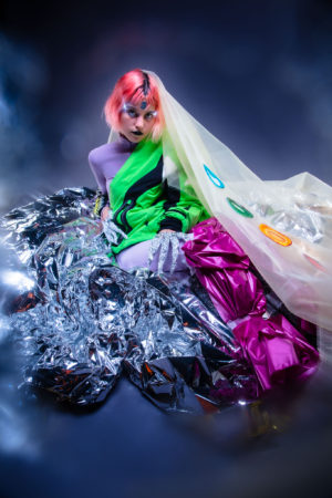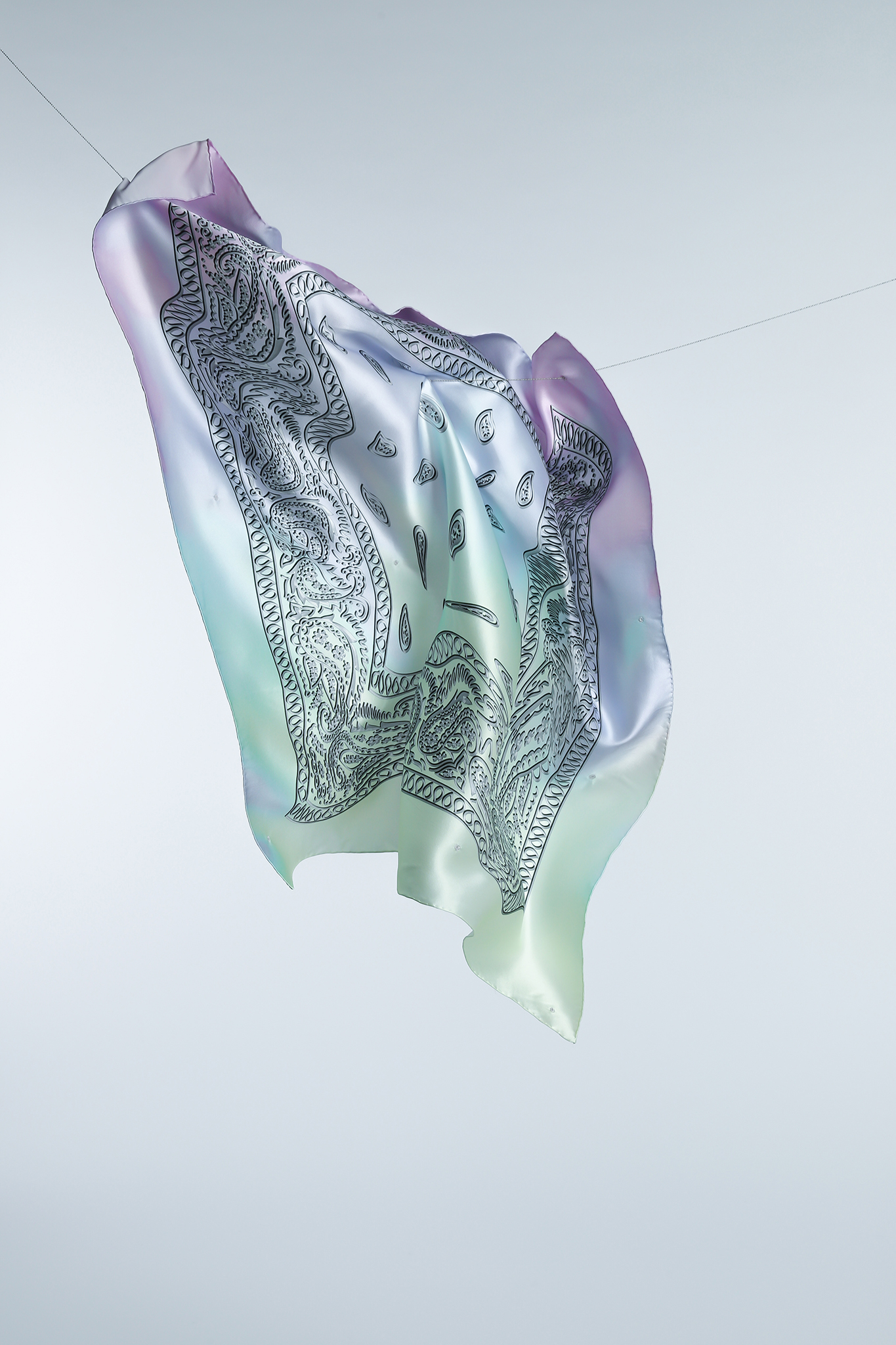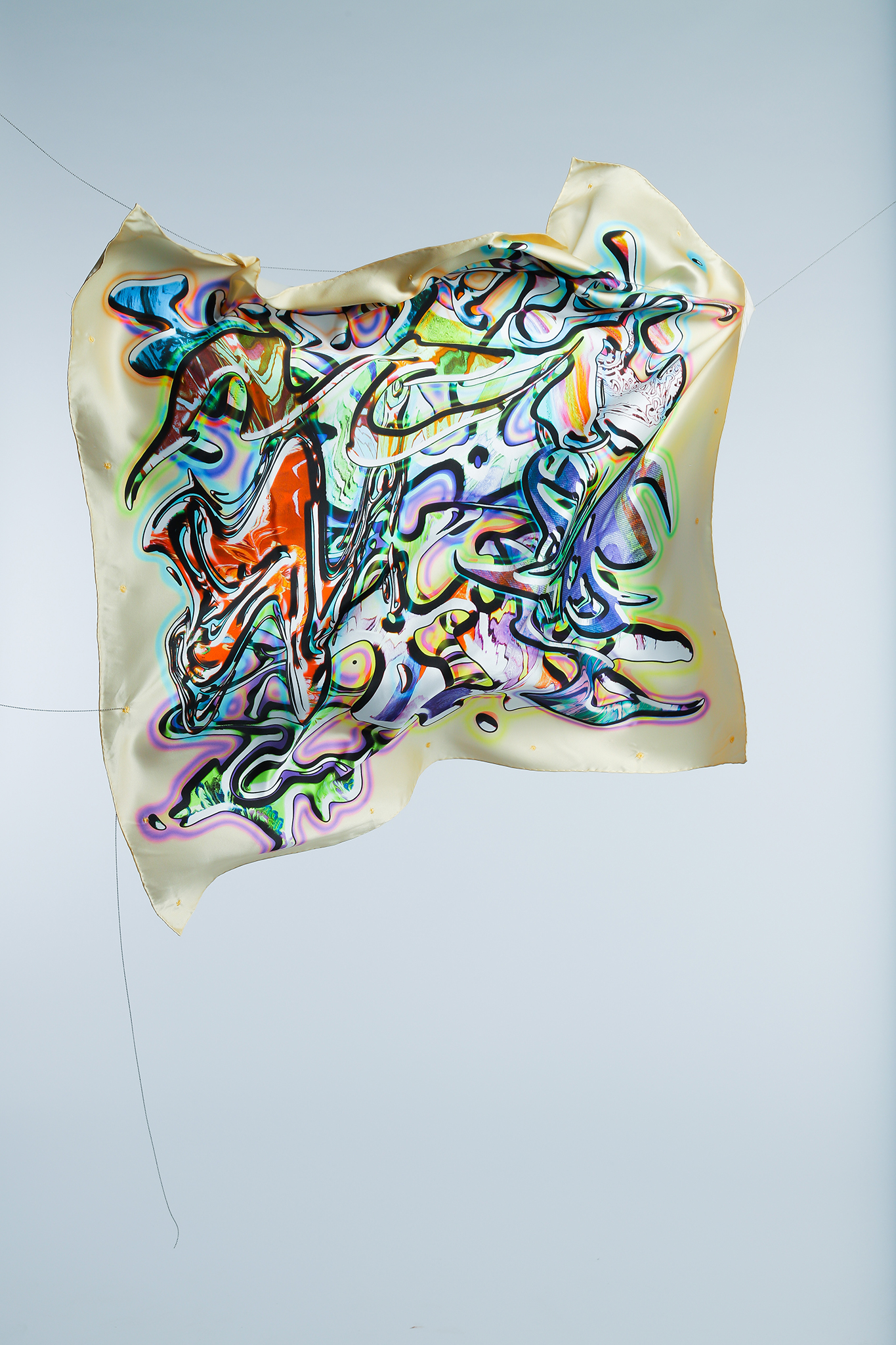 The results are the Gothic Hacker Angel, jewelry with aluminum elements, the Psychedelic Healing Savant, printed silk scarfs, the Spiritual Cyber Demon, fragments of clothing, the Norm Tech Sorcerer, a scent and a glas object.
