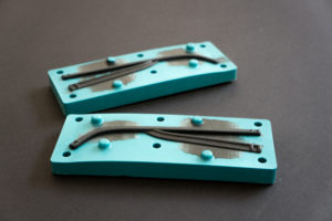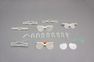 Das Brillenglas wird auf dem FG3-Laser hergestellt. Die Bügel/Nasenauflage durch unseren DIY Spritzguss. Dafür muss eine 2-Teilige Gussform 3D gedruckt werden. Der 3D Druck wird nicht gestellt.