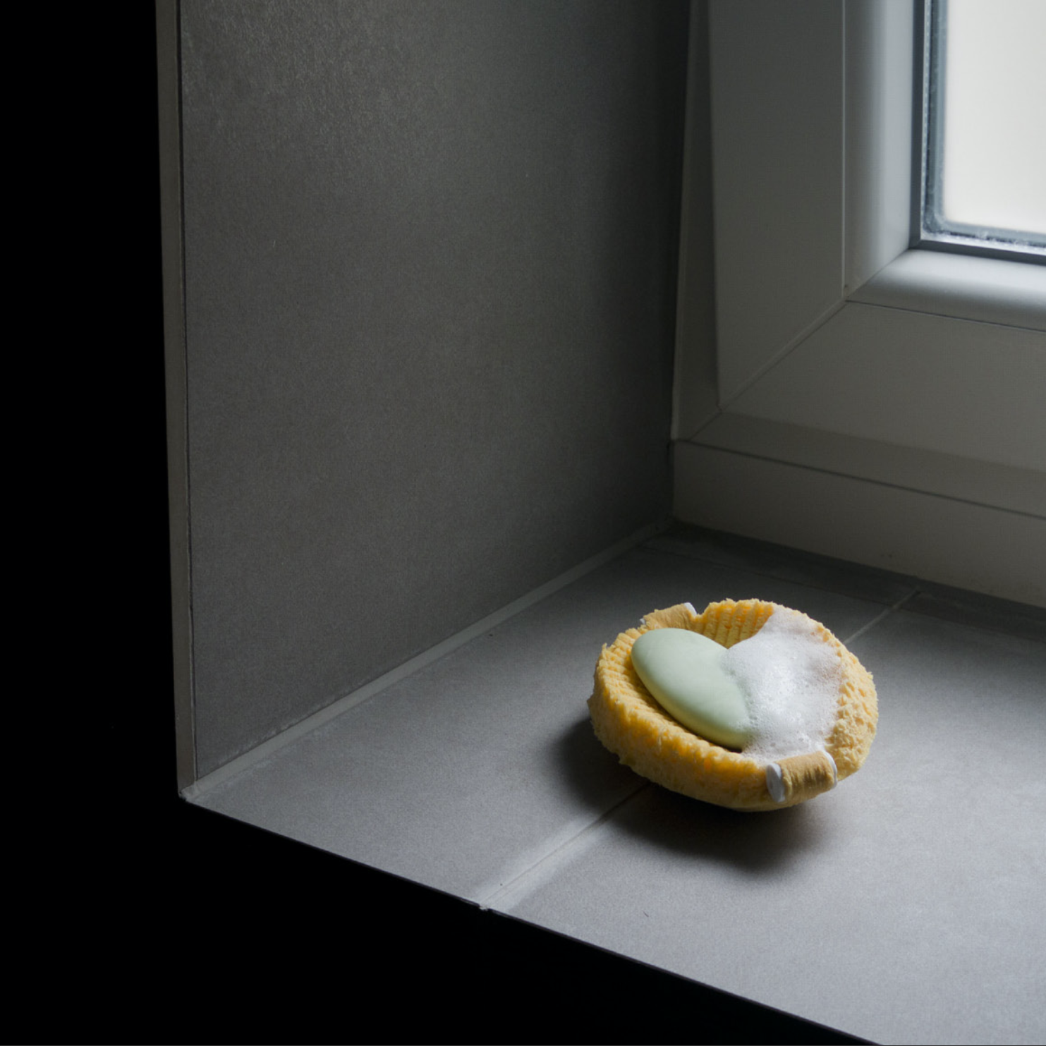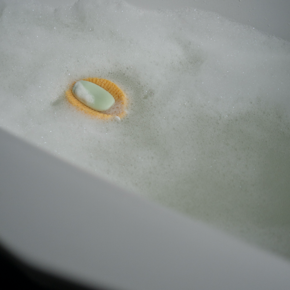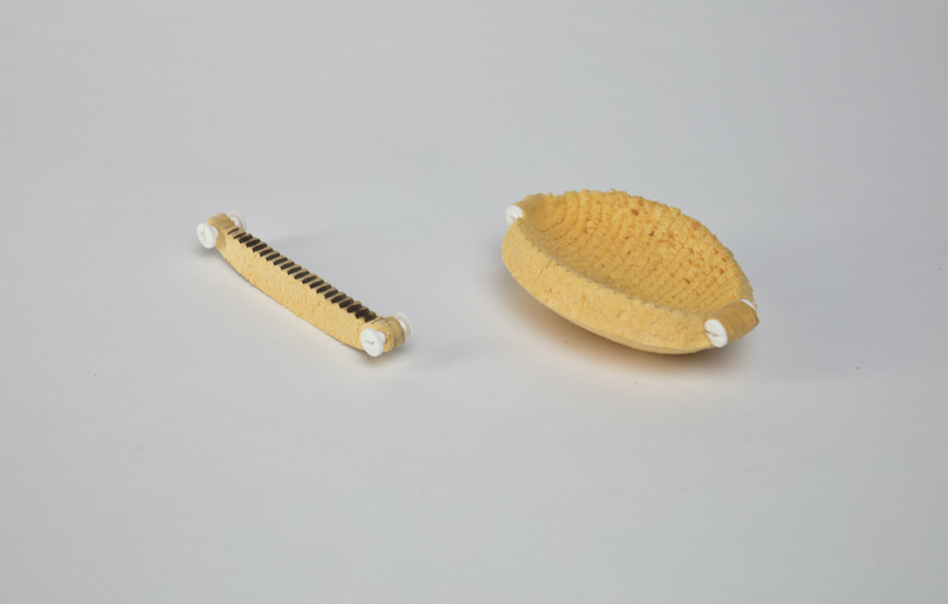 There is a curious magic in watching something grow into something from nothing; a flat surface into a volume; a brittle structure into a flexible container. Schale investigates the possibility of generating form through a change of state made possible by the characteristics of this soft material. When submerged in water, Schale assumes its final form as a viscose soap-dish that can also be used as a bath sponge.