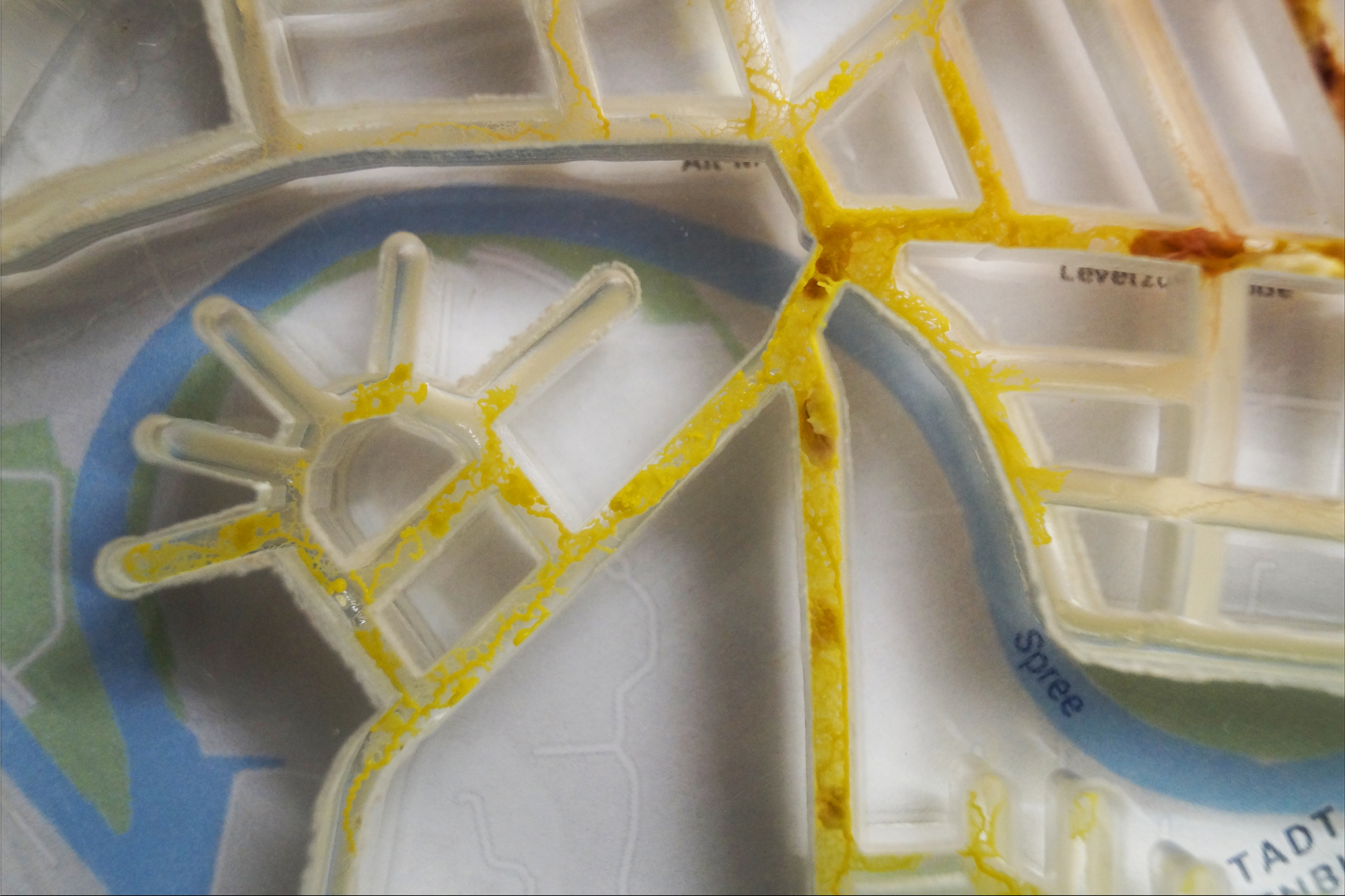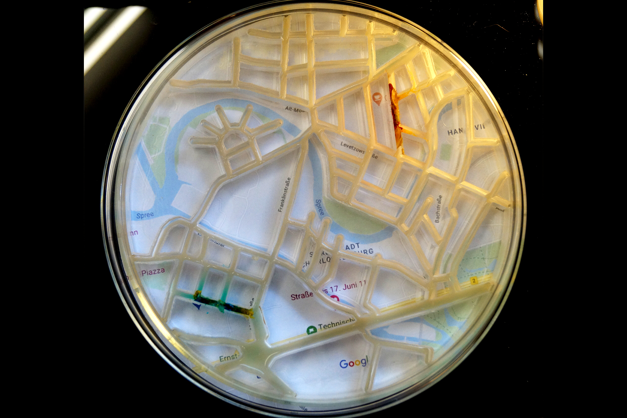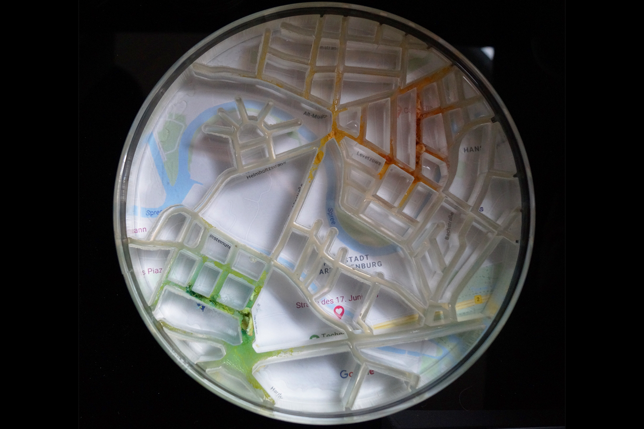 cooperation. Companies and Foodsaver work together in their districts to save food before it is thrown away. The slime mold visualizes the shortest paths between the different participators. Through the slime mold cam you can observe the growth of the slime mold. The idea is that people watch the slime mold and