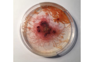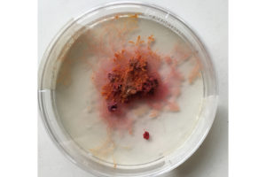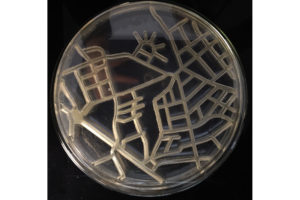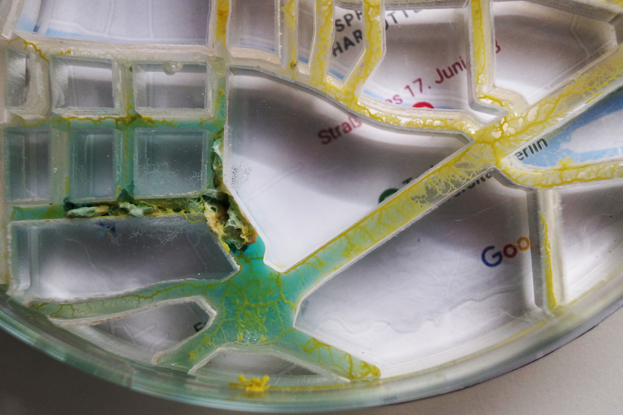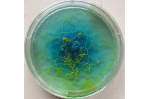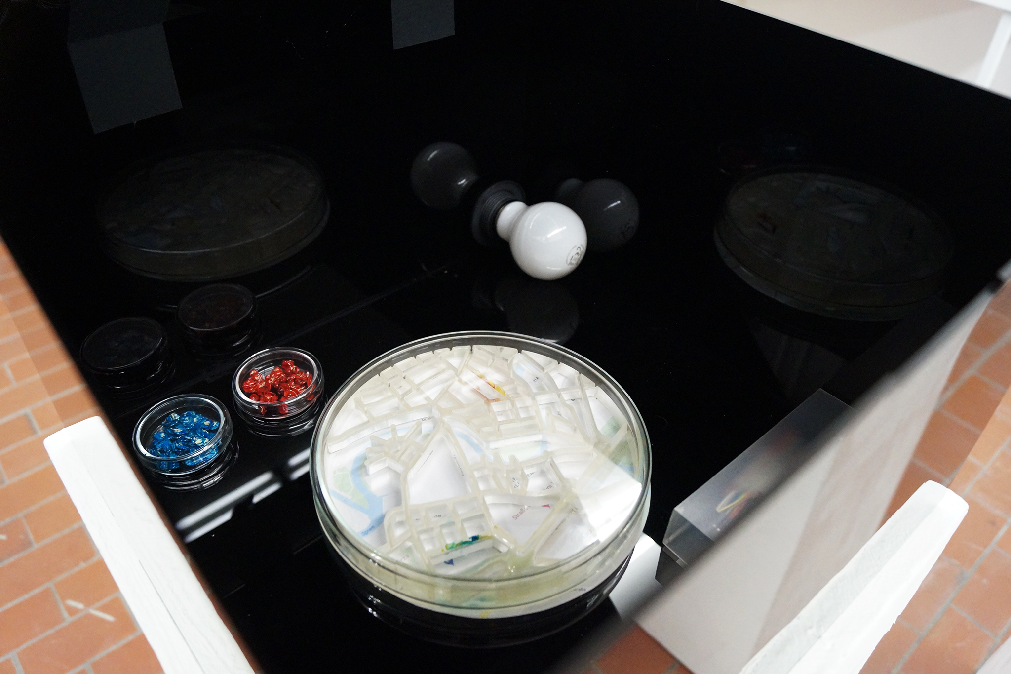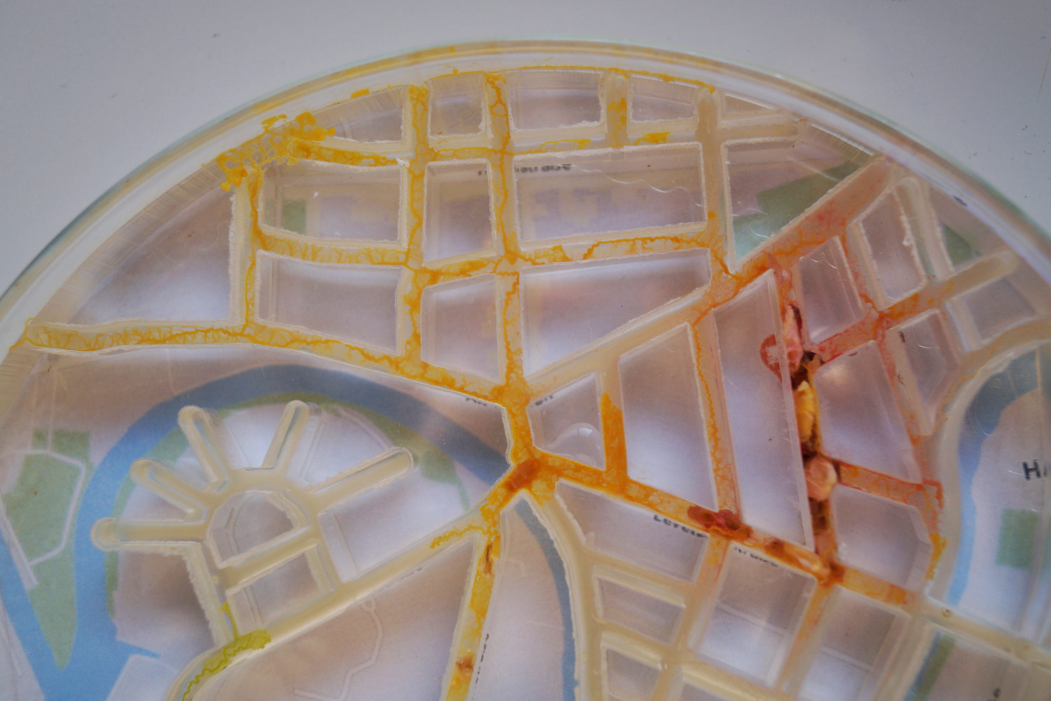 cooperation. Companies and Foodsaver work together in their districts to save food before it is thrown away. The slime mold visualizes the shortest paths between the different participators. Through the slime mold cam you can observe the growth of the slime mold. The idea is that people watch the slime mold and