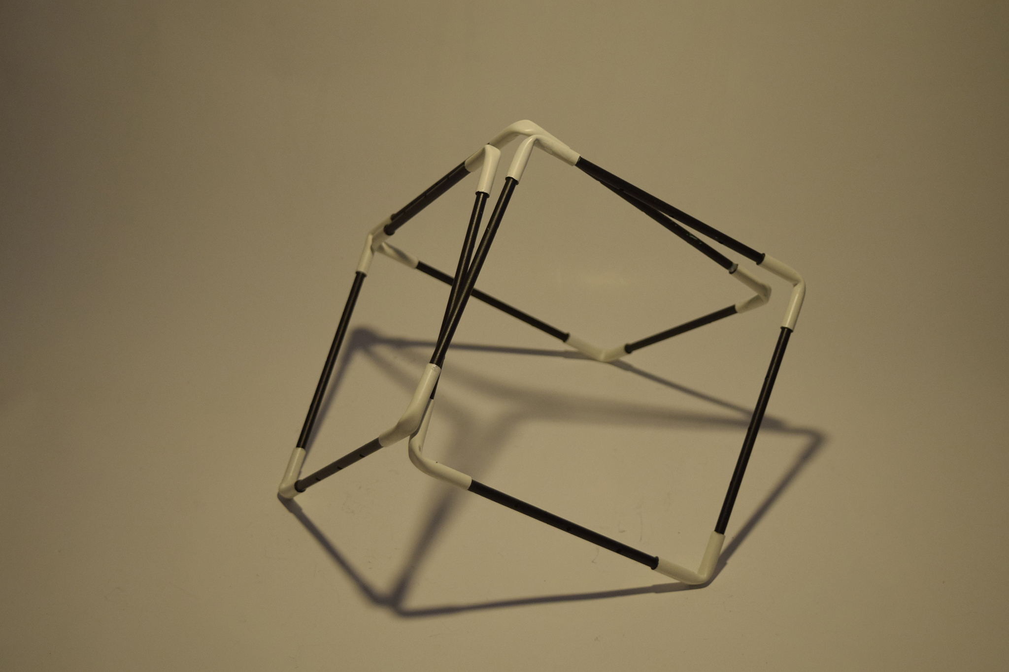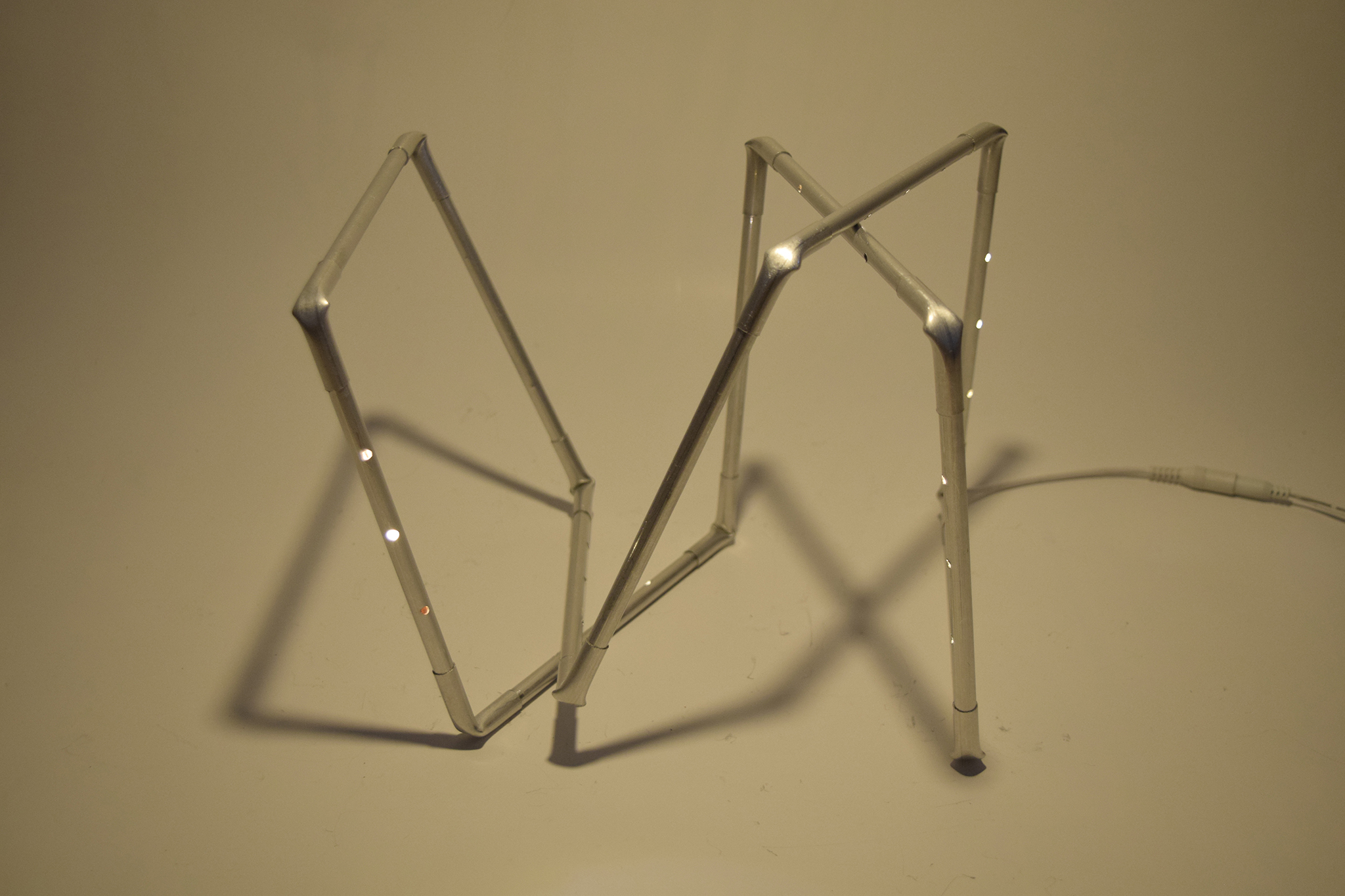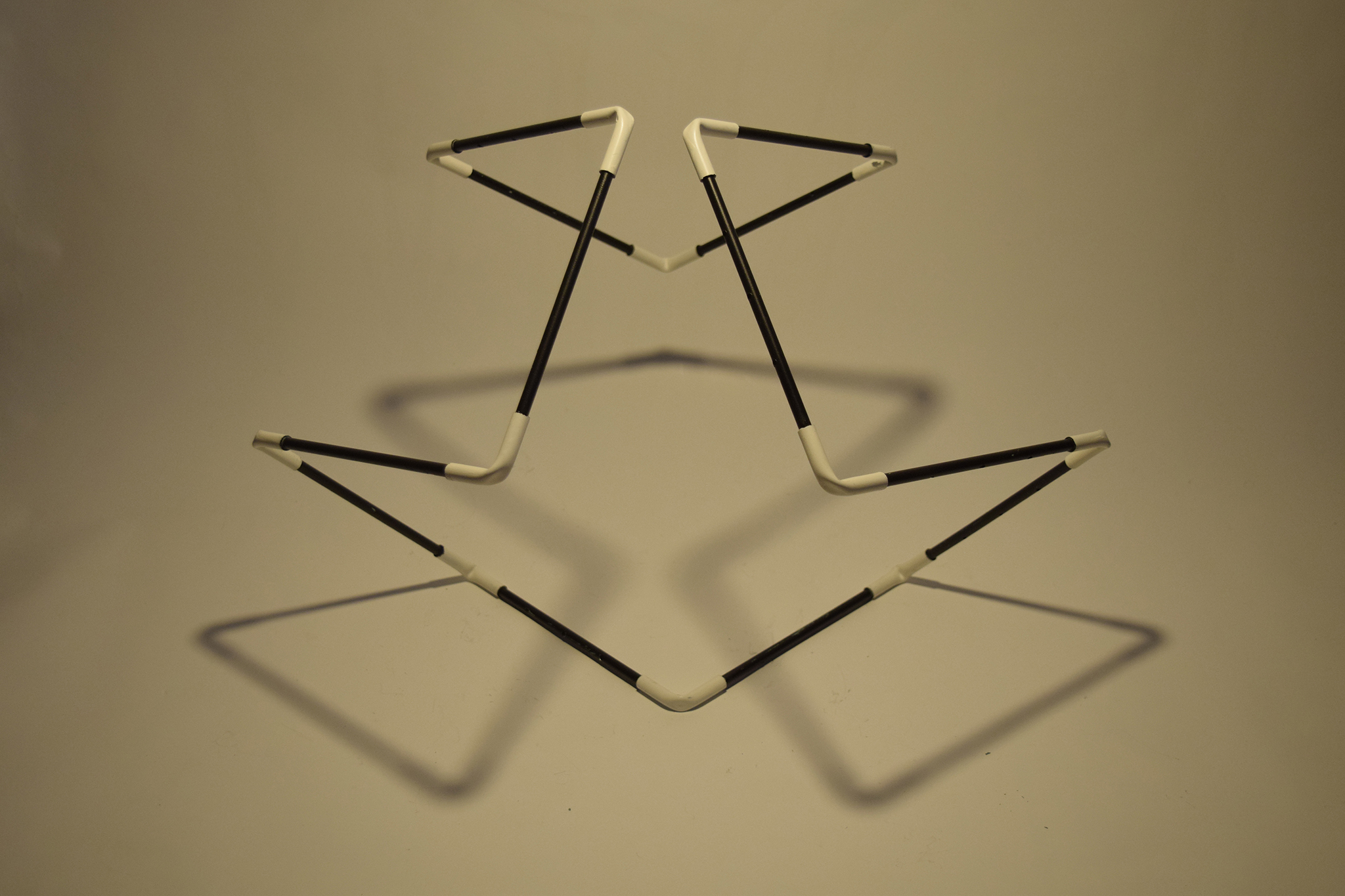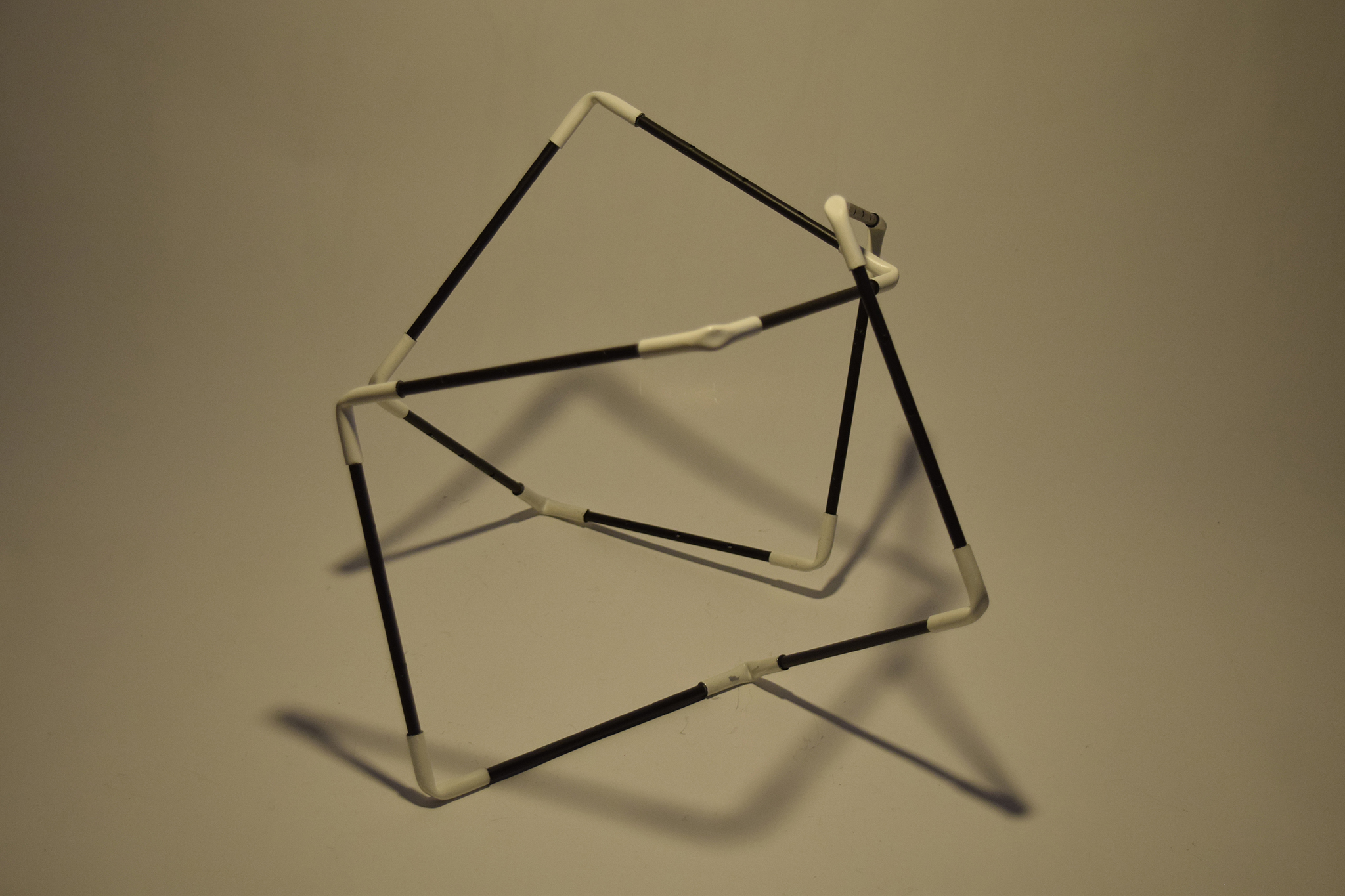 Wie viele Knoten gibt es auf der Welt? Welche Materialien lassen sich knoten oder miteinander verknoten und welche Topologien entstehen dabei? Findet man Symmetrien oder sogar Flächen die man zwischen den einzelnen Verläufen des Knoten-Materials spannen kann? In meinem Projekt 3_D_K, welches sich namendlich von „3d Knoten“ ableitet, habe ich versucht den Knoten einerseits als Raumobjekt jedoch auch als räumliches Objekt zu denken. Zweierlei, denn die entstandene Leuchte stellt ein Objekt im Raum dar, gleichzeitig ist sie jedoch auch ein beweglicher 3 dimensionaler Knoten. Die Besonderheit ist, dass die Leuchte aus Metallstäben gefertigt ist und sich somit nicht beliebig fest ziehen lässt. Durch vorgegebene Gelenke lädt das Objekt jedoch zu semi-freien Bewegungen ein und lässt somit im spielerischen, meditativen Umgang vielerlei Formen entstehen. Im Prozess dieses Projektes begeisterte mich vor allem die Mischung aus Geometrie, Mathematik und Physik die sich in einem Objekt und seinem physischen Verhalten widerspiegelt. So verändern sich jeweils die Bewegungsmöglichkeiten abhängig von den Komponenten: Gelenkanzahl, Gelenkwinkel und Stablänge.