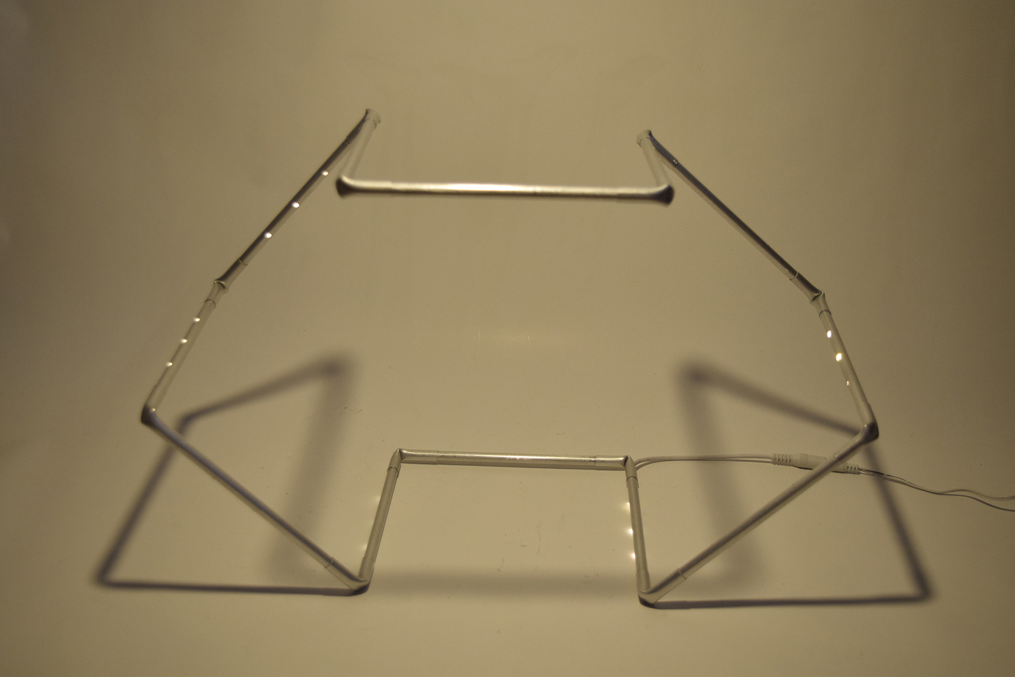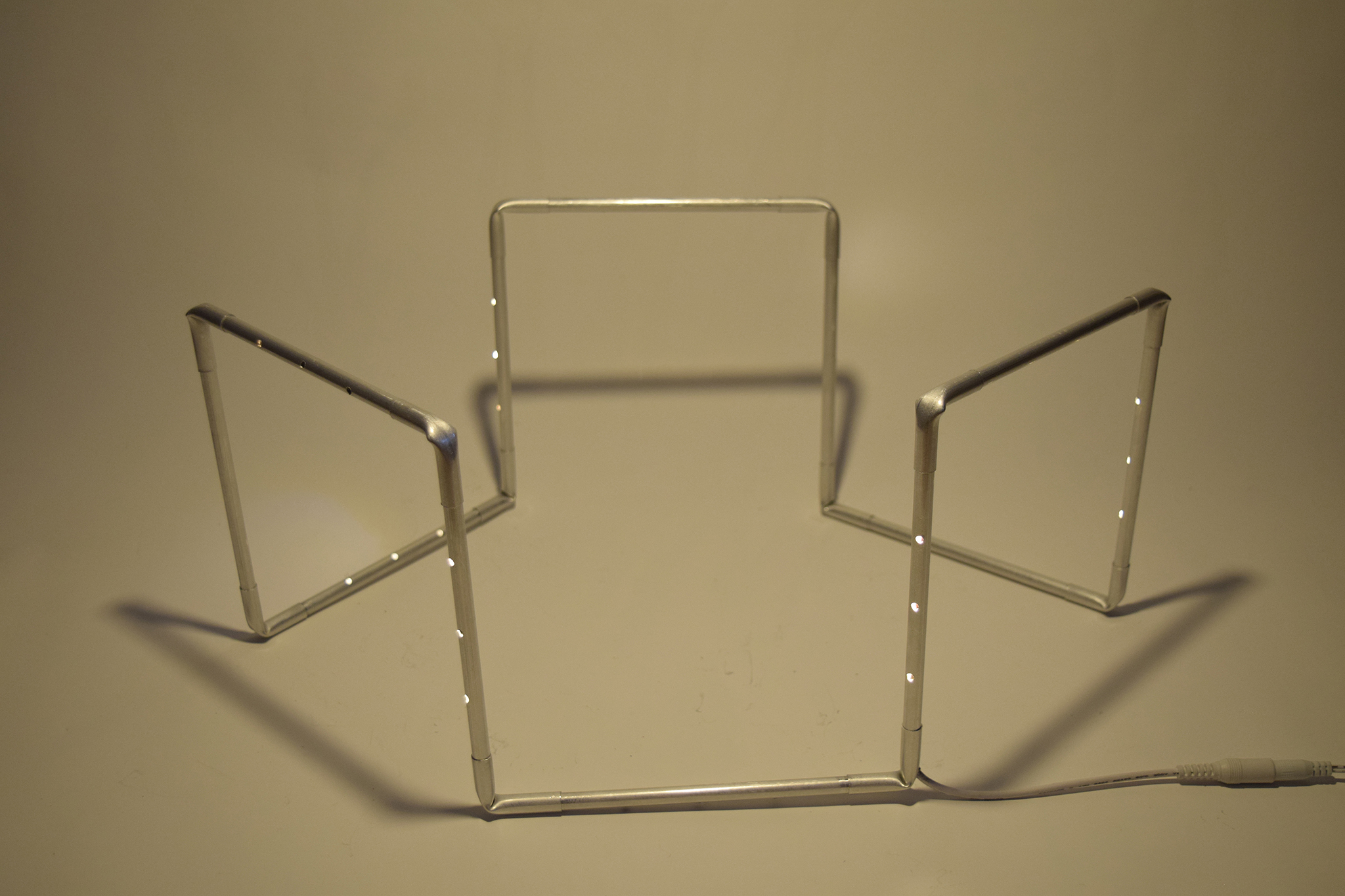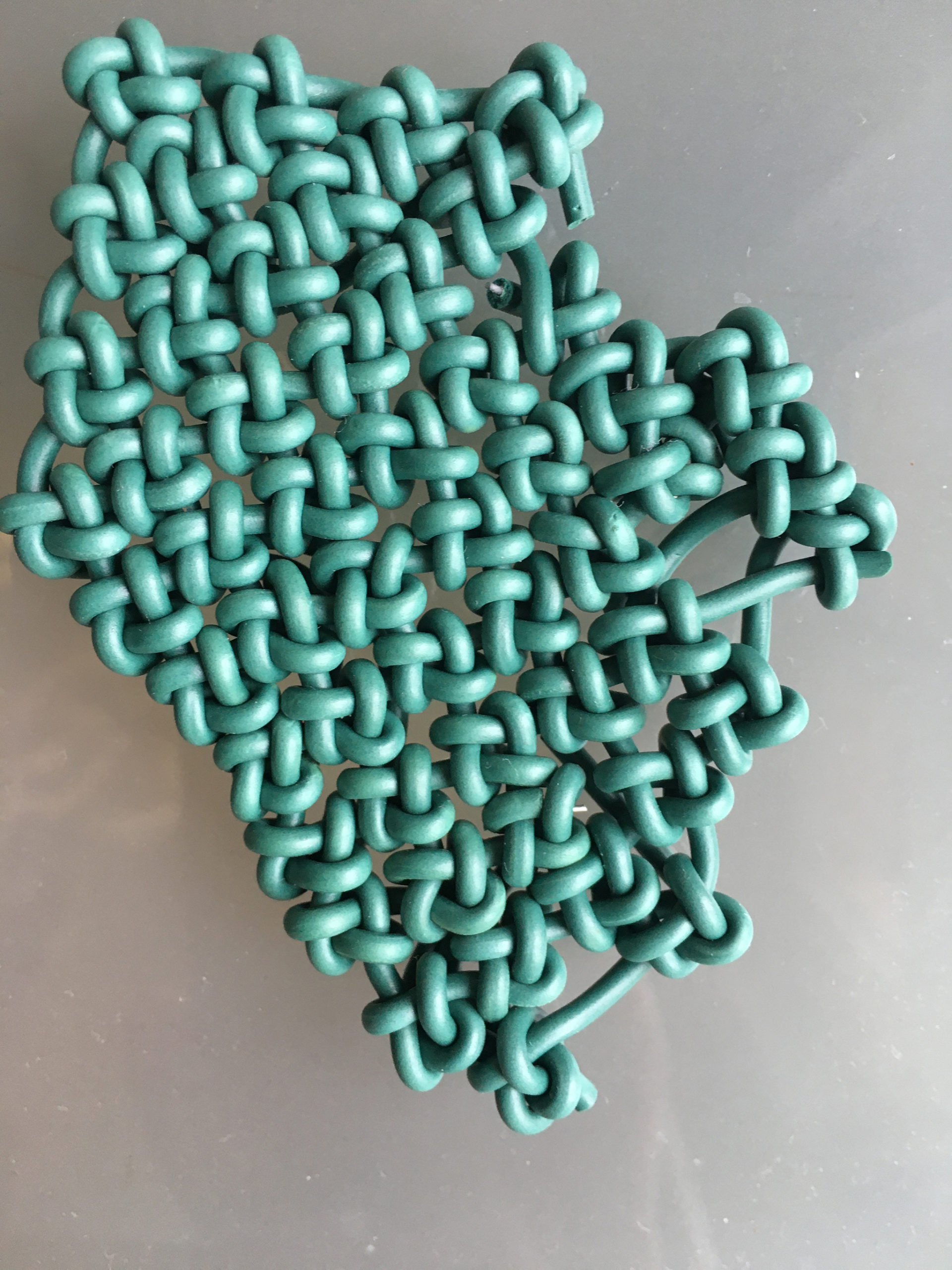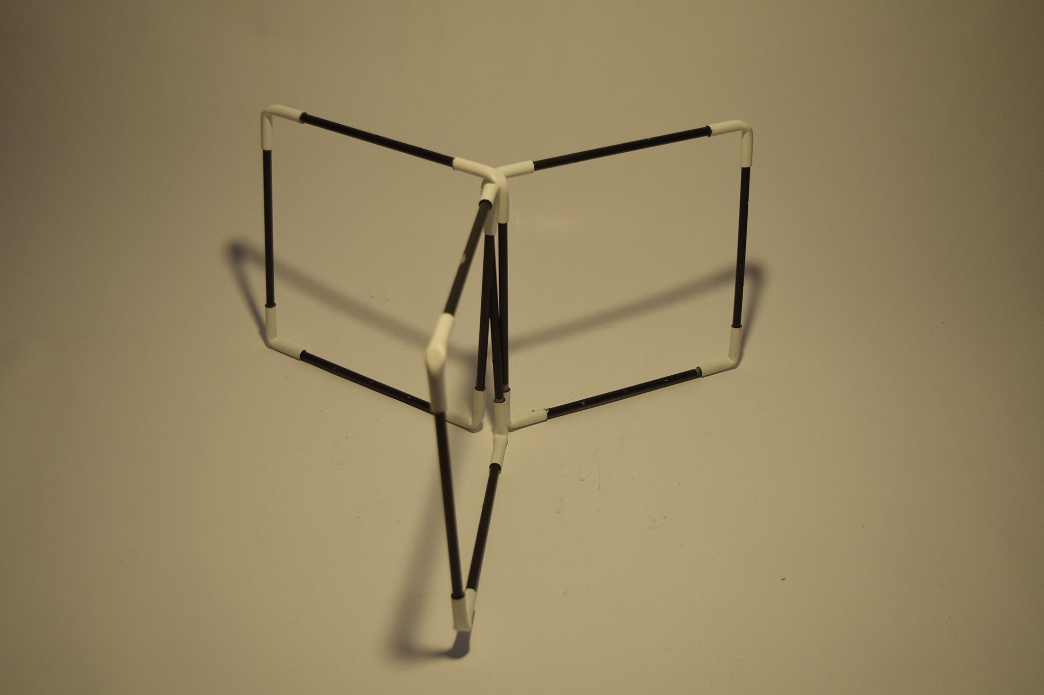 Wie viele Knoten gibt es auf der Welt? Welche Materialien lassen sich knoten oder miteinander verknoten und welche Topologien entstehen dabei? Findet man Symmetrien oder sogar Flächen die man zwischen den einzelnen Verläufen des Knoten-Materials spannen kann? In meinem Projekt 3_D_K, welches sich namendlich von „3d Knoten“ ableitet, habe ich versucht den Knoten einerseits als Raumobjekt jedoch auch als räumliches Objekt zu denken. Zweierlei, denn die entstandene Leuchte stellt ein Objekt im Raum dar, gleichzeitig ist sie jedoch auch ein beweglicher 3 dimensionaler Knoten. Die Besonderheit ist, dass die Leuchte aus Metallstäben gefertigt ist und sich somit nicht beliebig fest ziehen lässt. Durch vorgegebene Gelenke lädt das Objekt jedoch zu semi-freien Bewegungen ein und lässt somit im spielerischen, meditativen Umgang vielerlei Formen entstehen. Im Prozess dieses Projektes begeisterte mich vor allem die Mischung aus Geometrie, Mathematik und Physik die sich in einem Objekt und seinem physischen Verhalten widerspiegelt. So verändern sich jeweils die Bewegungsmöglichkeiten abhängig von den Komponenten: Gelenkanzahl, Gelenkwinkel und Stablänge.