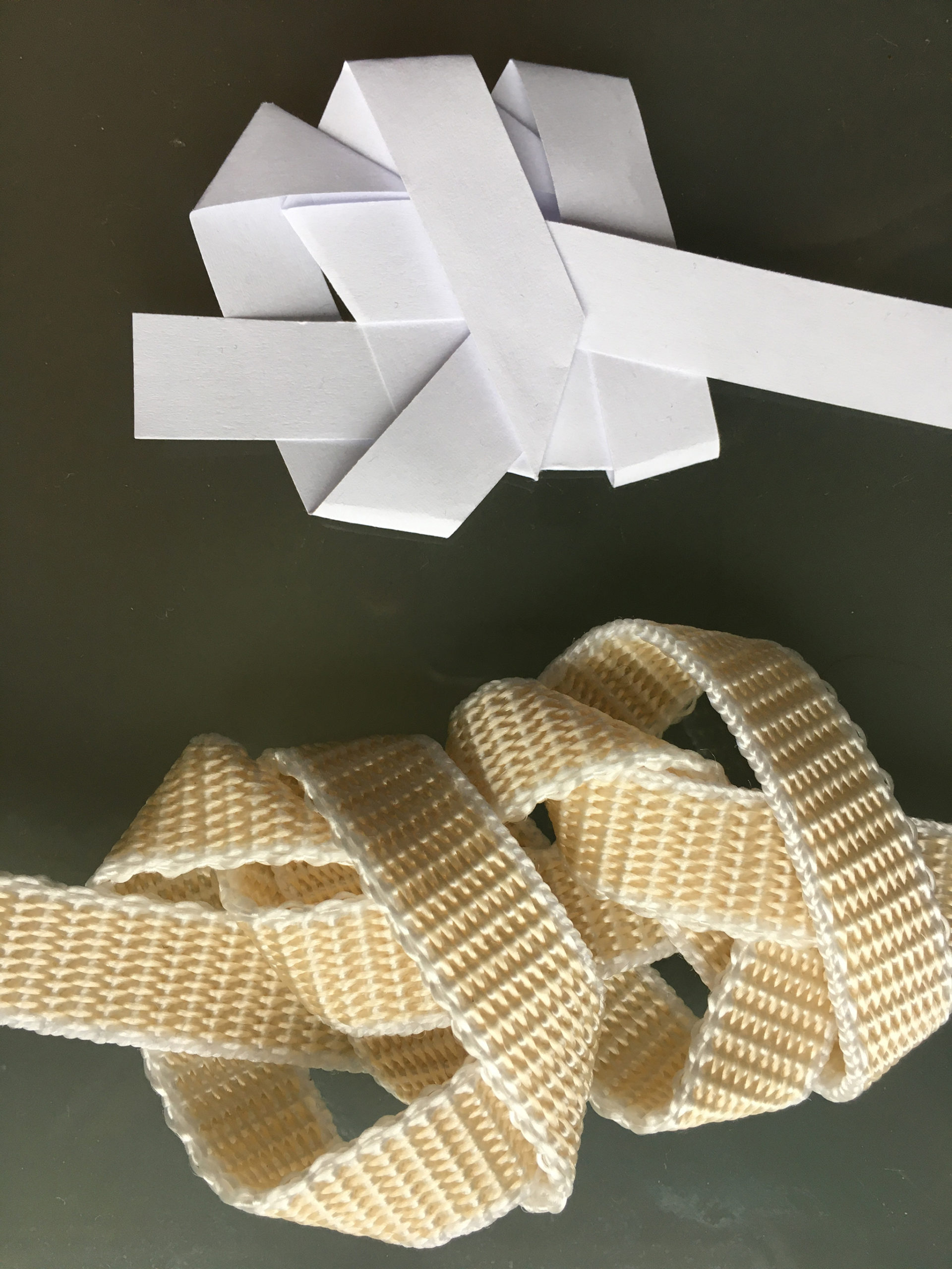 How many knots are there in the world? Which materials can be knotted or knotted together and which topologies arise? Can you find symmetries or even surfaces that can be stretched between the individual runs of the knot material? In my project 3_D_K, wich derives its name from „3d knots“, I tried to think of the knot as a spatial object but also as a Object in the space. Served two ways, because the lamp created represents an object in the room, but at the same time it is also a movable 3-dimensional knot. The peculiarity is that the lamp is made of metal rods and therefore cannot be tightened flexibly. By means of predetermined joints, however, the object invites to semi-free movements and thus creates many forms in a playful, meditative way. In the process of this project I was particularly impressed by the mix of geometry, mathematics and physics, which can be reflected in an object and its physical behaviour. The movement options change depending on the components: number of joints, joint angle and rod length of the metal bar