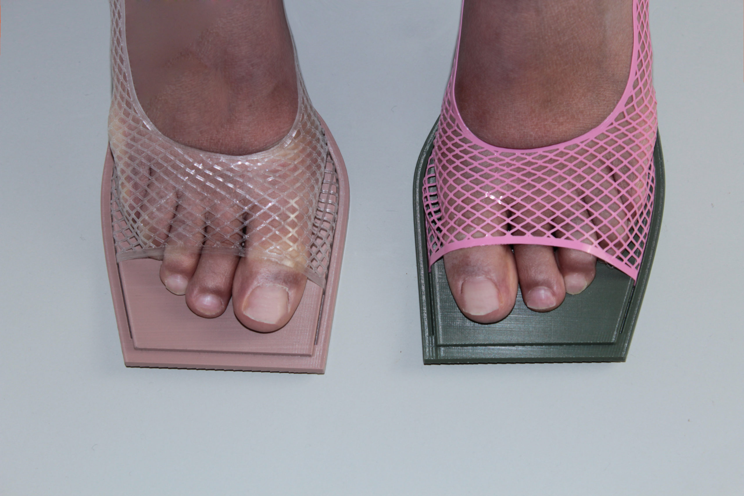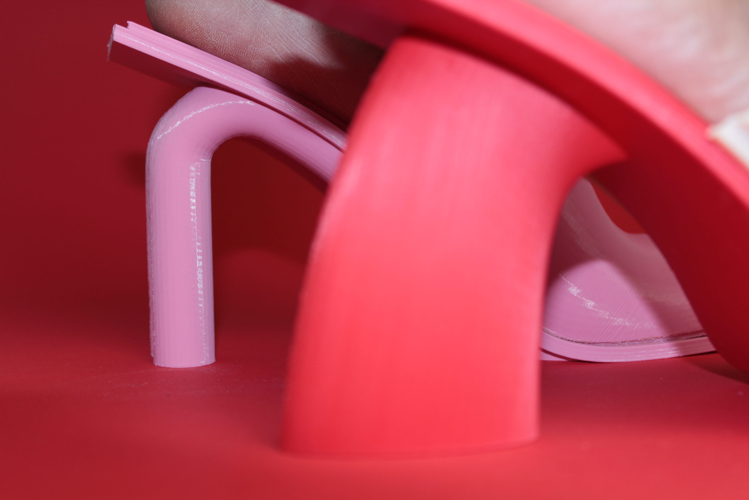 In my bachelor thesis “Hiheel”, I deal with the idea of examining generic typologies and manufacturing methods of high-heeled shoes and redefining them with the help of 3D printing technology. This work is intended to create new examples of a formal language and new structural possibilities. I’ve always wanted to make shoes, but I don’t master the craft of the saddler or shoemaker, let alone access to the necessary machines and tools. Through 3D printing I can open up this object and think and design in my own personal way. 3D printing technology is one of the rapid prototyping technologies, i.e. the manufacturing processes that aim to convert CAD data into workpieces directly and quickly, if possible without manual detours.