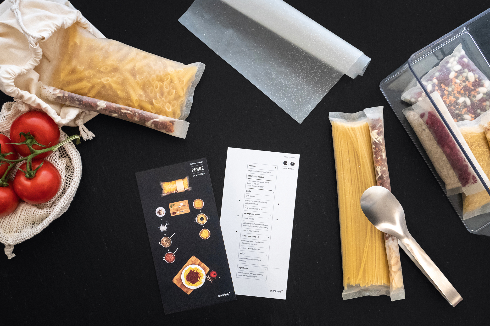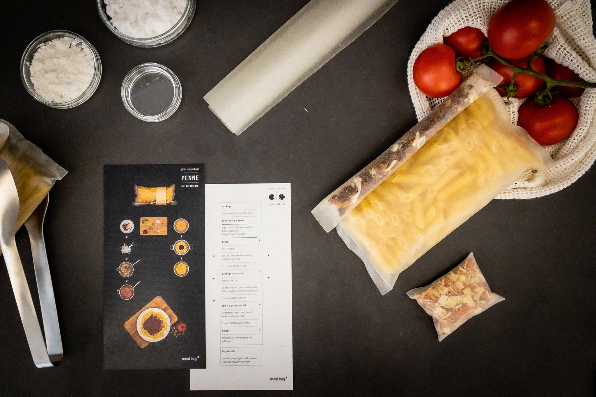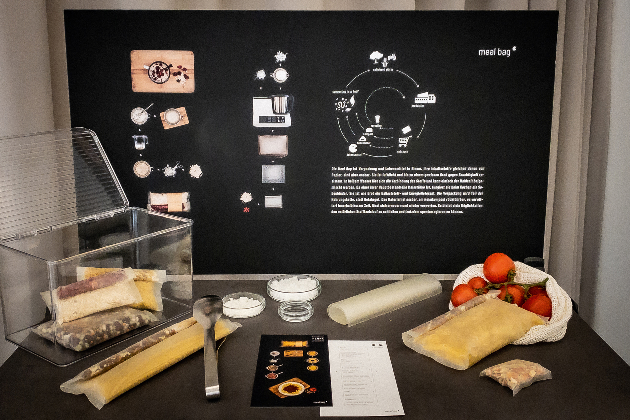 Die Meal Bag ist eine essbare Lebensmittelverpackung. Ihre Inhaltsstoffe gleichen denen von Papier, sind aber essbar. Sie ist luftdicht und bis zu einem gewissen Grad gegen Feuchtigkeit resistent. In heißem Wasser löst sich die Verbindung des Stoffs und kann einfach der Mahlzeit beigemischt werden. Da einer ihrer Hauptbestandteile Maisstärke ist, fungiert sie beim Kochen als Soßenbinder. Sie ist wie Brot ein Ballaststoff- und Energielieferant. Die Verpackung wird Teil der Nahrungskette, statt Gefahrgut. Das Material ist essbar, am Heimkompost rückführbar, es verwittert innerhalb kurzer Zeit, lässt sich erneuern und wieder verwerten. Es bietet viele Möglichkeiten den natürlichen Stoffkreislauf zu schließen und trotzdem spontan agieren zu können.