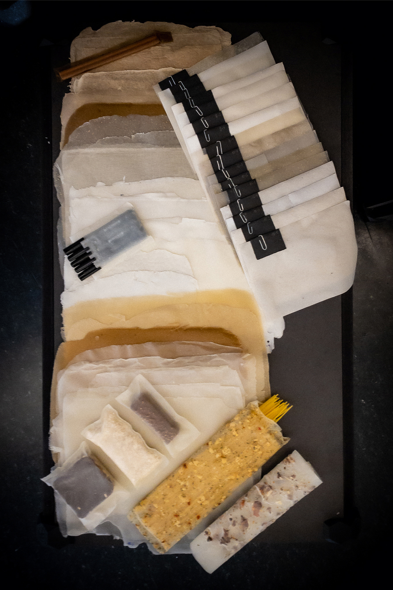 The Meal Bag is an edible food packaging. Its ingredients are similar to those of paper but are edible. It is airtight and to a certain extent resistant to moisture. In hot water the compound dissolves and can simply be added to meals. As one of its main ingredients is corn starch, it functions as a sauce thickener during cooking. Just like bread it is a supplier of fibre and energy. Therefore, the packaging becomes part of the food chain instead of a hazardous material. The material is edible, compostable, it weathers within a short period of time, it can be renewed and recycled. Therefore, plenty of possibilities to a closed cycle of materials are offered while at the same time being able to act spontaneously.