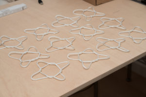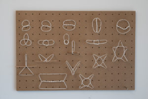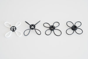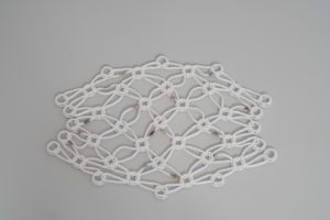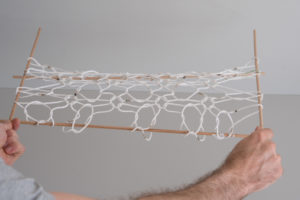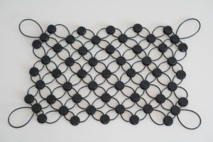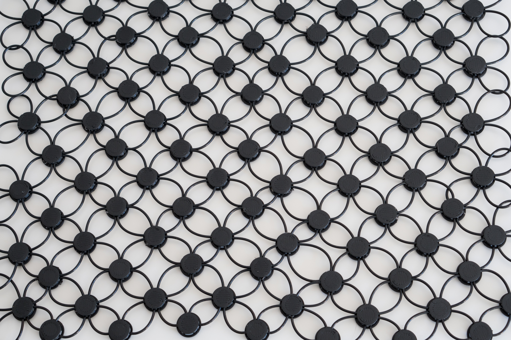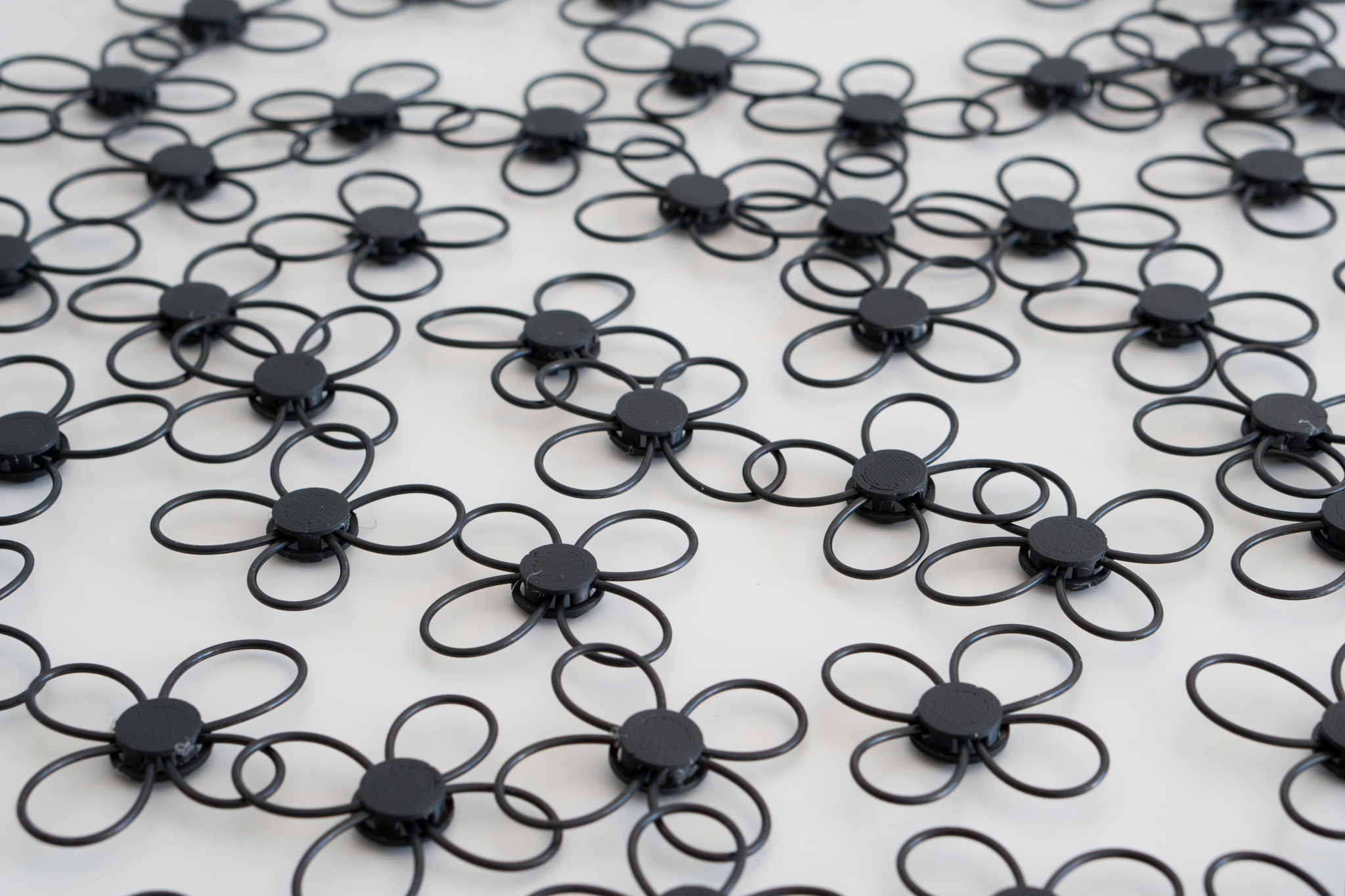 Ein Netz das aus der Verbindung der immer gleichen sich wiederholenden Elemente besteht. Jedes Einzelelement ist auf bestimmte Weisen verformbar, fähig auf Belastungen zu reagieren und diese gleichmäßig zu verteilen. So bildet das gesamte Netz kein starres Gitter mit fixen Verknüpfungspunkten. Es passt sich in der Verteilung seiner Knotenpunkte Spannungen und Belastungen an. Es bietet eine Flexibilität allein aufgrund der Topologie der Einzelelemente. Dies ermöglicht die Überspannung vielseitiger Geometrien ohne vorherige genaue Anpassung eines Zuschnitts. Wir nehmen trotz der mit der Beweglichkeit verbundenen Unregelmäßigkeiten ein klares, aber lebendiges Gitter war. Die vergleichsweise grobe Rasterung durch die zentralen Kunsstoffverbinder, machen sowohl die überspannten Flächen, also auch die Gitterstruktur lesbar.