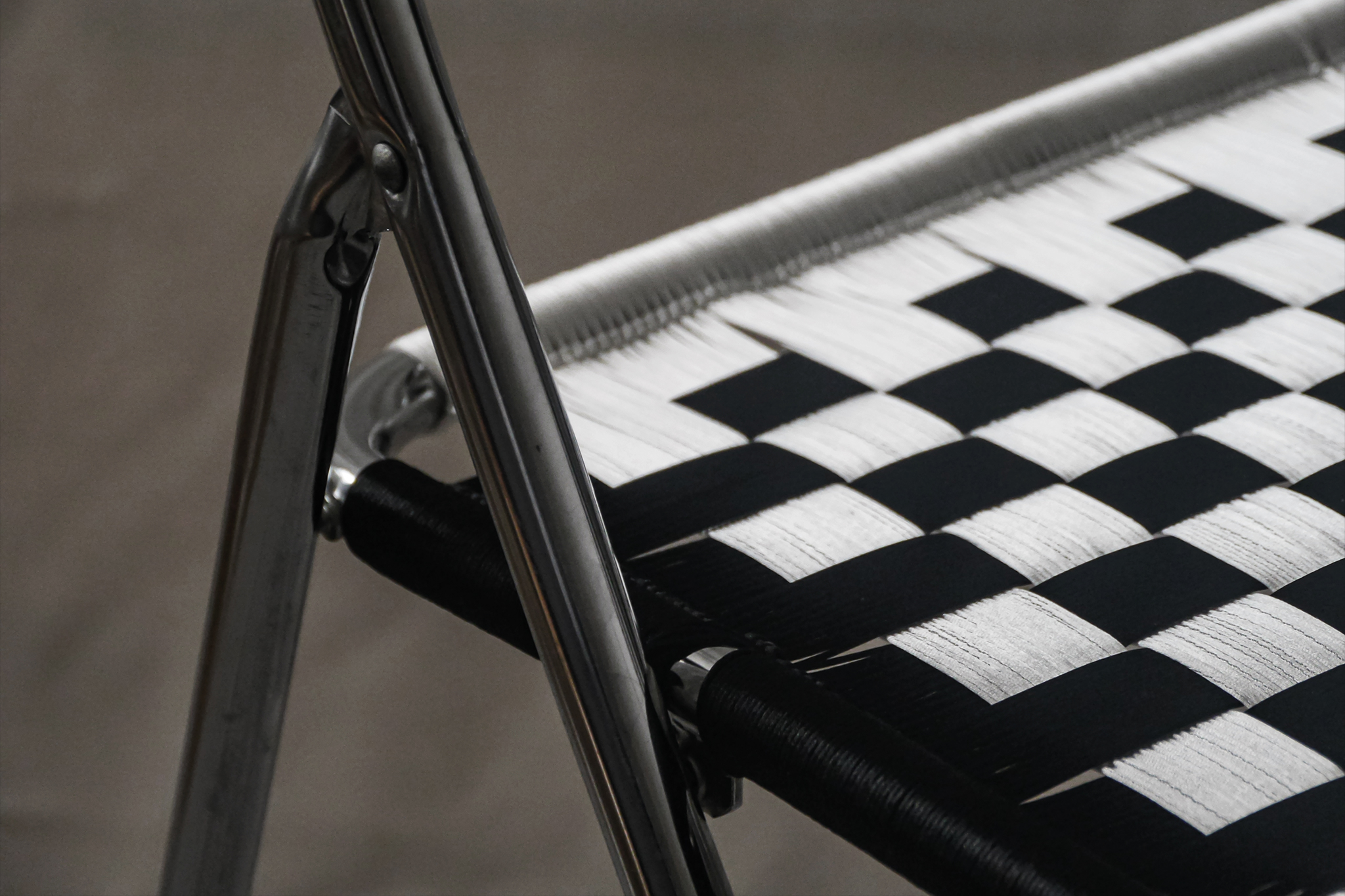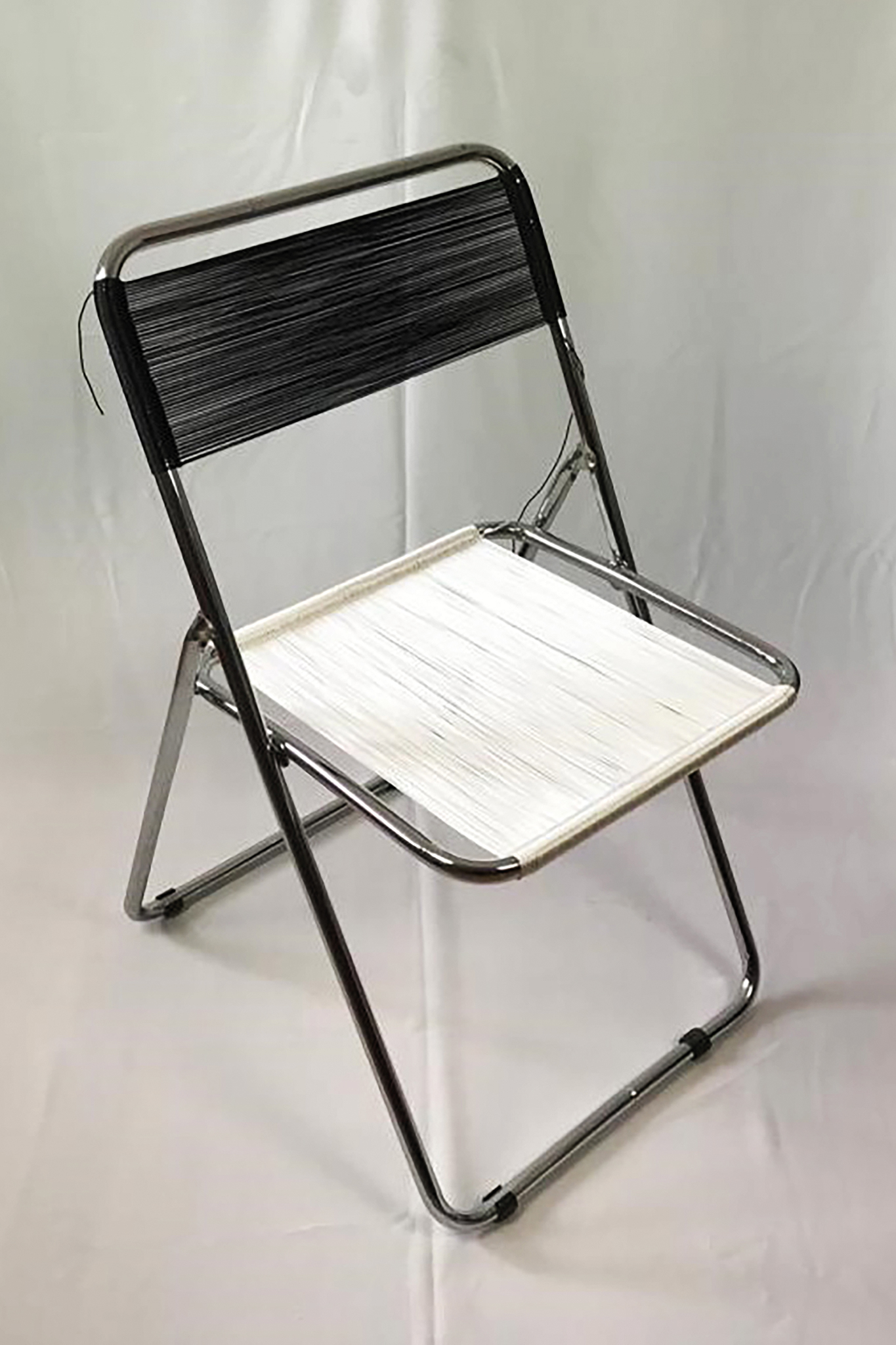 Often old chairs, whose seating is broken, get thrown away, even though the frame is still intact. I also have two of these broken chairs at home. Thats why i looked for a method to give them a new seating and make them usable again.„Re-string offers a way to create a robust surface out of a string.To restring a frame this way there are only a crocheting hook and two sticks required.The string is attached with a knot to one end of the frame. The thread is taken twice and pulled to the other side. The loop is wrapped around the frame and kept in place with one of the sticks. Every time the string gets to the other side of the frame, the old loop gets pulled trough the new one. In this way the string gets wrapped around the frame on both sides and a surface forms between them.With a second string the two remaining sides of the frame are stringed. During this part the second string gets weaved trough the already existing surface. That way varying patterns can be created. Furthermore the surface gets more stable, as the vertical strings support each other.With this method it is easily possible to give old chairs a new seating.