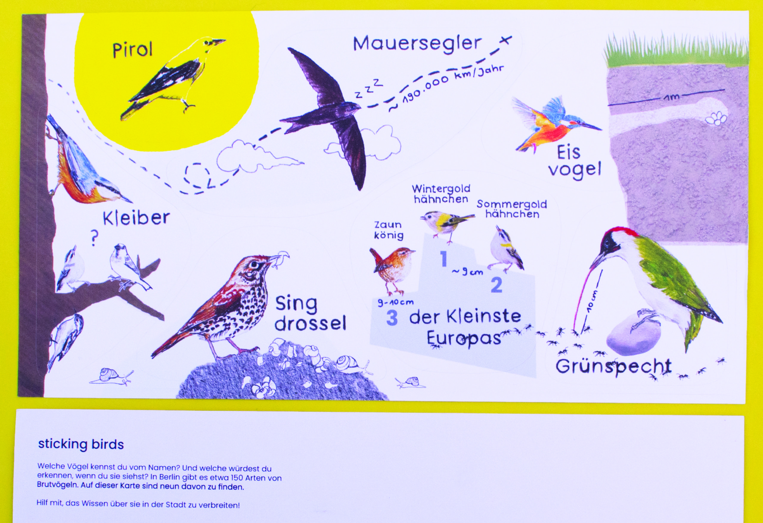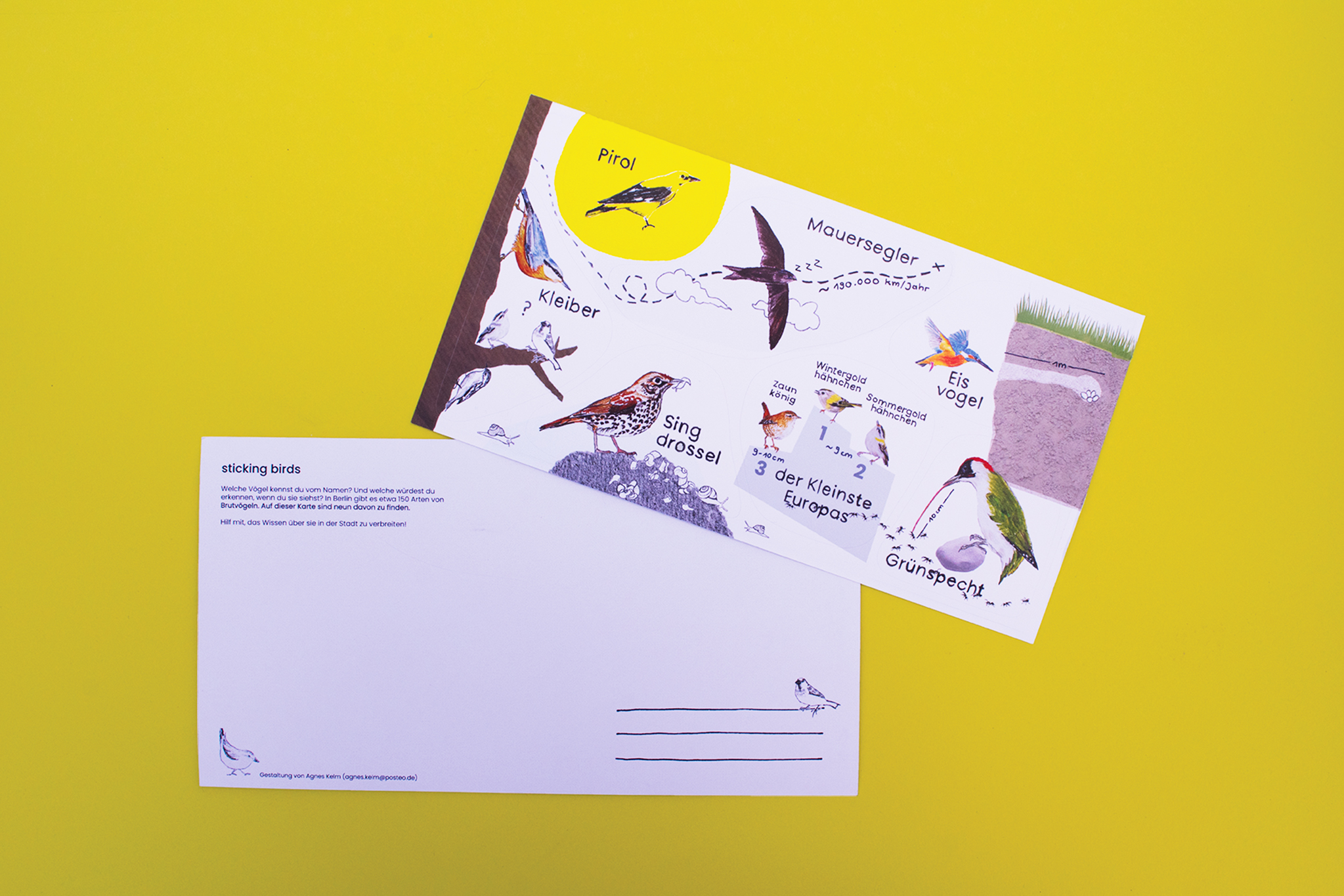 I want to offer birdwatching instead of advertising watching with Birds of Berlin. The Sticking Birds can be sent to a friend as a postcard and then sticked around in the city.