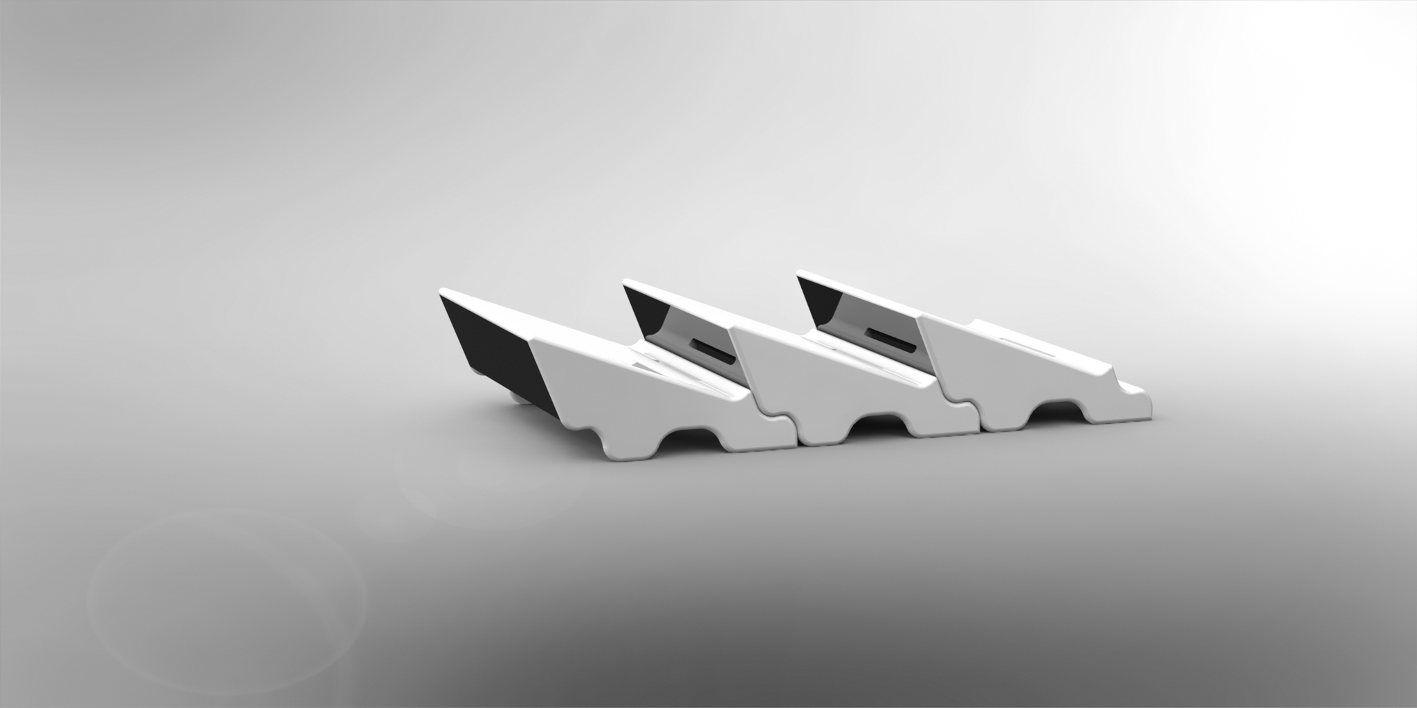 Brick 47° is made of ceramic, because this building material has a high stability, adds enough weight, offers freedom in color and shape design and has a balanced heat balance. Due to the special angle, the design is limited, because many other aspects had to be taken into account. The bricks are hollow and have a wall thickness of one centimeter. They overlap at the ends and interlock to provide protection from wind drifts.