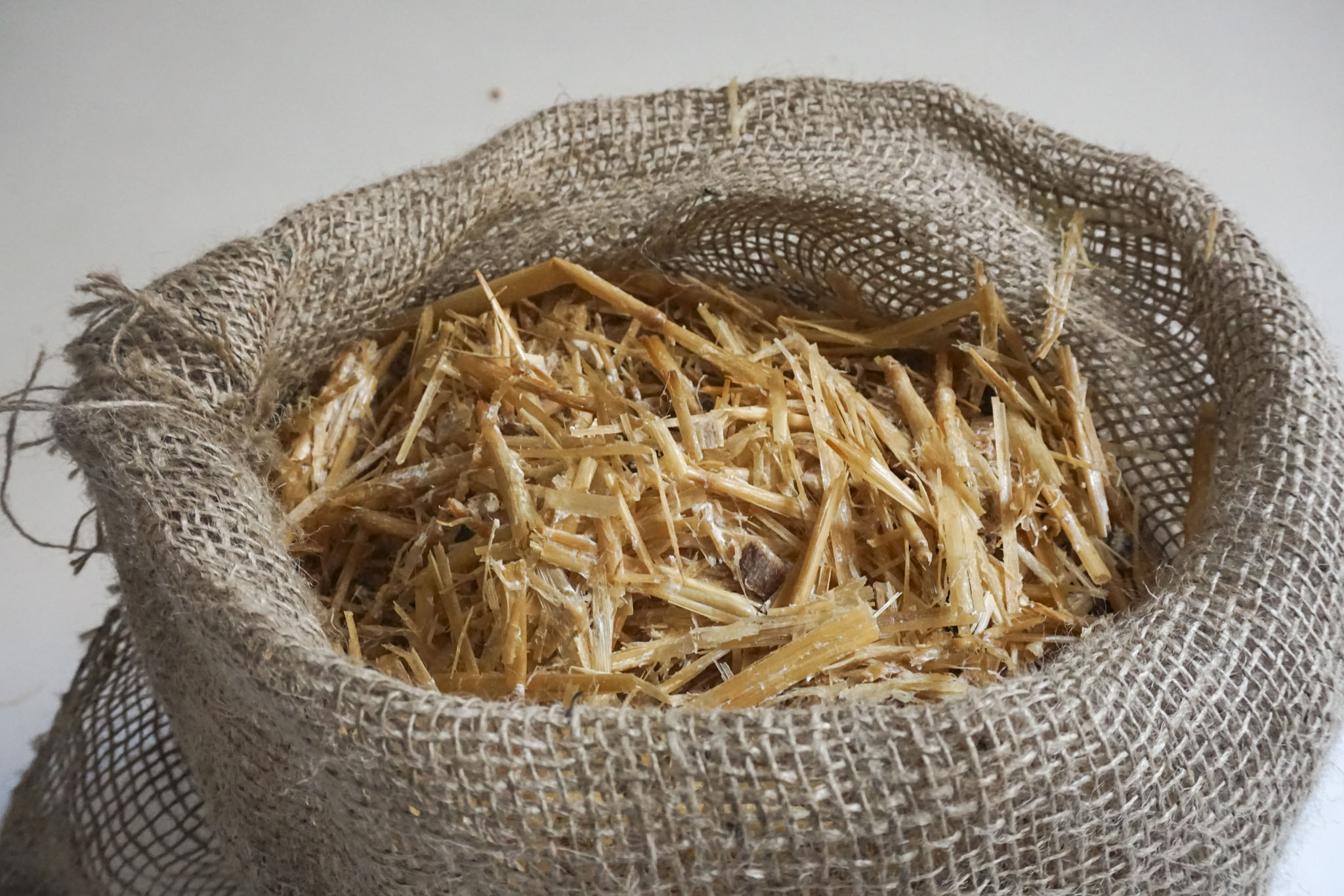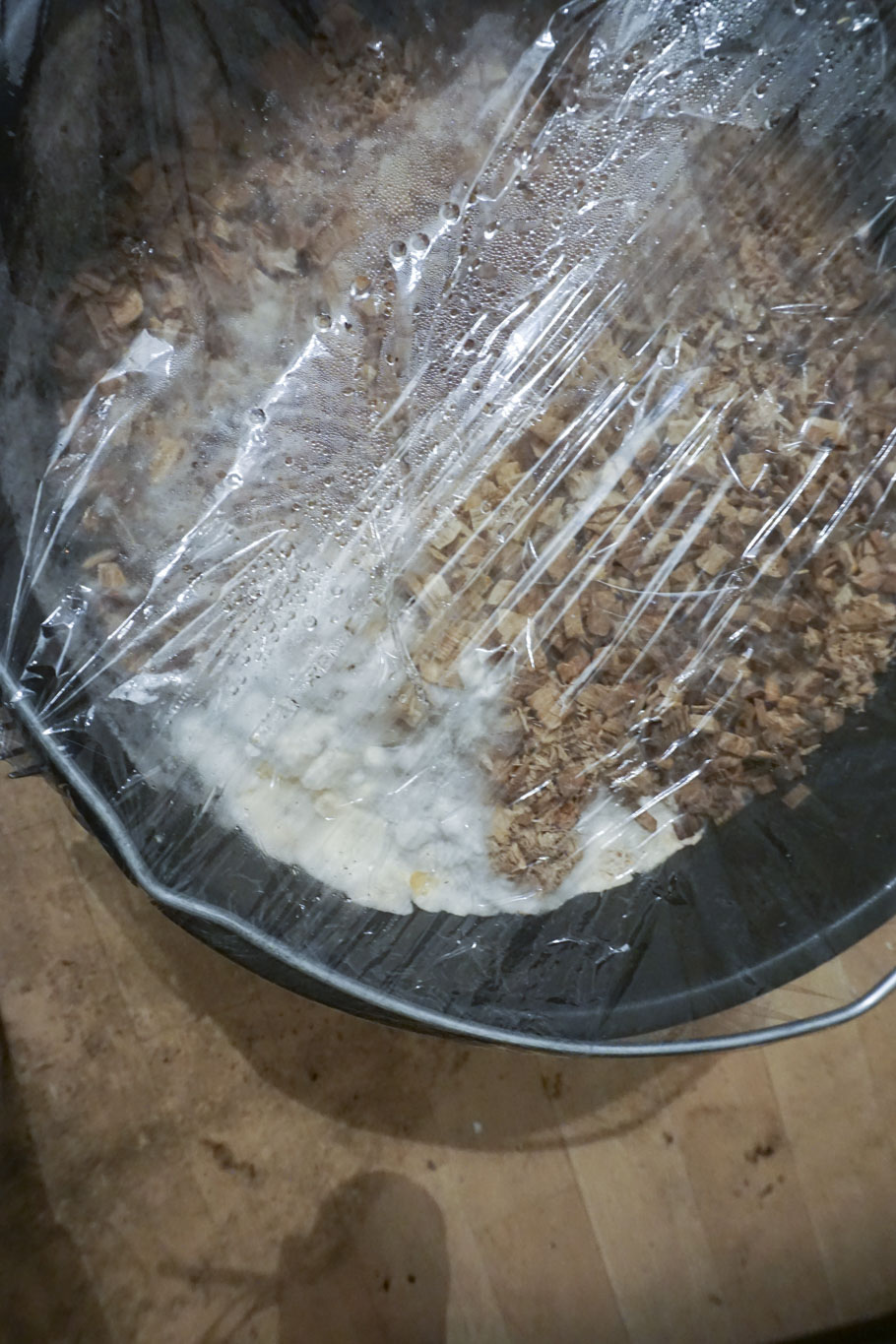 The burlap sacks, filled with substrate and oyster mycelium, are placed into the muddbuckets beneath the drainage, that are cleaned by the BSR.