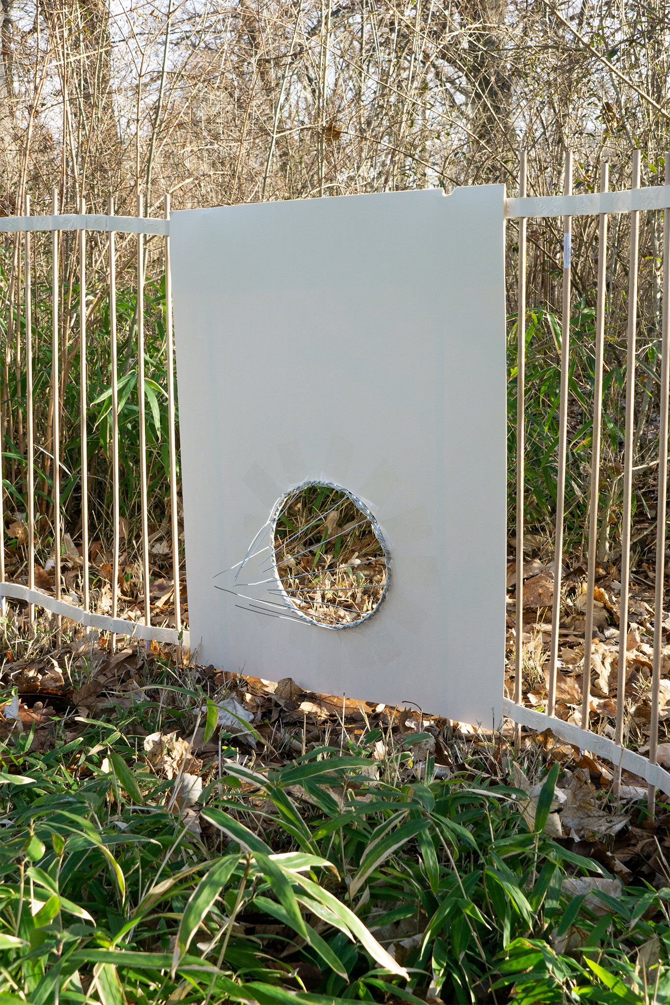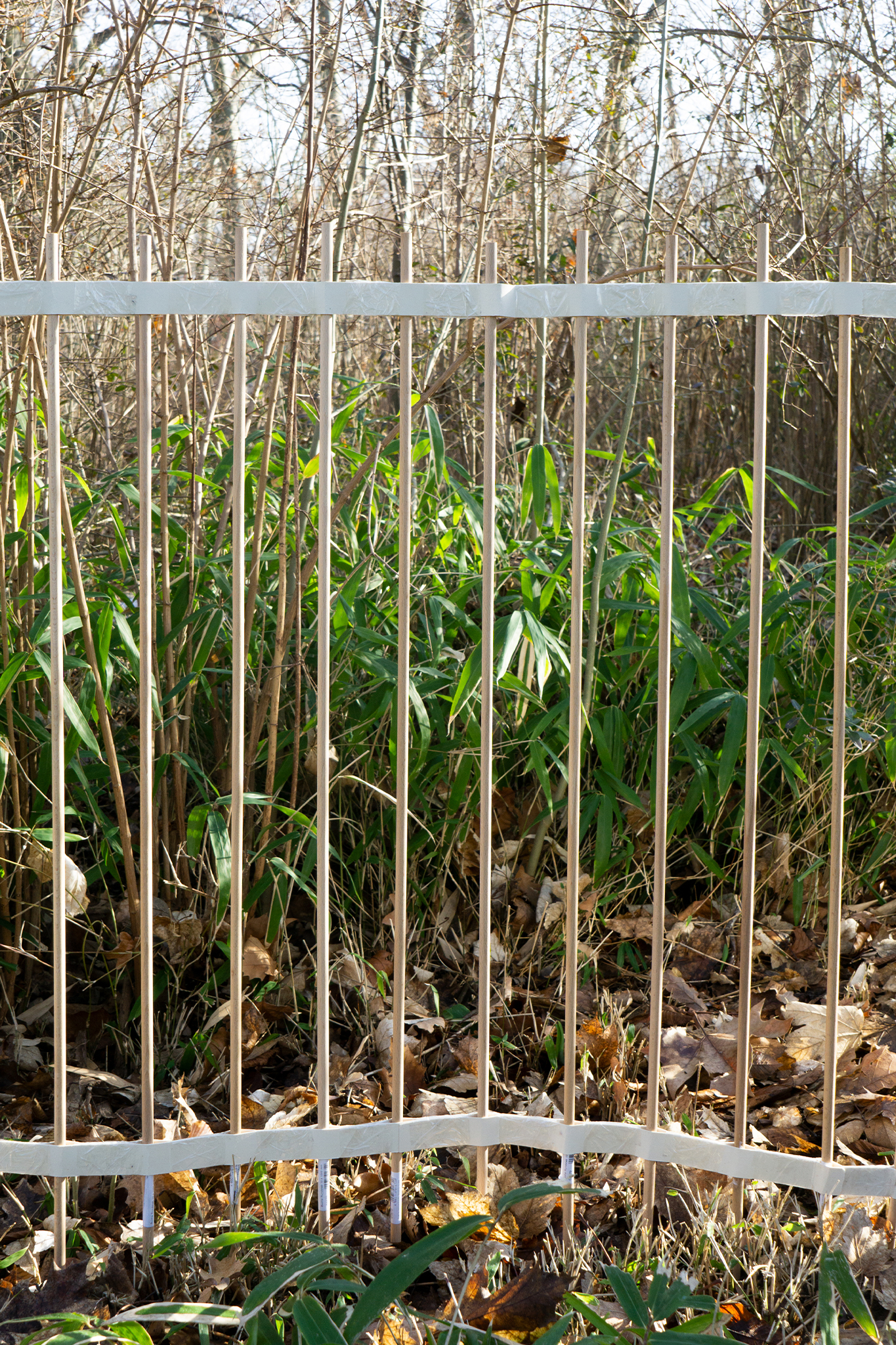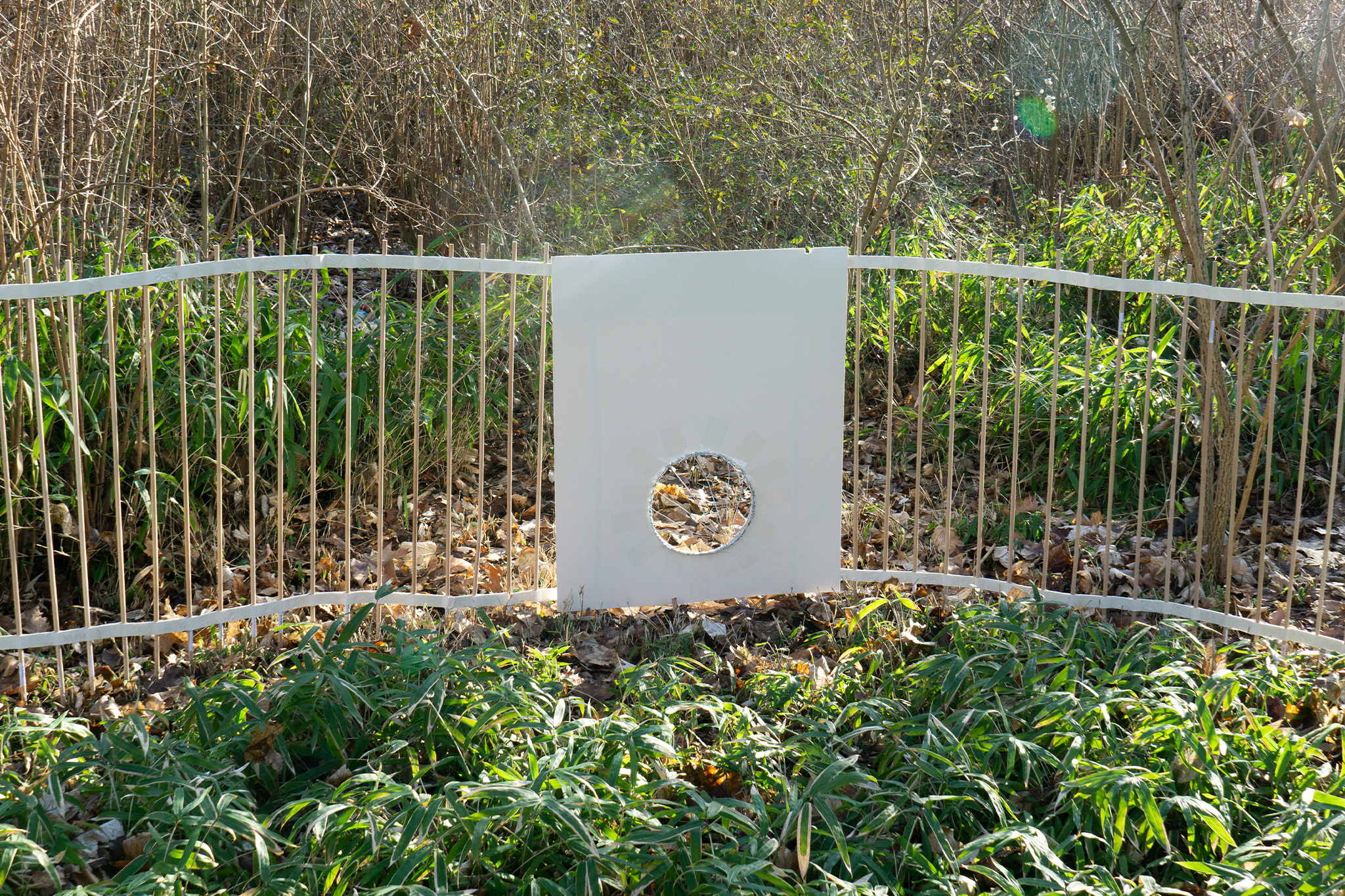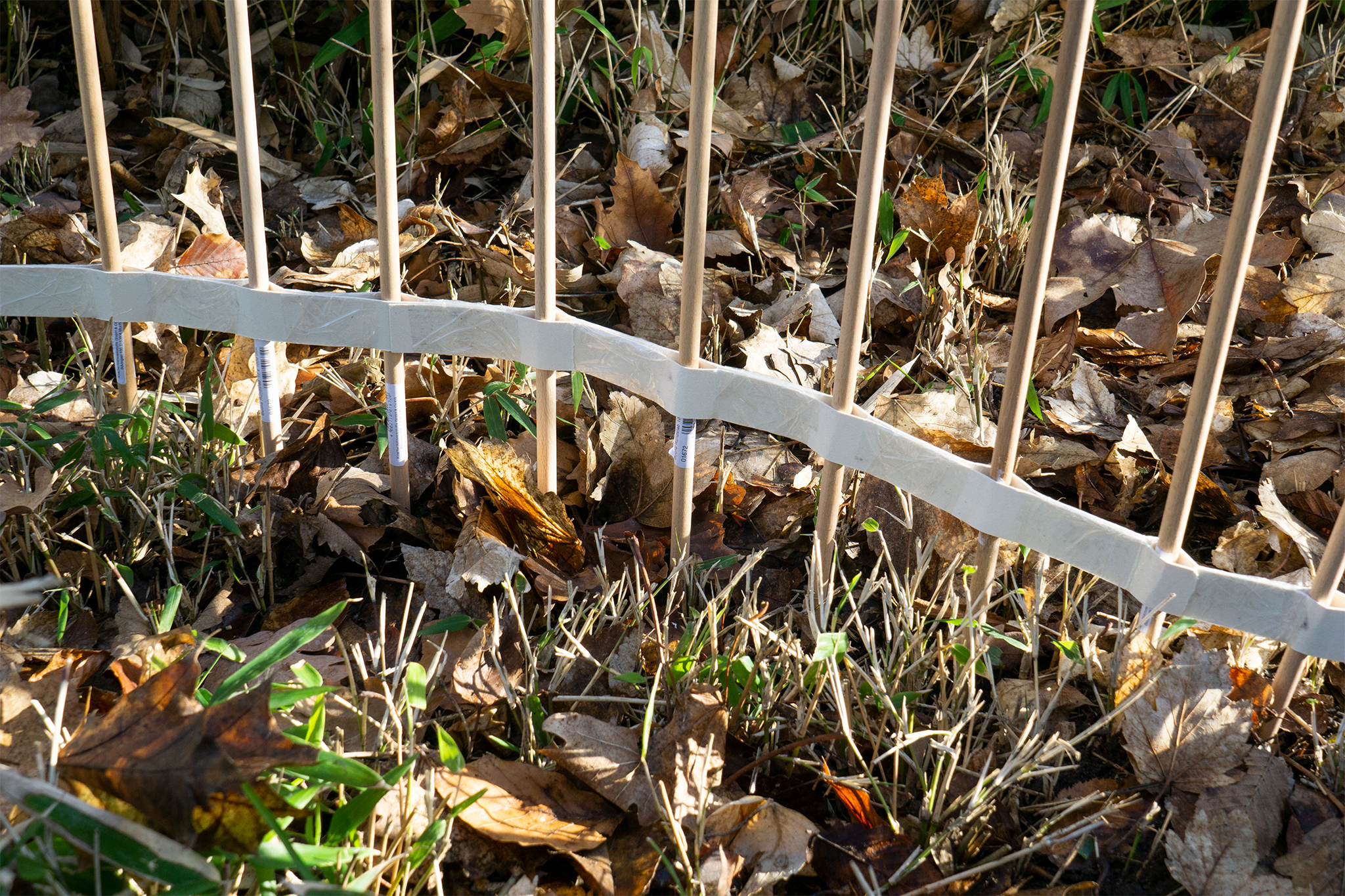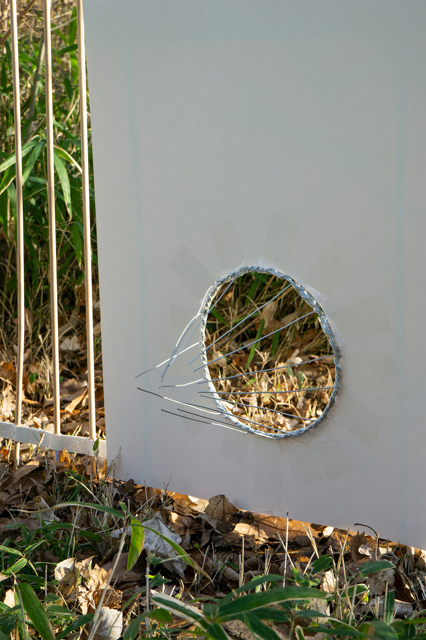 The full scale model of the fence to capture the raccoon together with an entry piece set up in the garden