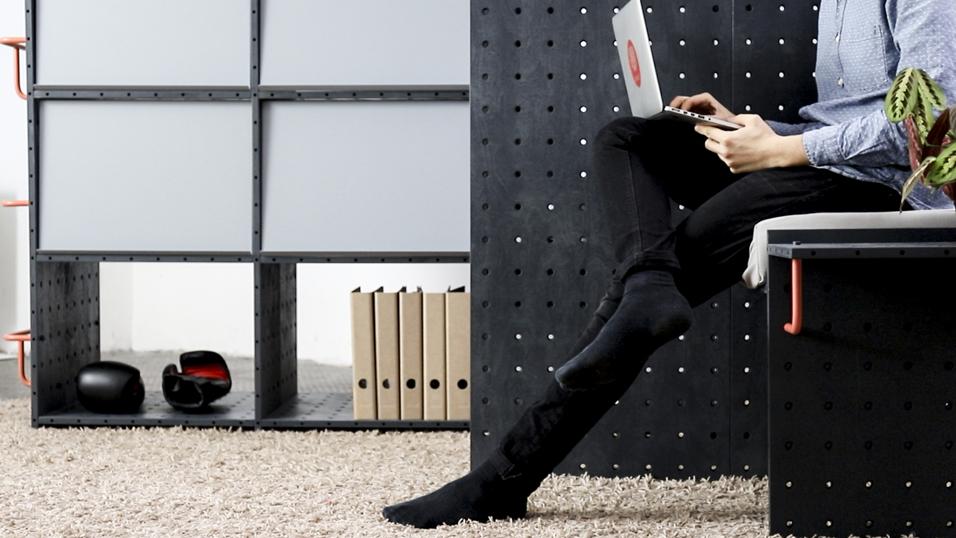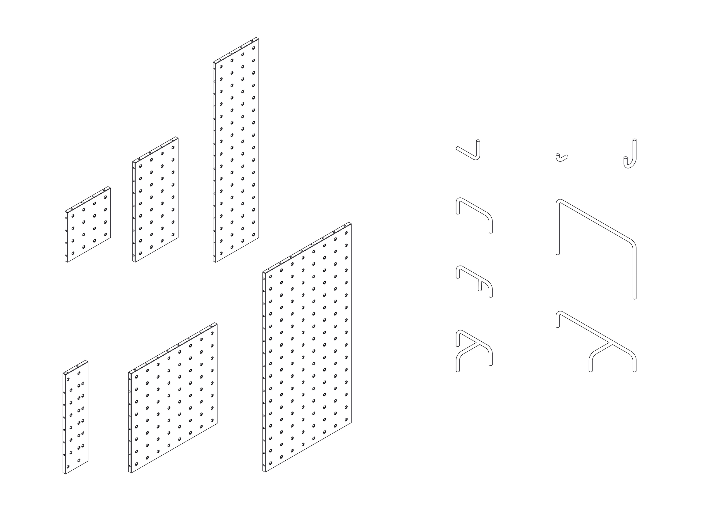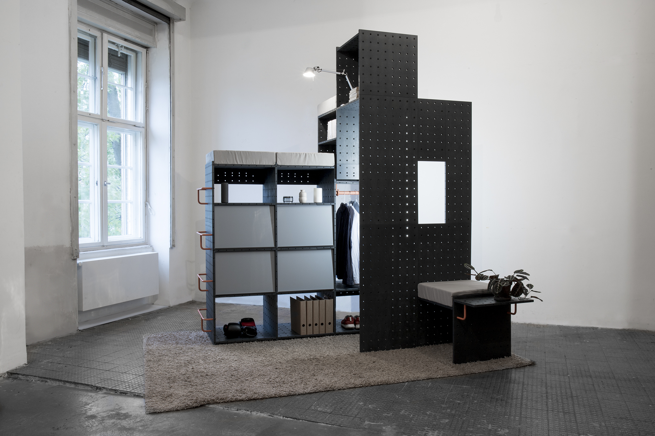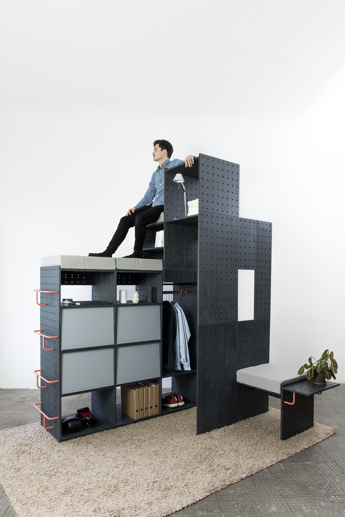 Nach einfachen Konstruktionsprinzipien lassen sich simple oder komplexe Strukturen bilden, die in Höhe, Breite und Tiefe frei erweiterbar sind. Sechs verschiedene Plattenformate und spezielle Verbinder bilden die Grundelemente, um in jedem Raum individuelle Strukturen zur Aufbewahrung, Tätigkeitsinseln, Spielplätze, Rückzugsbereiche oder Raumteiler zu integrieren. Alle Entscheidungen sind dabei reversibel und das System immer wieder in neuen Szenarien verwendbar.