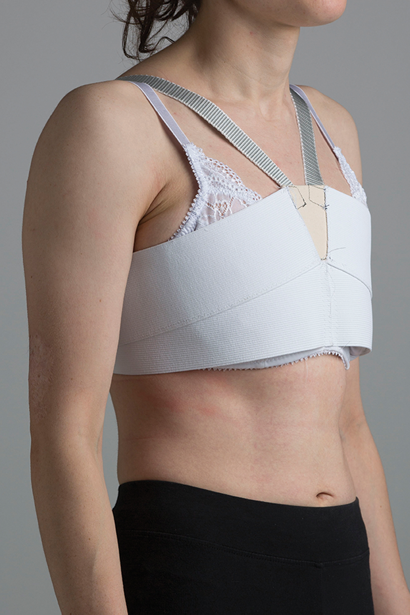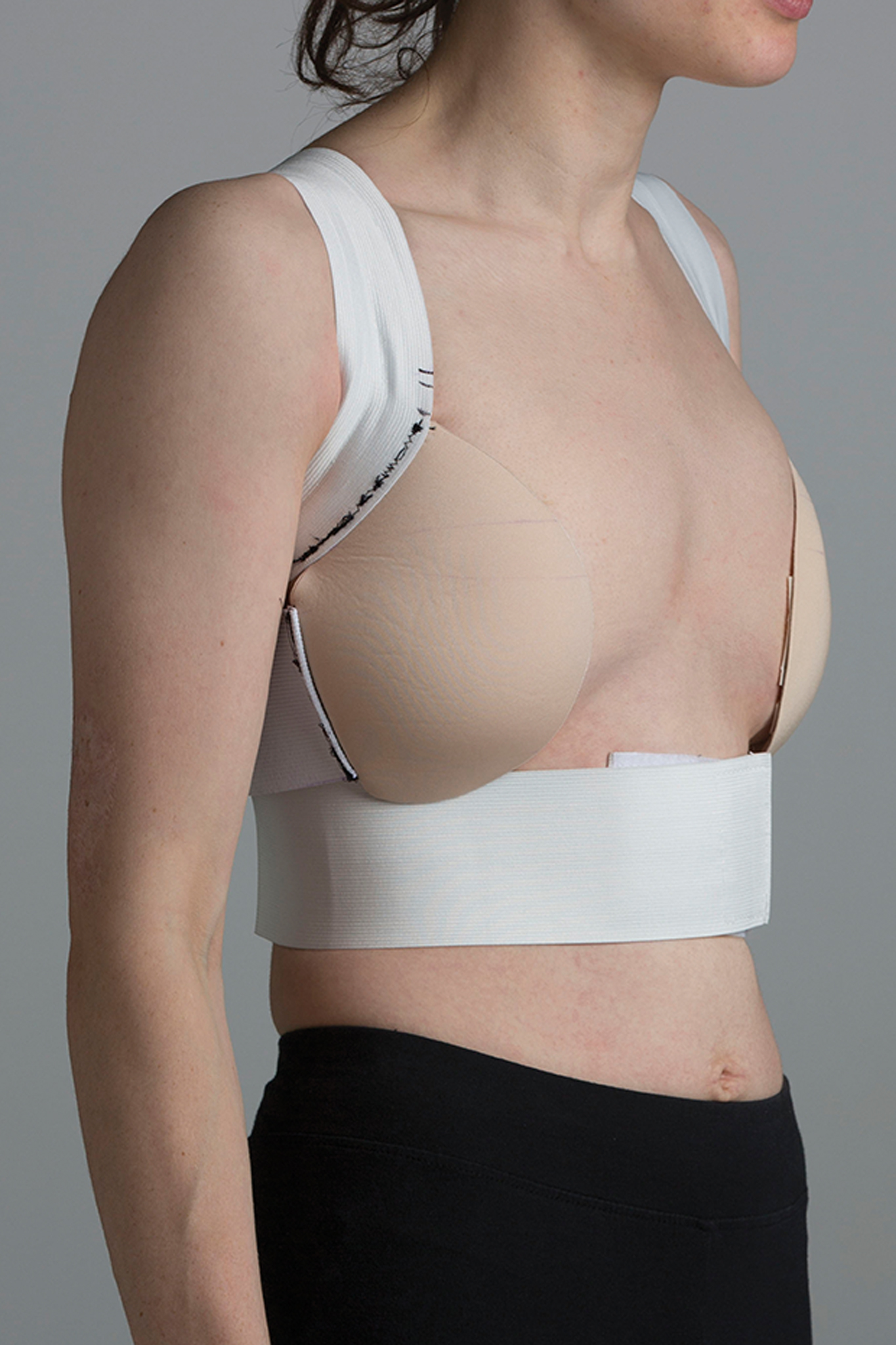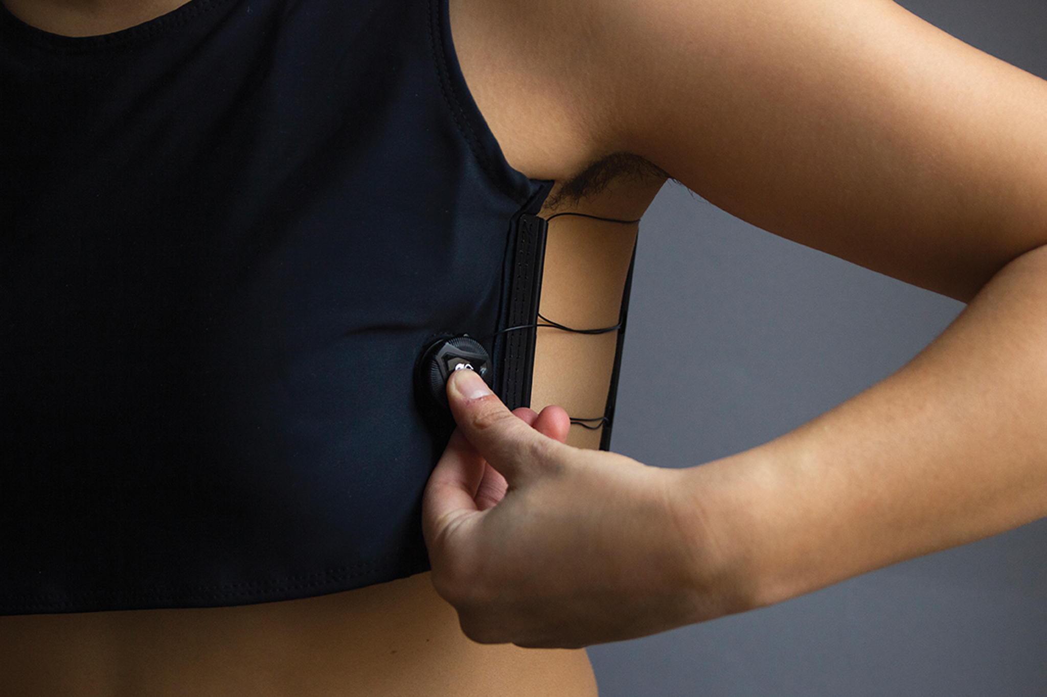 „Transitioning“ (eng. Übergehen) bezeichnet den Prozess, den trans* Personen durchgehen um ihr Leben sozial, körperlich und/oder juristisch ihrer Geschlechtsidentität anzugleichen. Ziel des Projekts „Trans*itions“ war es zu erforschen, wie man Menschen dabei designtechnisch unterstützen und ihren Alltag angenehmer gestalten kann. Der Boa Binder ist aus Beobachtungen zu Praktiken entstanden, die trans* Menschen dabei helfen ihr Aussehen ohne invasive Maßnahmen wie Operationen geschlechtsspezifisch anzupassen. Brustbinden ist eine der gängigsten Interventionen bei transmaskulinen und nichtbinären Personen. Dabei wird störendes Gewebe mithilfe von Tape, Bandagen oder Kompressionsoberteilen an den Körper gedrückt, um ein flacheres Brustprofil zu erzeugen. Der konstante Druck auf den Brustkorb führt über längere Zeit leider bei den meisten zu Atemnot, Schmerzen, Überhitzung oder Hautirritationen. Zwar gibt es inoffizielle Regeln, um solche Nebenwirkungen zu vermeiden, diese werden allerdings oft ignoriert, da der positive psychische Effekt so schwer wiegt. Genau hier setzt die Idee des Boa Binders an. Der Einstellmechanismus an beiden Seiten ermöglicht es, den Druck je nach Aktivität und Tagesform zu variieren und eine optimale Passform zu finden. Durch das Quick-Release-Feature können Atempausen eingelegt werden und das An- und Ausziehen wird erleichtert. Vor allem hat die Benutzung des Boa Fit Systems einen symbolischen Wert. Die Marke ist für ihren Einsatz bei hochwertigen Sport- und Medizinprodukten bekannt. Der Entwurf stellt sich eine Kooperation mit einem etablierten Binderhersteller wie Underworks oder GC2B vor. So eine Zusammenarbeit würde nicht nur eine enorme Sichtbarkeit für Transgender Themen generieren, sondern auch zur Legitimierung von Bindern als Hilfsmittel beitragen, die dann vielleicht zukünftig auch durch Krankenkassen verfügbar gemacht werden könnten.