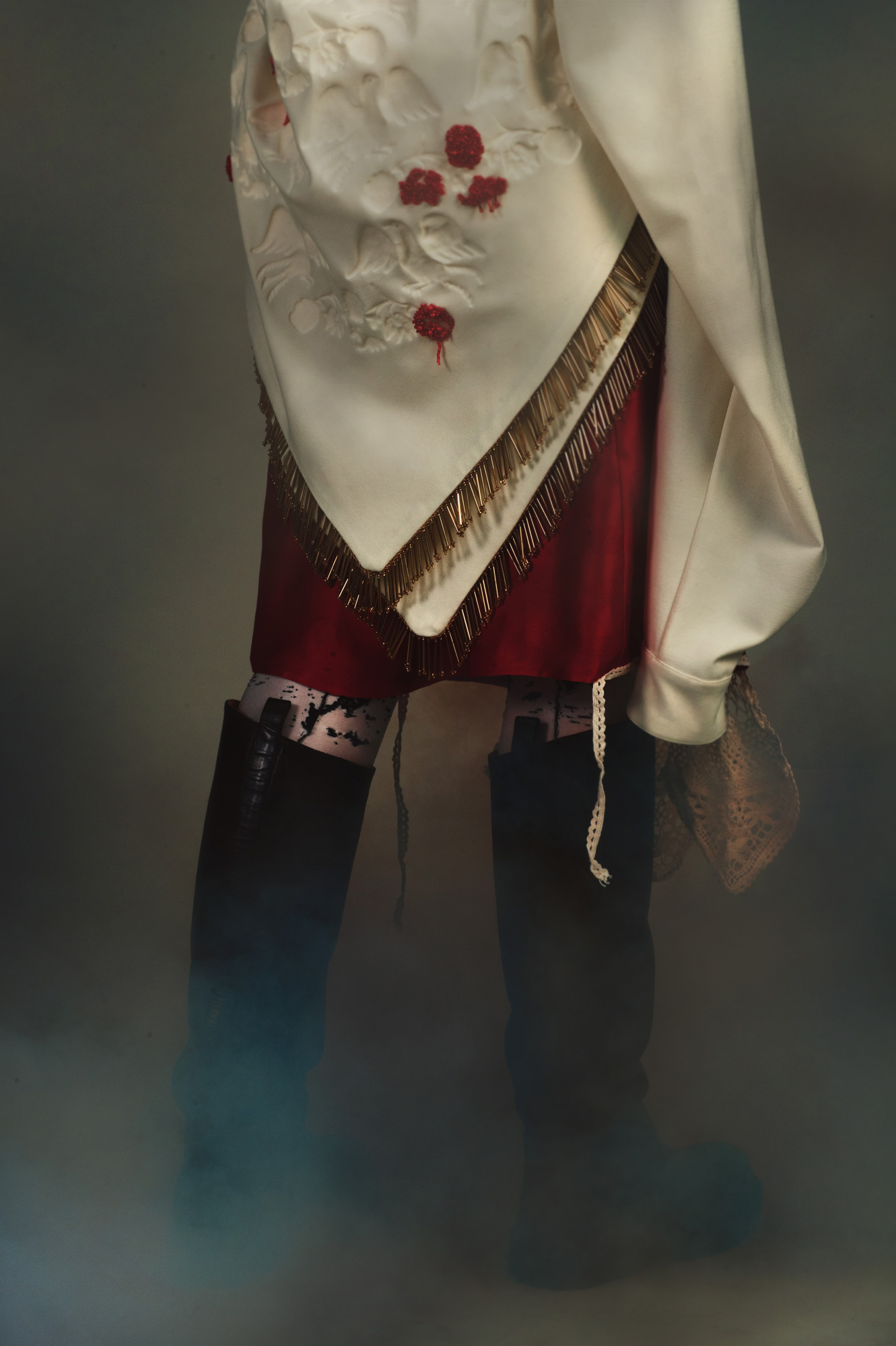 The clothes are a translation of the traumas of absent men, the socialist regime, the war and the post soviet disappointment. They make references to Naum Korzhavins poetry („столетье промчалось. И снова, как в тот незапамятнный год- коня на скаку остановит, в горящую избу войдёт. (..) Но кони всё скачут и скачут. А избы – горят и горят.“ Rus. „…A century flew by. And once again,/ As in that time immemorial/ She’ll stop a horse in mid-gallop,/Enter a burning hut. (..) /But the horses keep galloping./And the huts keep burning.“) and Svetlana Alexejevitch books (f.e. „Der Krieg hat kein weibliches Gesicht“). They are mostly in red and white colours to reference to the original Belarusian flag.