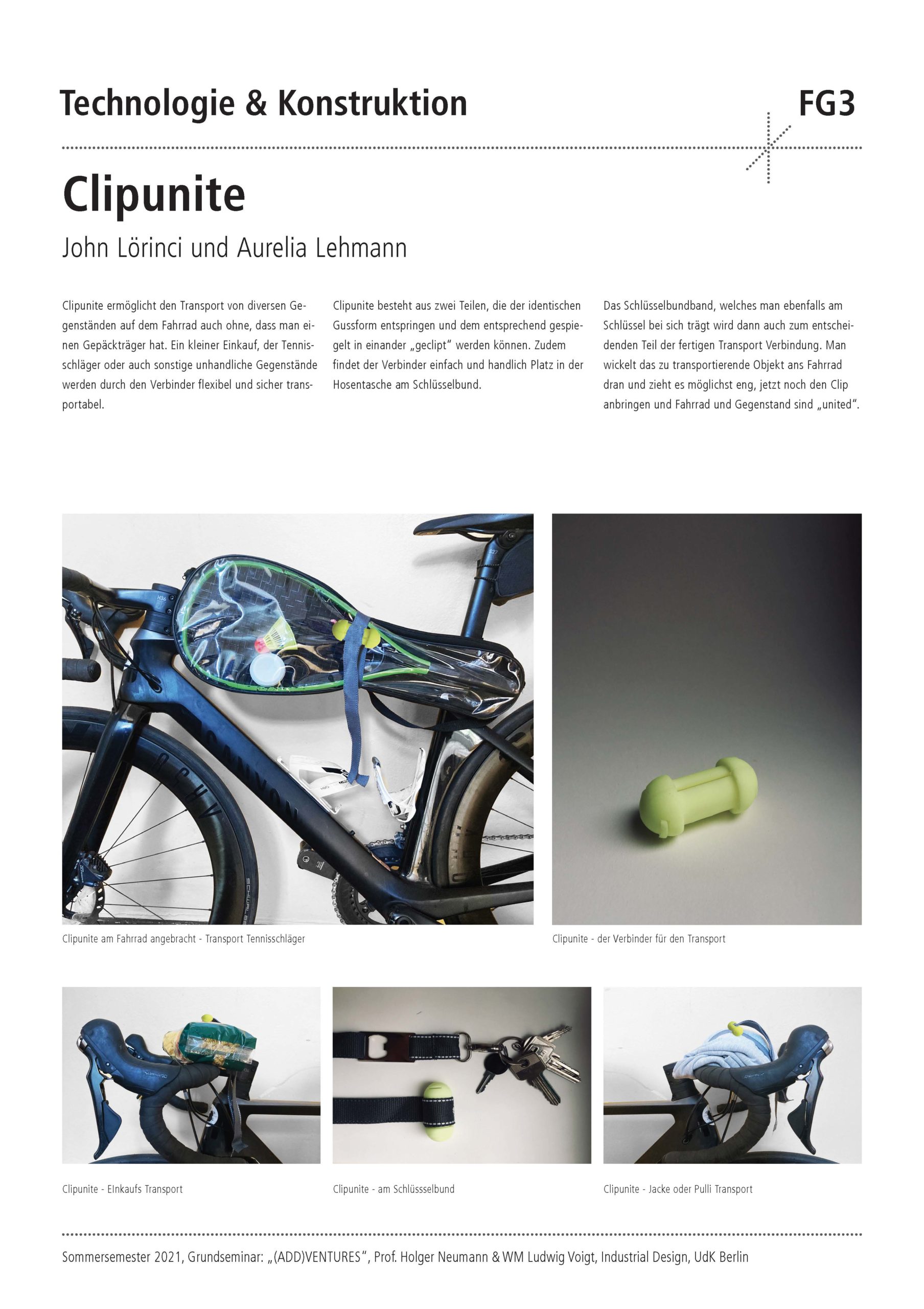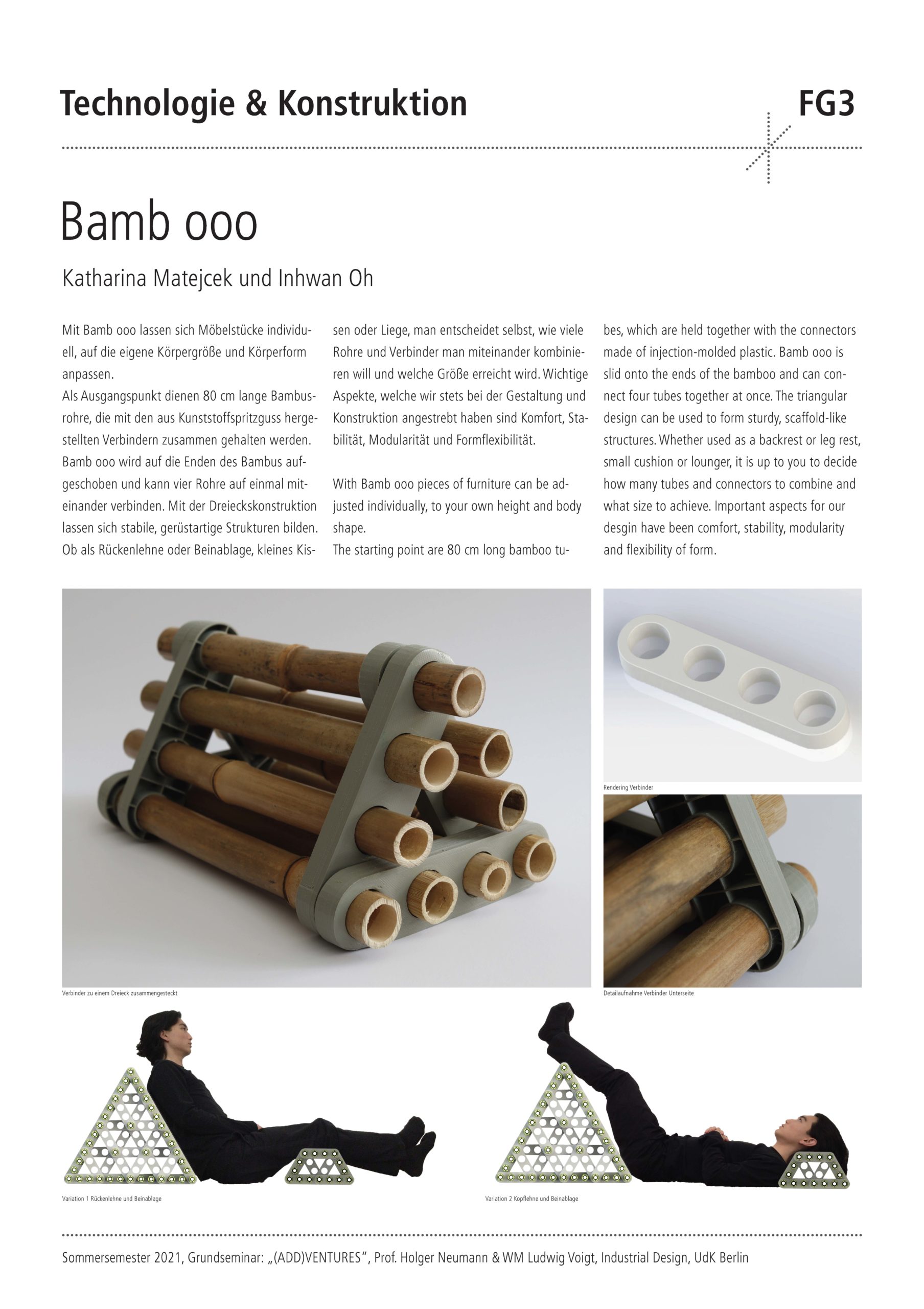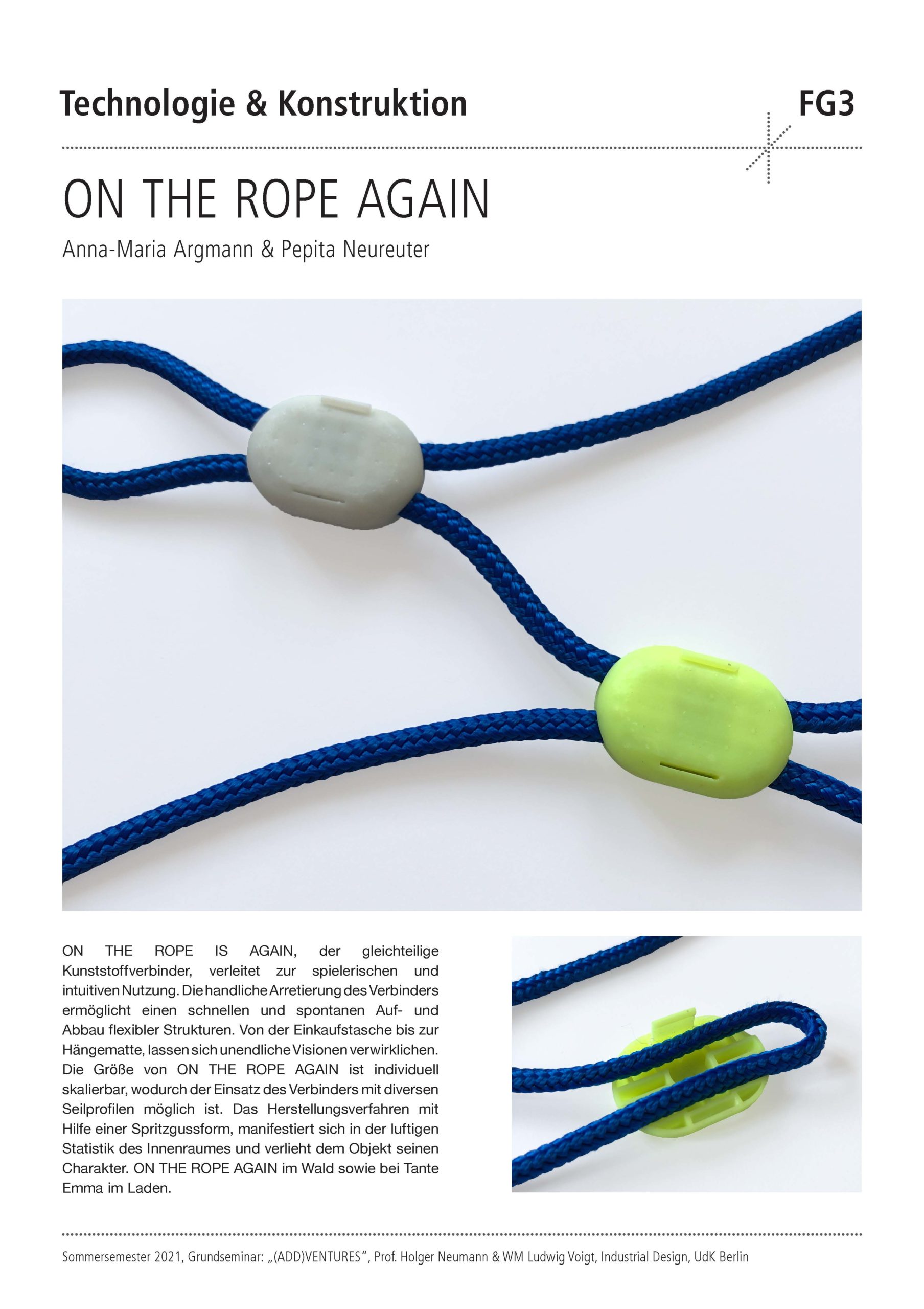 Die Semester-Aufgabe für die Studierenden war der Entwurf, die Konstruktion und der Prototypenbau eines Kunststoff-Verbinders. Dieser soll es mit sehr wenig Materialeinsatz ermöglichen, wandelbare und erweiterbare Objekte zu erschaffen. Der Verbinder dient als intelligenter Connector mit dessen Hilfe Halbzeuge wie Stäbe, Seile oder Platten zu interessanten und neuartigen Objekten kombiniert werden können. Wesentlicher Bestandteil des Design-Technologie Seminars war zudem die umfangreiche Aneignung theoretischen Wissens über Kunststoffe und die Herstellungstechnik „Kunststoffspritzguss“. Spezielle Software-Module wurden erlernt und dazu genutzt, die Simulation eines 2-teiligen Spritzgusswerkzeugs zu erstellen.
