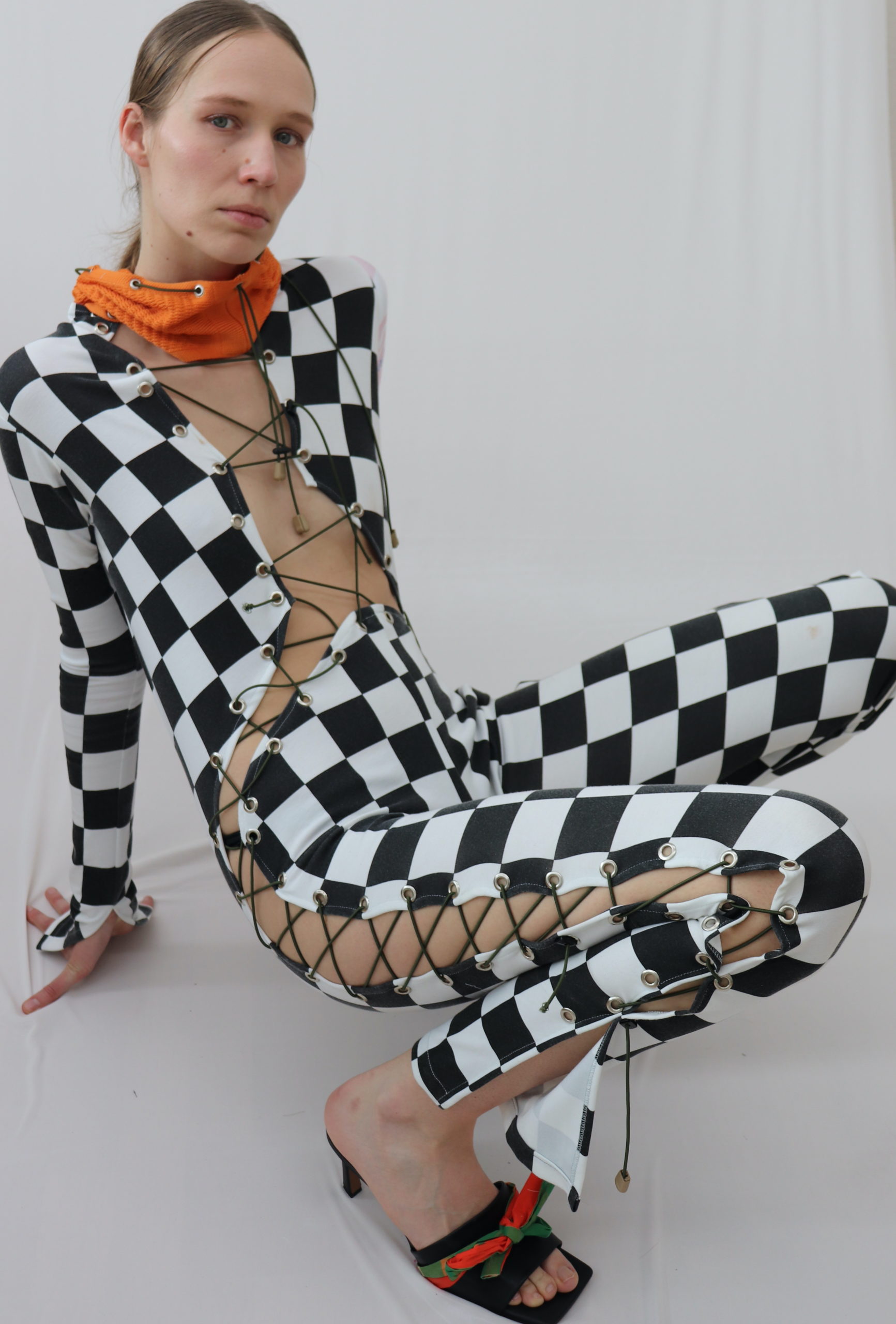 Die Wahl unserer Kleidung reproduziert nicht nur Geschlechtsidentität, sondern Mode selbst bewegt sich in einem binären System. Bestimmte weibliche Kleidungsstücke sind so konstruiert, dass sie laut Diane Crane ein Indikator für den Raum sind, den eine Frau im Gegensatz zum Mann einnehmen darf: „Women, as a consequence of their inferior status, are expected to occupy less space than men. This is seen in the expectation that clothing should be neat and well put together. Women’s legs are supposed to be closed rather than apart and arms should be close to the sides of the body.“ Nähte, Schnitte, Passform und Material haben eine direkte Auswirkung auf die Darstellung des Körpers und auf körperlichen Erfahrungen, wie beispielsweise Bewegungsmuster. Kleidung wird weitestgehend als statisches Produkt für Konsument:innen hergestellt, bei denen der Körper sich in erster Linie nach der Kleidung richten soll. Verändern sich körperliche Attribute, verändert sich die Kleidung nicht automatisch mit uns. Unter diesen Beweggründen liegt die Auseinandersetzung des Entwurfs auf performative Designansätzen als Methode, mit der Modedesign als etwas verstanden werden kann, die nicht nur Objekte, sondern auch Einstellungen und Kontexte umfasst, in denen sich Körper bewegen. Ein Schwerpunkt der Arbeit liegt darin, die Reproduktion von Körpern in der Mode zu beleuchten und neue Handlungsmöglichkeiten zu erforschen.
