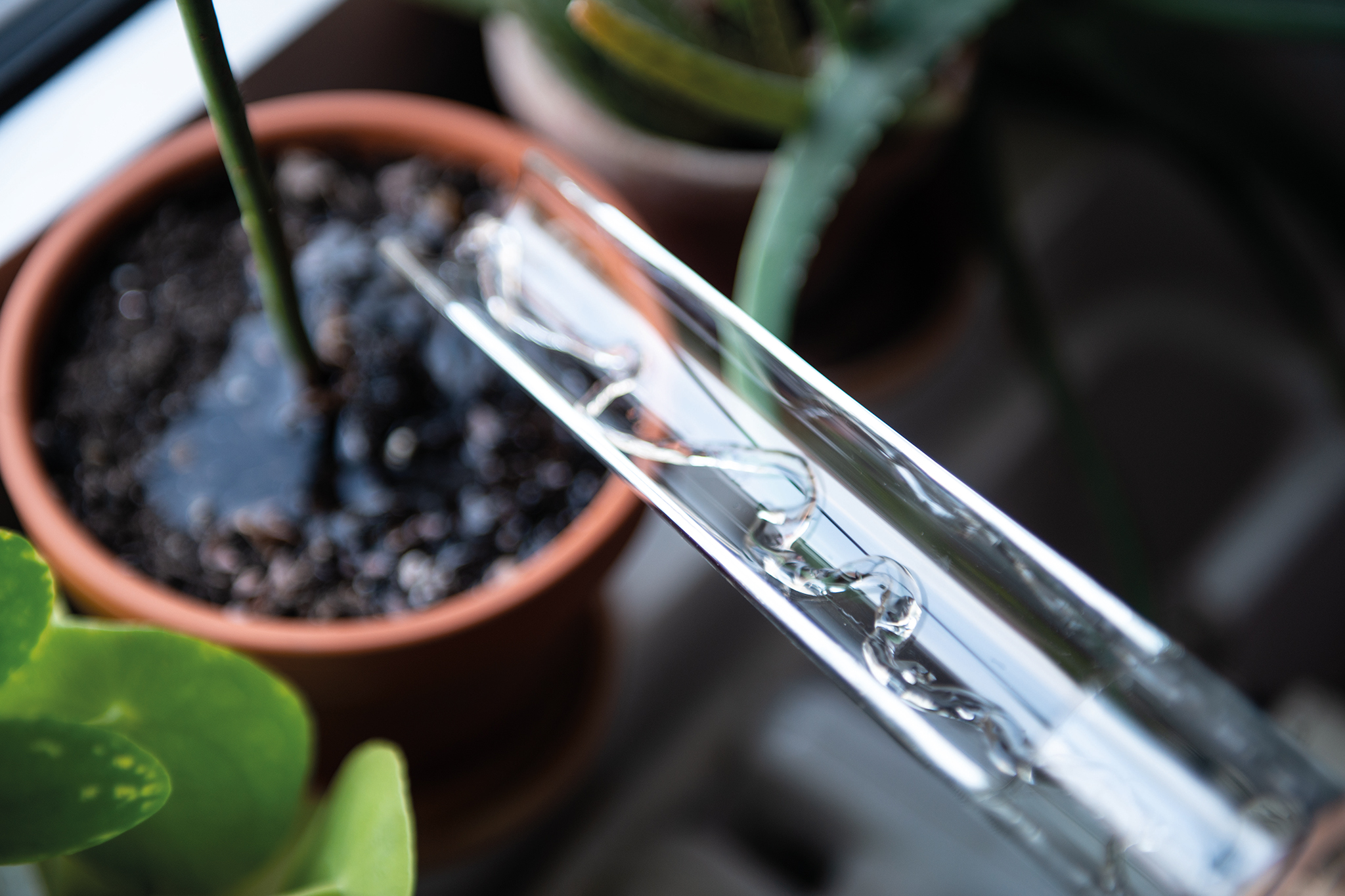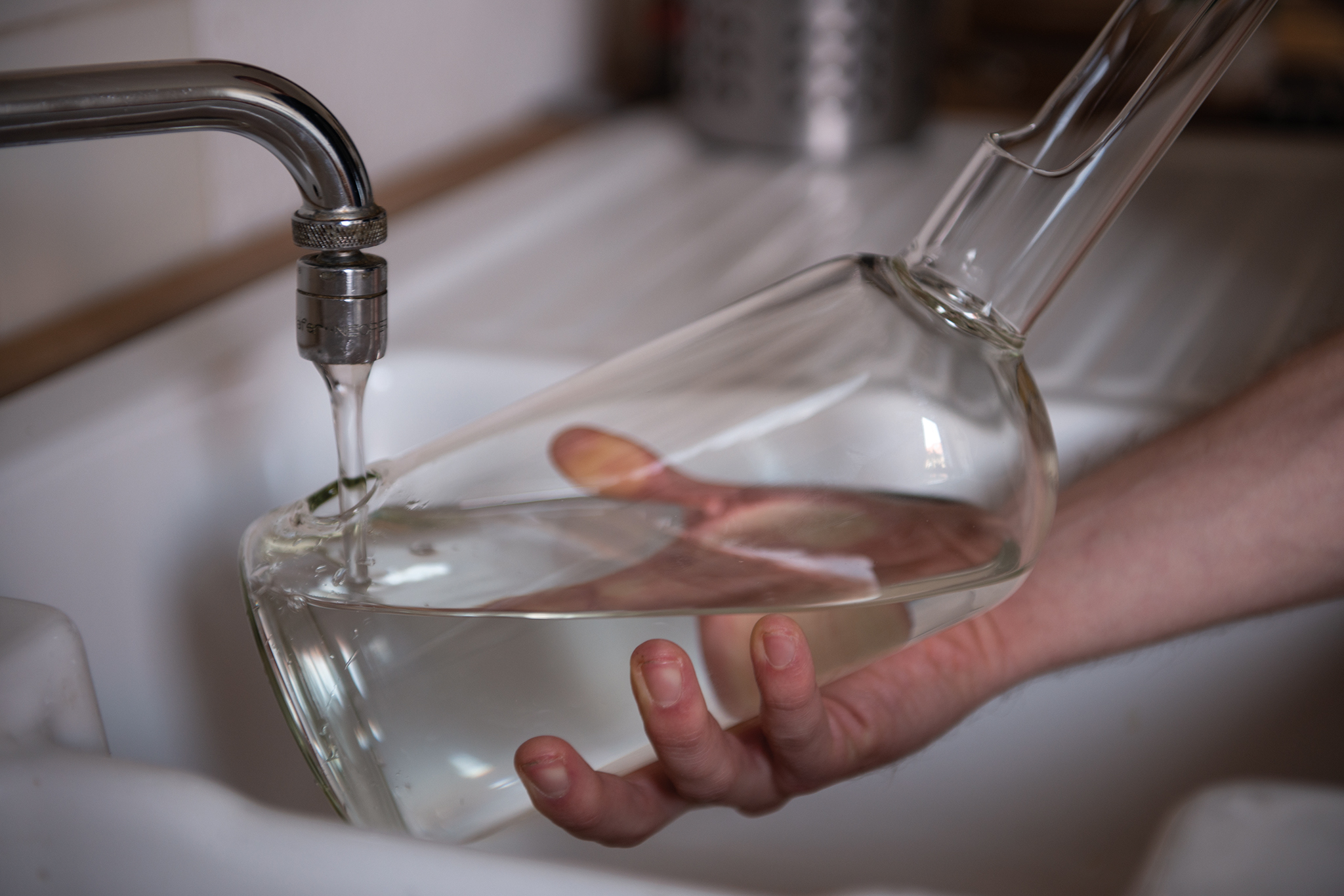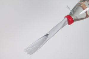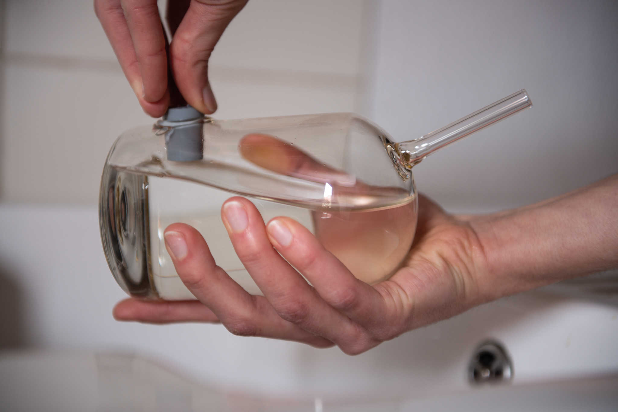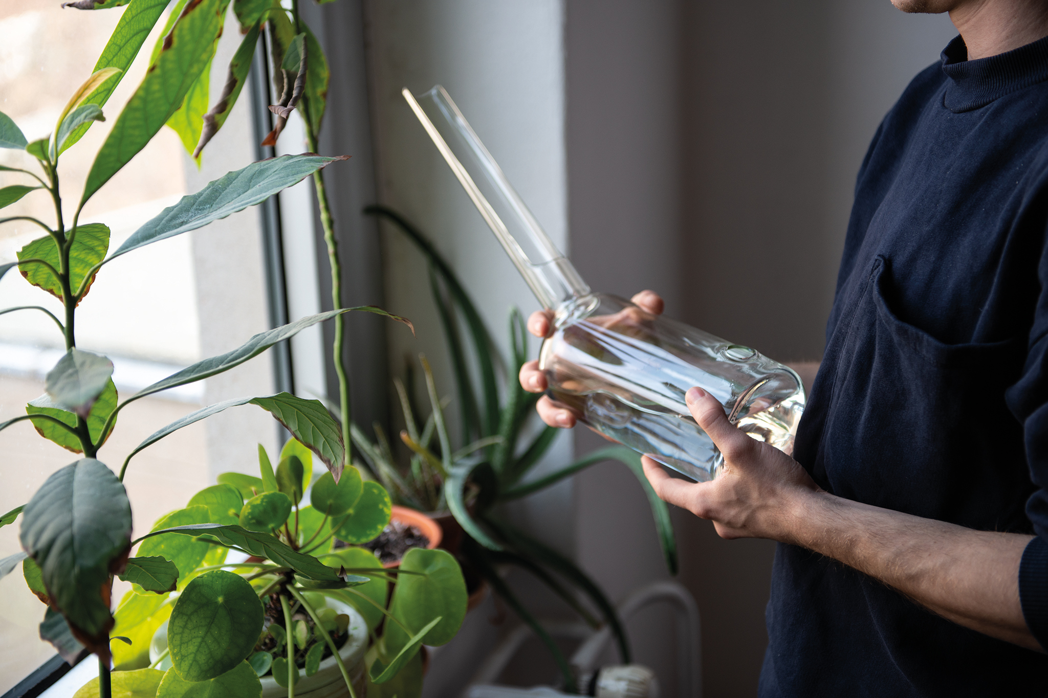 Das Wasser muss sich seinen Weg durch den Ausguss der Kannen bahnen. Das geht nicht so direkt wie bei einer herkömmlichen Gießkanne. Es nimmt einen Umweg, aber einen ästhetischen, denn es entstehen Schlangenlinien und Luftblasen, die man betrachten kann während man steht und innehält. Befüllen muss man die Kannen langsam und auch der Weg vom Wasserhahn zur Pflanze ist am besten vorsichtig. Die Materialität unterstützt die bewusste und konzentrierte Handhabung.