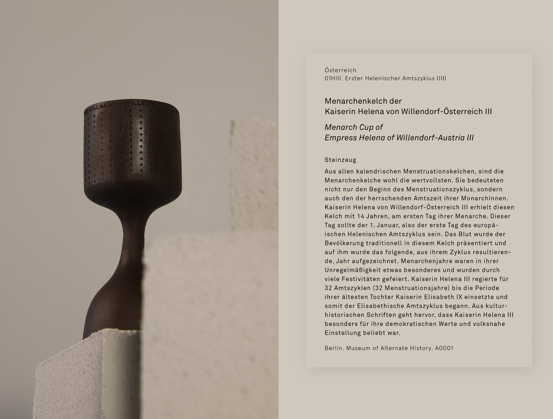 The Museum of Alternate History combines feminist and gender theories with a speculative design approach in the alternate history scenario of a European matriarchy. In doing so it comments on the the strict patriarchal divide of bodies into two genders and the submission and regulation of female and non-heteronormative bodies in our society. Six objects and their descriptive texts transform critical though into materiality and – quite literally – open up the room for discussion and reflection.