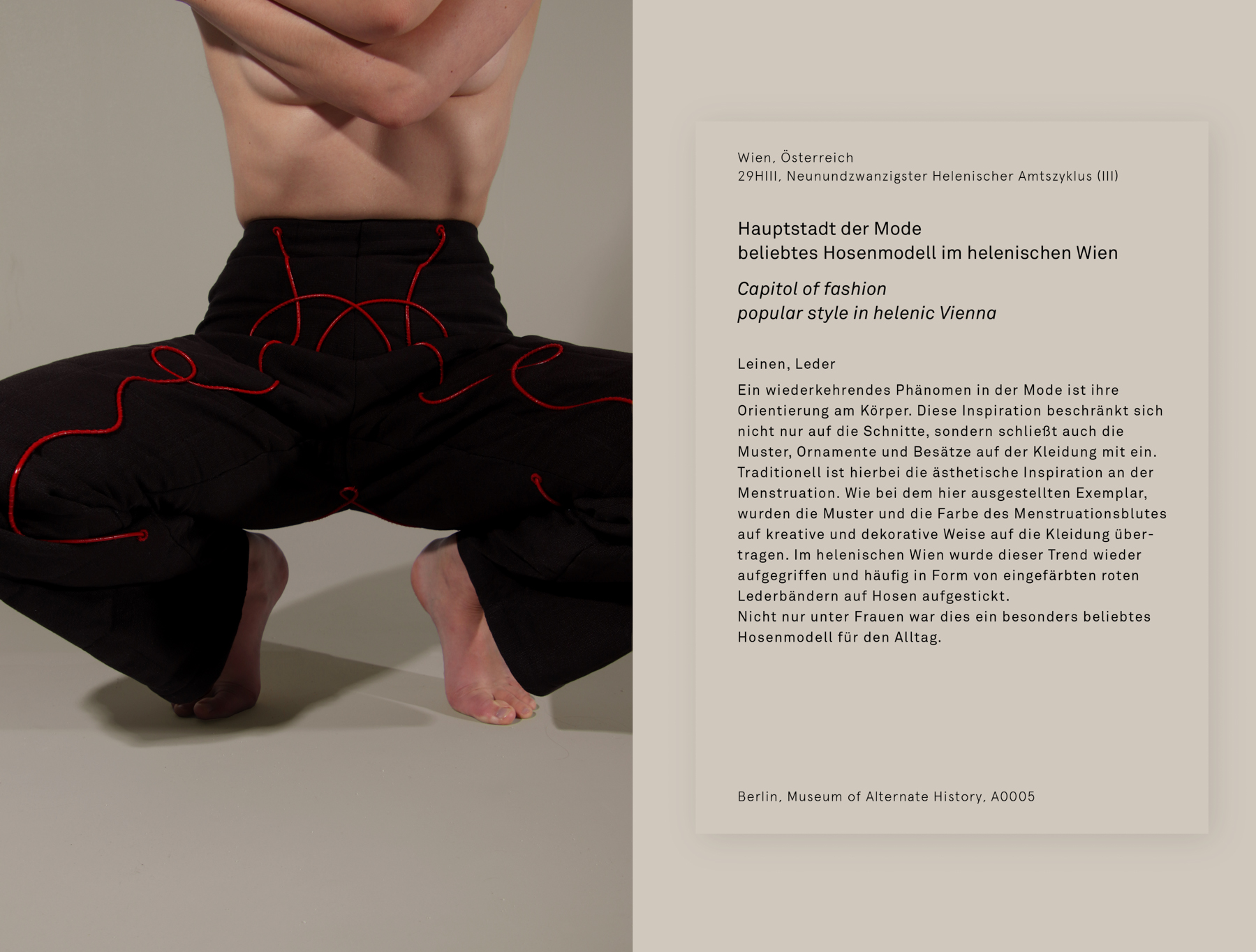 Das Museum of Alternate History verbindet feministische Gender Theorien und Spekulatives Design in dem alternativen Geschichtsszenario eines europäischen Matriarchats. So kommentiert es unter anderem die strenge patriarchalische Einordnung von Körpern in zwei “gegensätzliche” Geschlechter und die Unterwerfung und Disziplinierung von weiblichen und nicht-hetero-normativen Körpern. Sechs verschiedene Objekte und ihre beschreibenden Texte übertragen kritische Reflexion in Materialität und eröffnen so wortwörtlich den Raum für die Auseinandersetzung mit vielseitigen politischen, sozialen und kulturellen Themen.