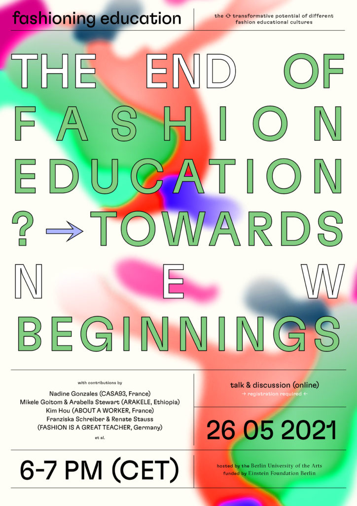 What can fashion education do? – fashioning education is a collaborative research initiative to open, facilitate and formalise the debate on fashion education against the backdrop of global social transformations. It brings together experts and creatives from different fields of fashion related education, research and practice into critical conversation and exploration of the transformative potential of fashion. The initiative seeks to contribute to the reflection, networking and reorientation of fashion education that meets the demands of a sustainable, social and conscious future. The three-year project is supported by the Einstein foundation and jointly led by the colleagues of the Fashion Institute of the Berlin University of the Arts Valeska Schmidt-Thomsen, Franziska Schreiber and Renate Stauss.
