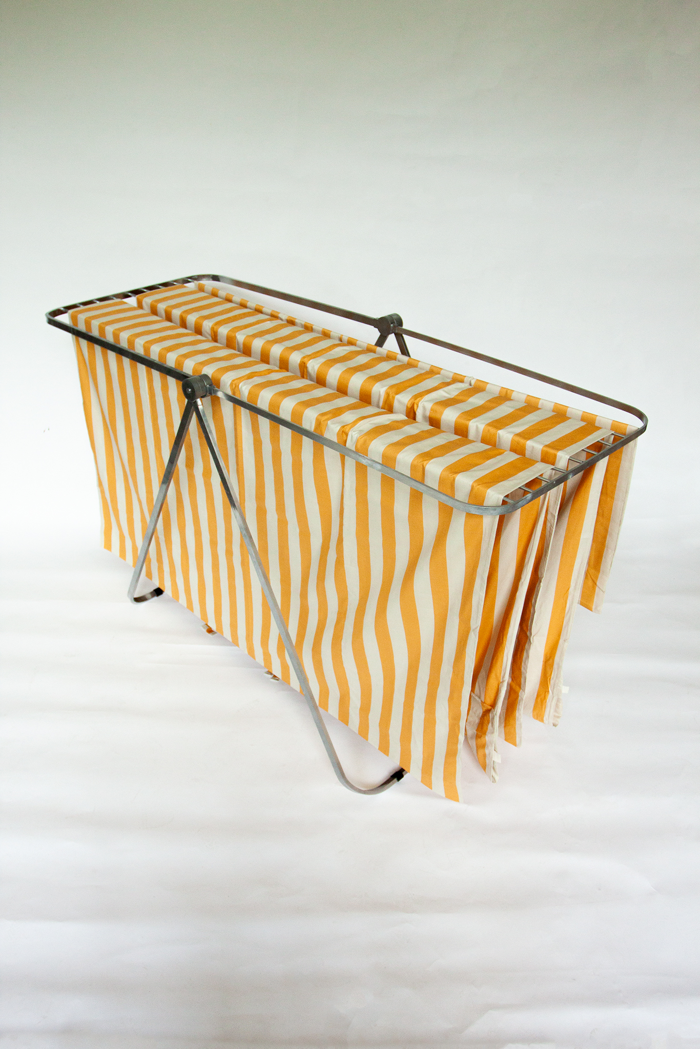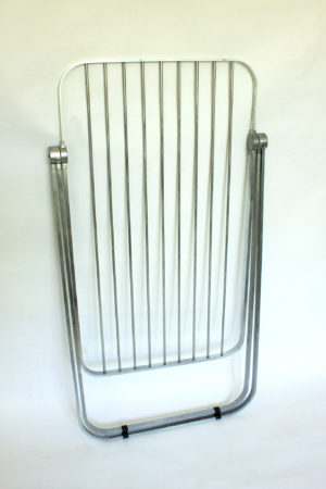 The laundry rack. Everyone knows it. Most people use it. Very few like it. Rarely practical, not really aesthetic. Functionally designed, it is part of our apartments – with or without wet laundry. DRY changes that. DRY is a practical and aesthetically pleasing laundry rack. The monojoint – inspired by Giancarlo Piretti’s Plia chair – makes it easy to open and close. The mechanism inside the joint locks the legs as well as the horizontal bars without additional help. The horizontal bars can be extended to a length of 160cm. This way there is enough space even for large textiles, such as bed covers. The design, as in classic designs, focuses on functionality and also references the Plia chair and its chrome finish. Thus DRY is not only a stylish everyday helper, but also a tribute to the Italian design of the 70s.