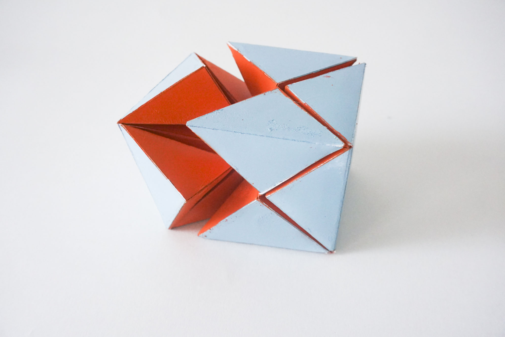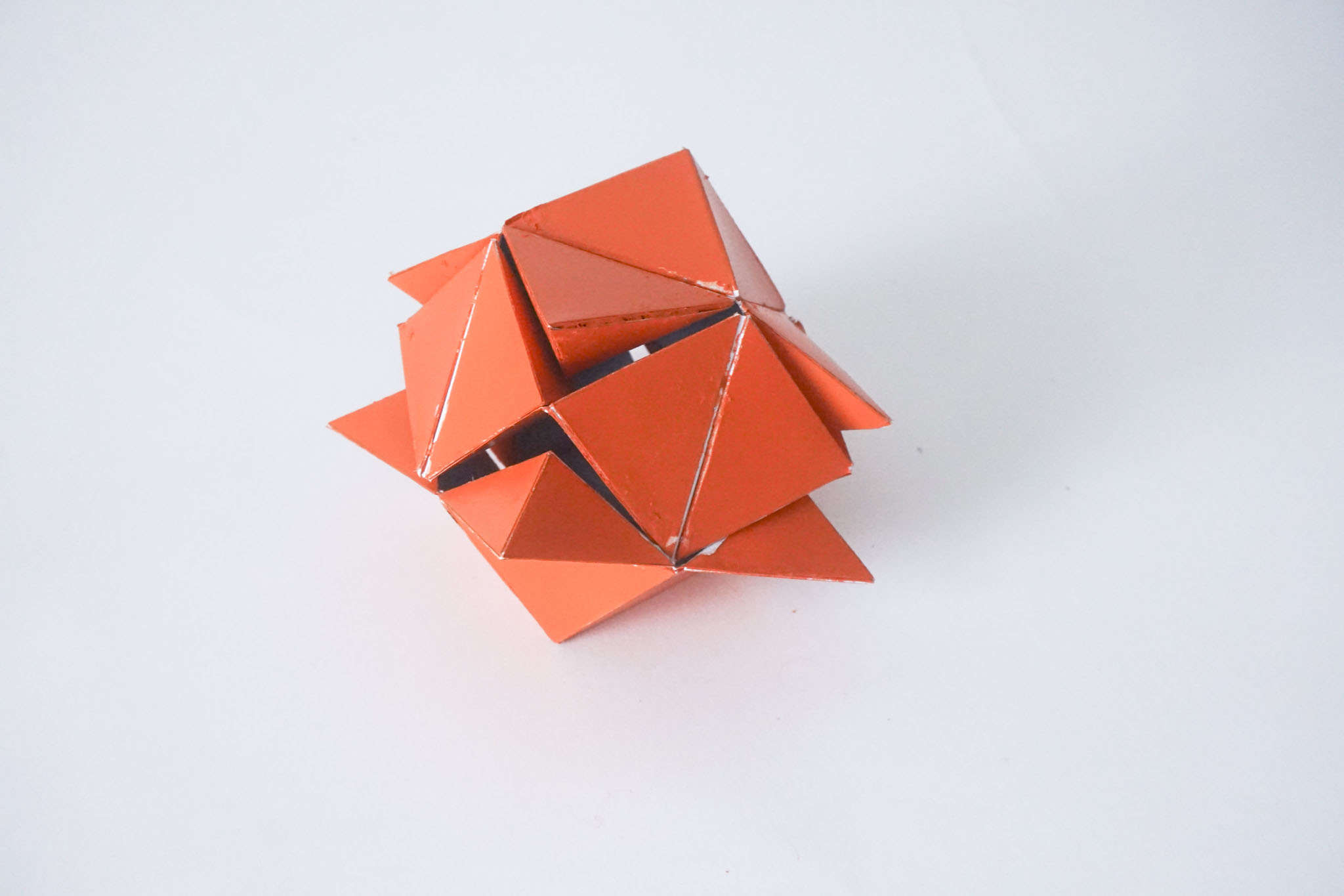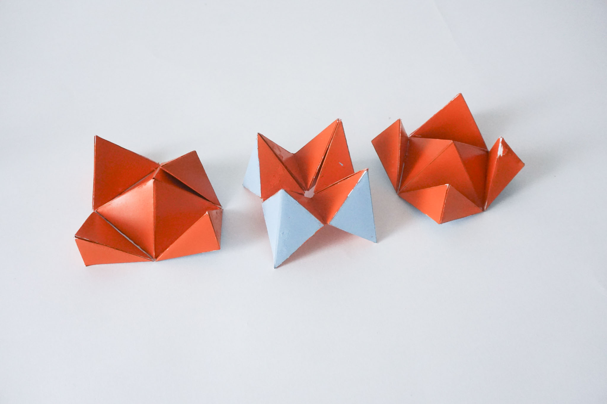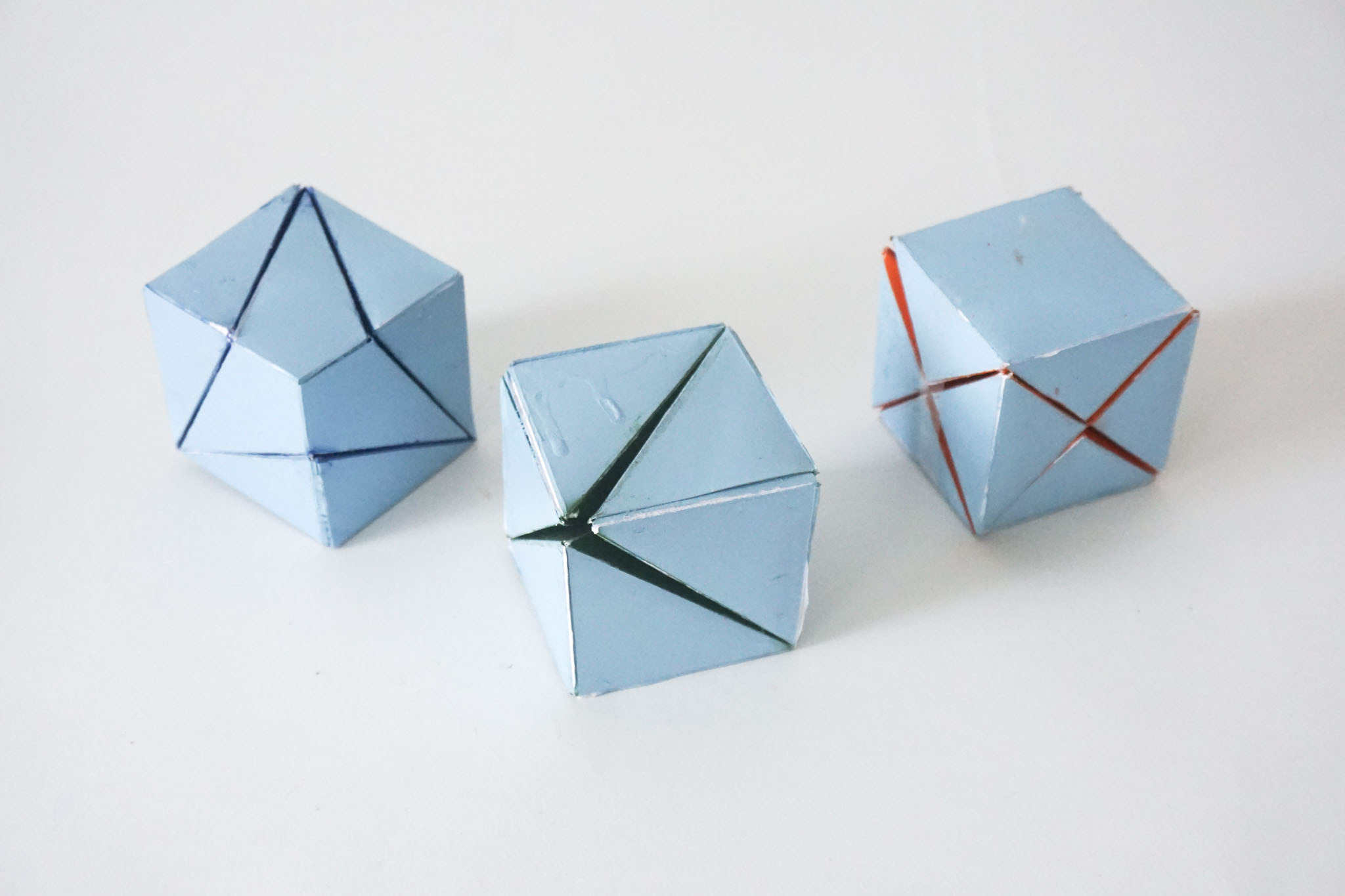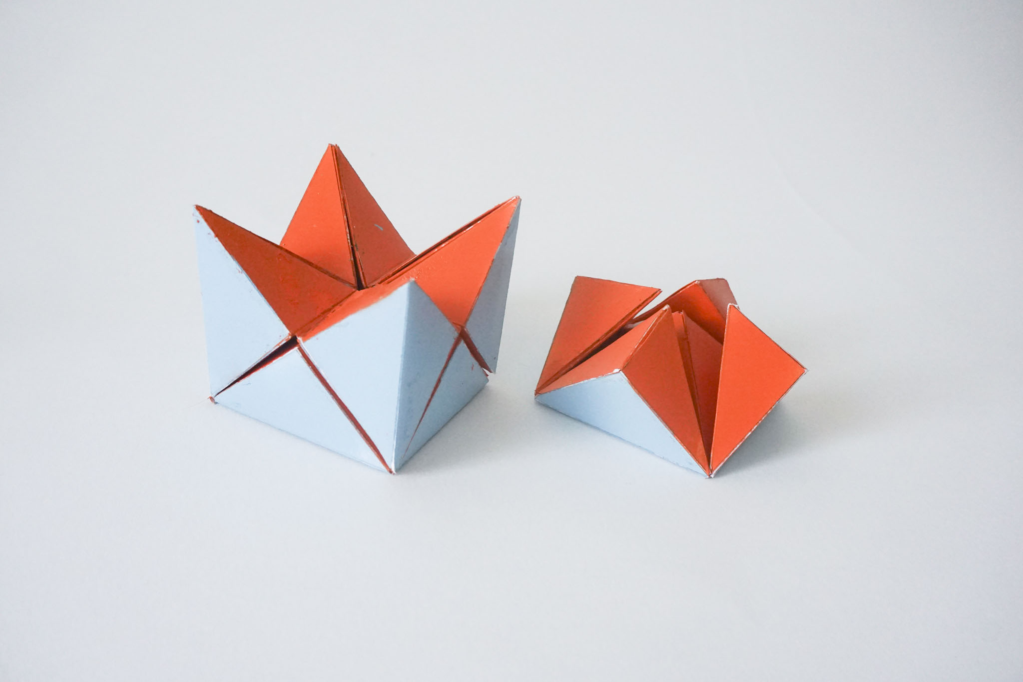 Inversis or inversion is the process of turning the outside to the inside and the inside to the outside. Even through inversion is a phenomenon well known in nature and textile production, the developments on geometrical inversions are fairly recent. At the beginning of the 20th century Paul Schatz developed the first invertible cube. The project Inversis concentrates on the deconstruction and inversion of the hexahedron. Each model is designed by a different person and uses alternating axes of symmetry to divide the cube. Through inversion, the hexahedron moves and transforms each time into new shapes and variations. Because most of the invertible objects are patented it’s hard to find pictures, information and any kind of instructions on how to build the objects online.
