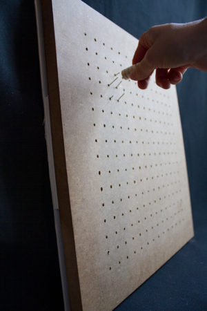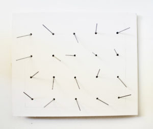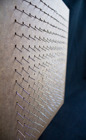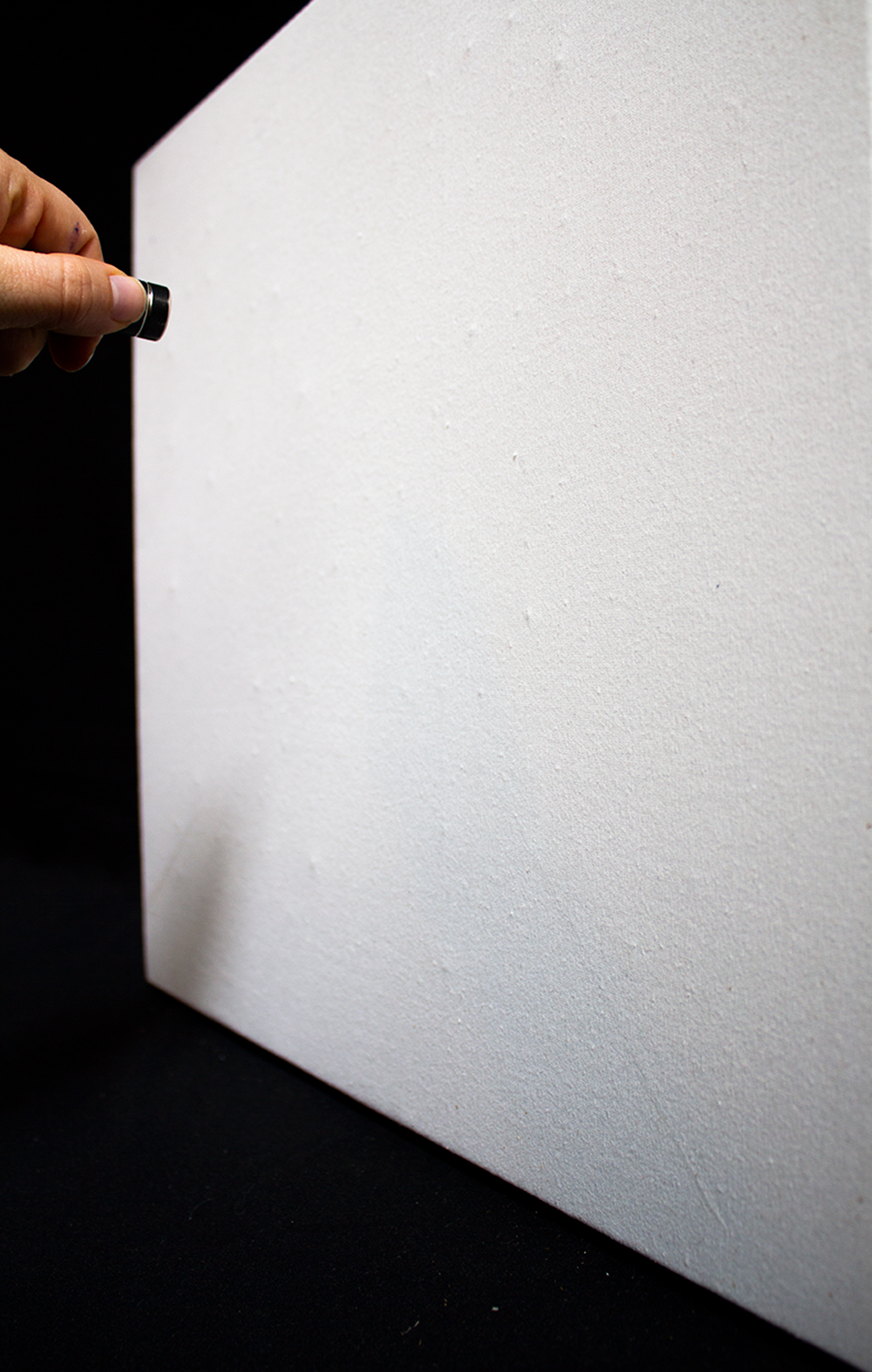 Die Ausgangsfrage war, wie die Geometrie der Oberfläche eine Verbindung mit einem Mechanismus haben könnte, um diese Veränderung zu erzeugen. Die Antwort kam mit Magneten, die viele interessante Eigenschaften besitzen. In diesem Projekt wird die Fähigkeit des Magneten, als unsichtbare Kraft zu wirken, wenn er sich in der Nähe von Eisen befindet, ohne dass ein Kontakt erforderlich ist, weiter erforscht. Mein Interaktionswerkzeug ist ein Magnetstab, der aus übereinander gestapelten Magneten besteht, wodurch sich deren Kraft erhöht. Die Oberfläche ist flach und glatt, wenn der Magnetstab entfernt ist; wenn er sich nähert, tauchen die Stahldrahtstücke auf. Was also zunächst wie ein weißes, glattes Quadrat aussieht, verändert sich durch die Interaktion mit dem Magneten.