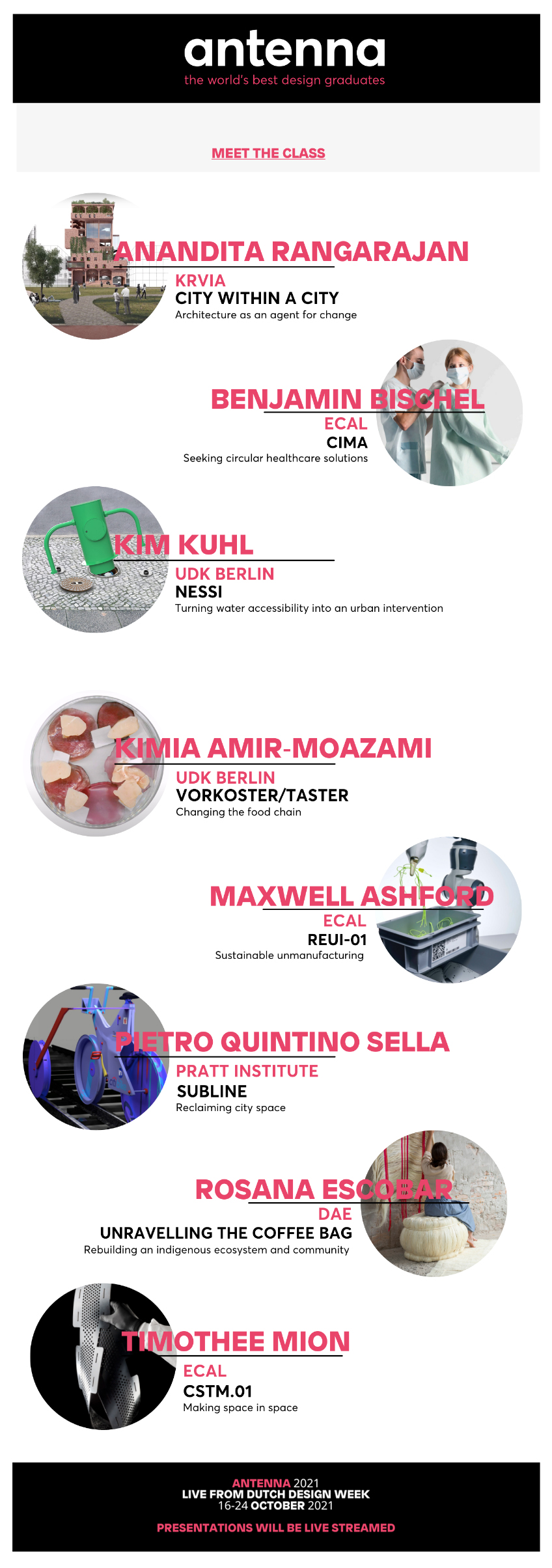 Annually Antenna presents young students or recent graduates (past 2 years), under 35 years of age, ranging from first-year all the way to PhD level, who are creating design work that has the potential to change the world for the better.