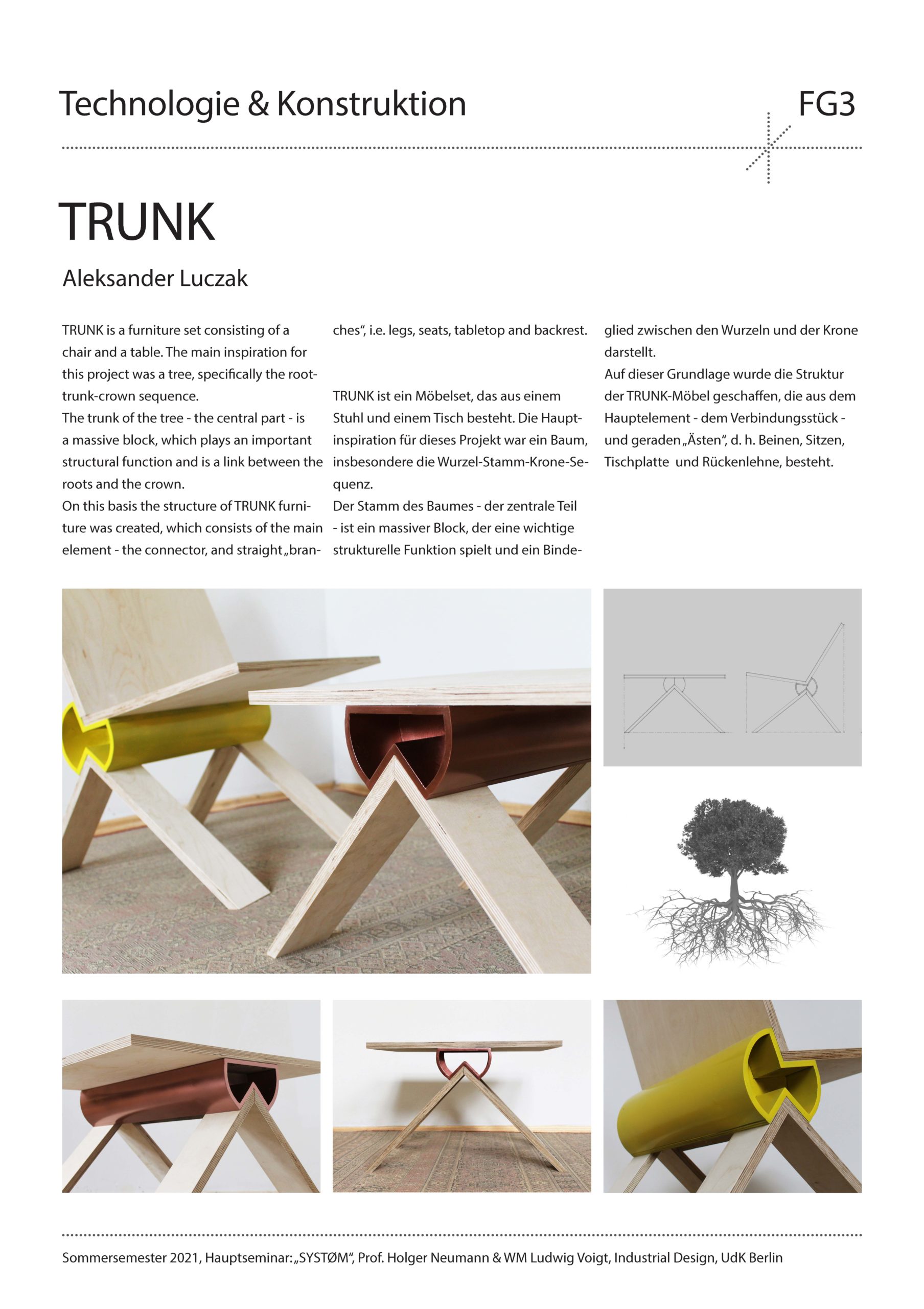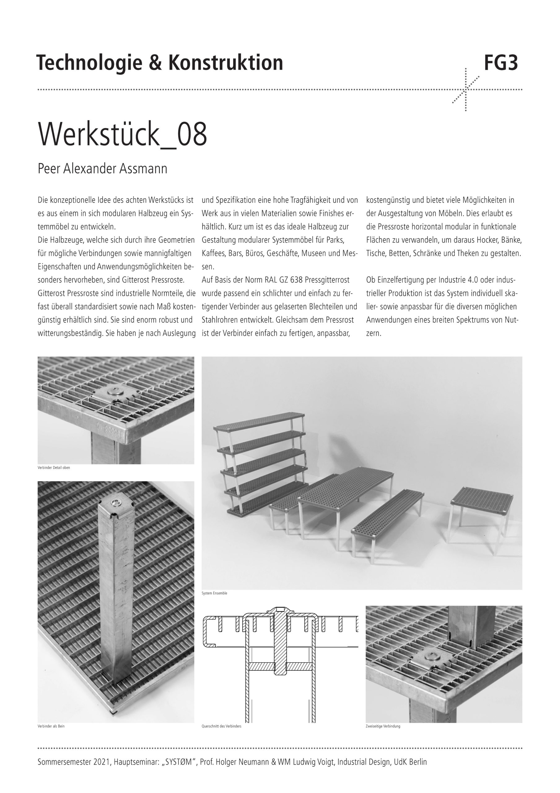 Das Semesterprojekt für die Studierenden war der Entwurf und die konstruktive Entwicklung eines intelligenten Verbinders, der ganz unterschiedliche Objekt- und Produkteigenschaften ermöglicht. Es sollten neue und individuelle Möbeltypologien zu Themen wie Stauraum, Tischflächen oder Sitzmöbel betrachtet werden. Durch die Kombination eines intelligenten Verbinders mit Halbzeugen und Plattenmaterialien sollte ein komplettes Möbelsystem entstehen. Nach einer intensiven konzeptionellen Auseinandersetzung mittels Mindmapping wurde eine umfassende Conceptual Map entwickelt, die als Grundlage und Ausgangspunkt für den Entwurfsprozess diente. Nach der konstruktiven Ausarbeitung der Entwürfe folgte als wichtiger Teil des Seminars die Entwicklung der Entwürfe zu einem physischen Prototyp. Die simulierte Produktentwicklung wurde durch die Einholung von Angeboten bei möglichen Lieferanten abgerundet.