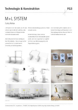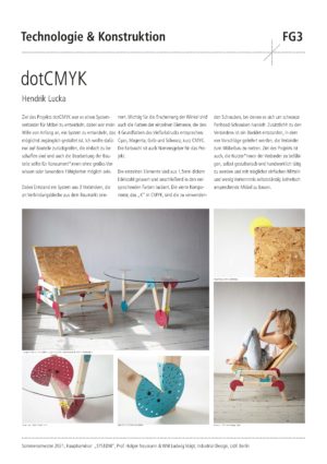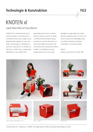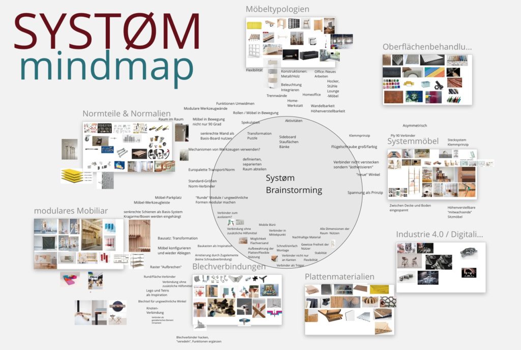 The semester projekt for the students was the design and constructive development of a connector which enables very different object and product characteristics. New and individual furniture typologies on topics such as storage space, table surfaces or seating furniture were to be considered. A complete furniture system was to be created by combining intelligent connectors with semi-finished products and sheet materials. After an intensive conceptual discussion using mind-mapping, we developed a comprehensive conceptual map, which served as a basis and starting point for the design process. After the constructive elaboration of the designs, the development of the designs into a physical prototype followed as an important part of the seminar. The simulated product development was rounded off by requests for quotations from possible suppliers.