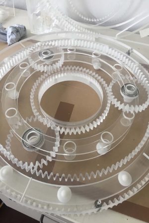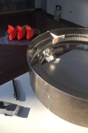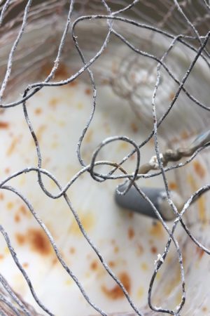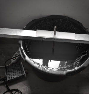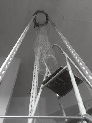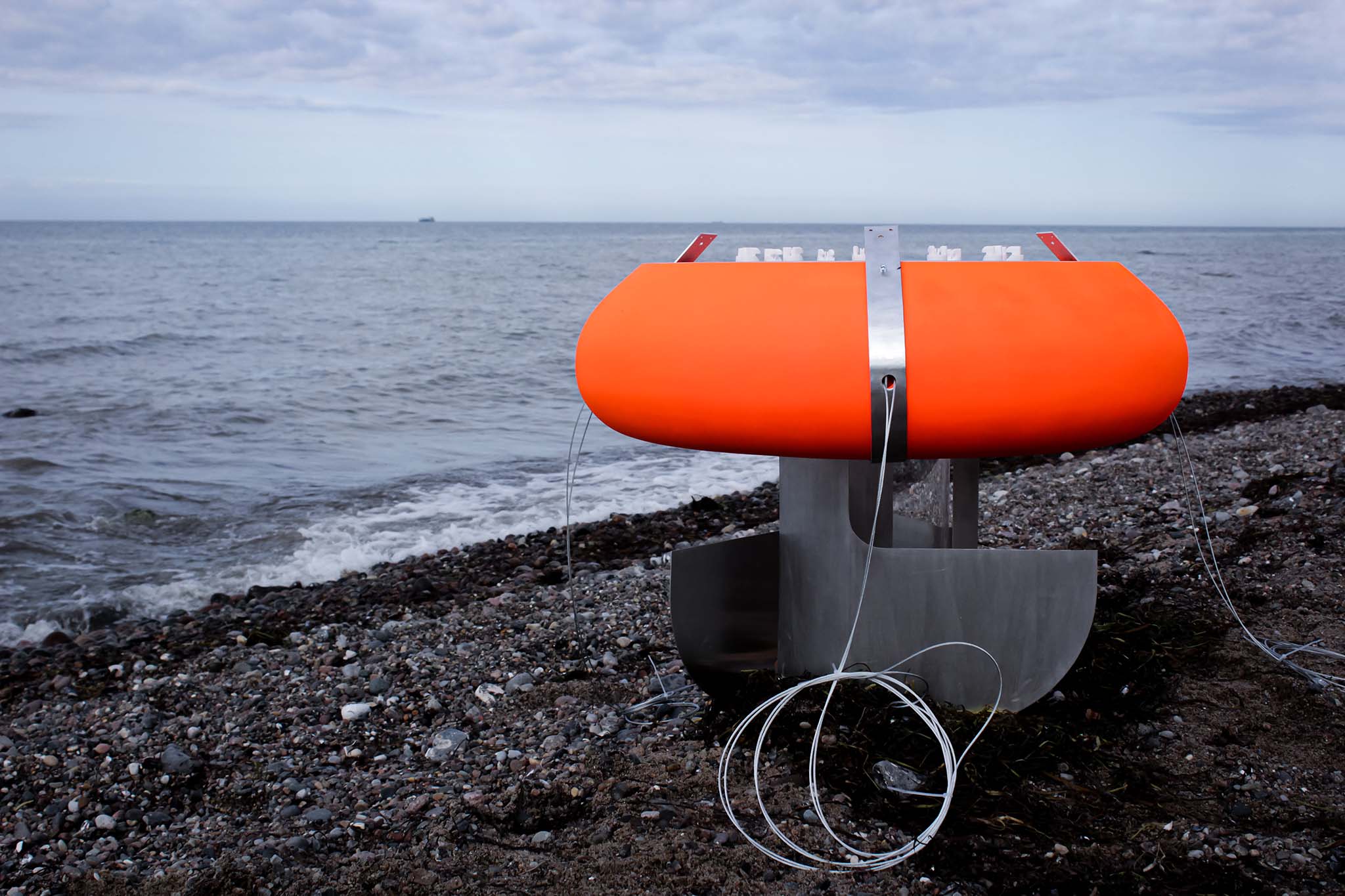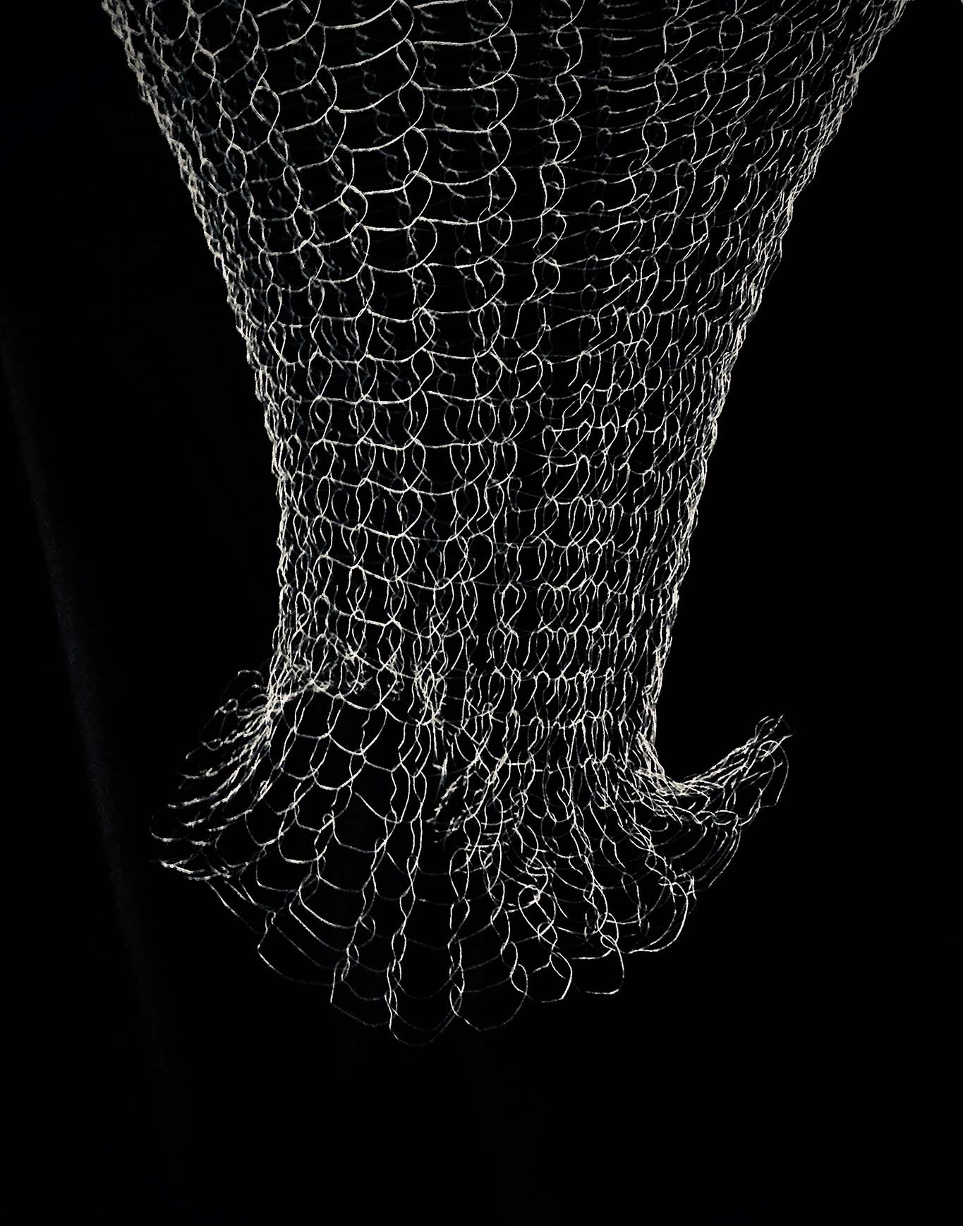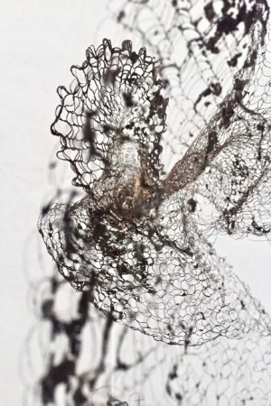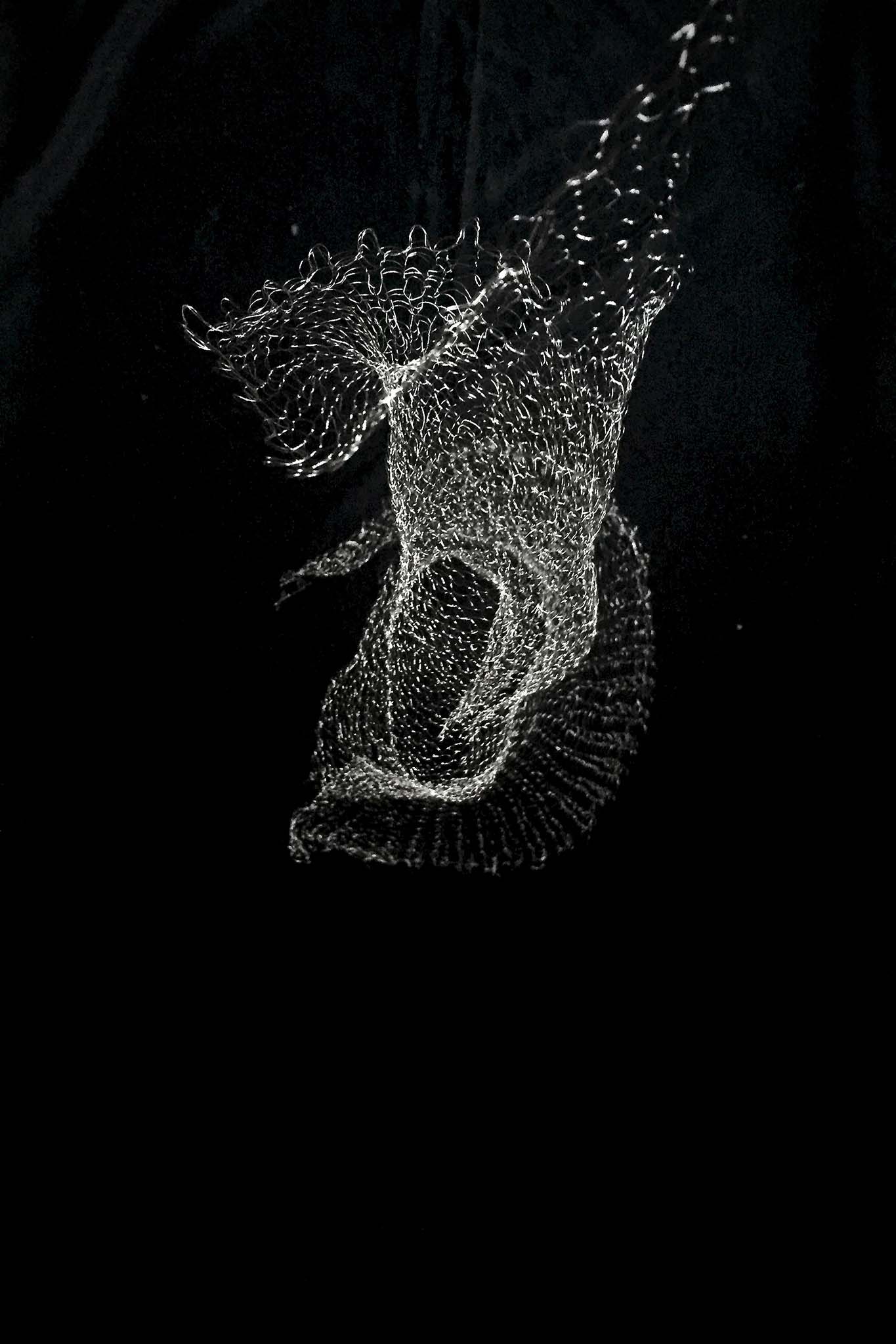 Corresponding to the tide, a mechanism that is driven by the water intervenes in it rhythmically. She knits a wire down into the inhuman.