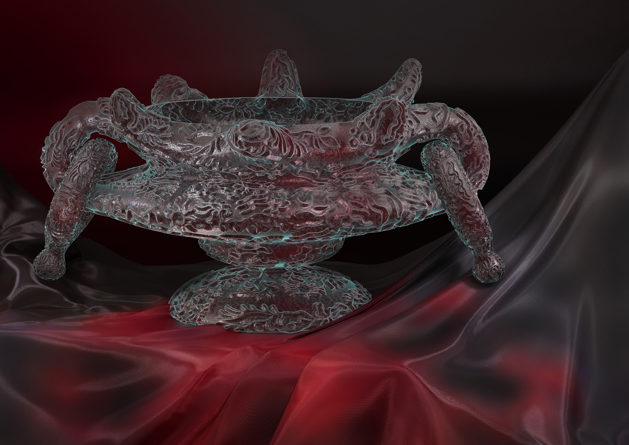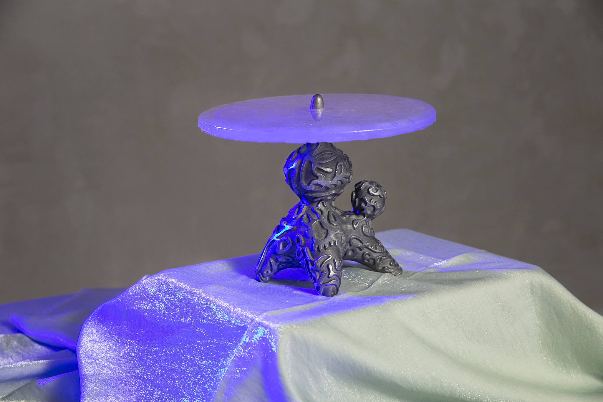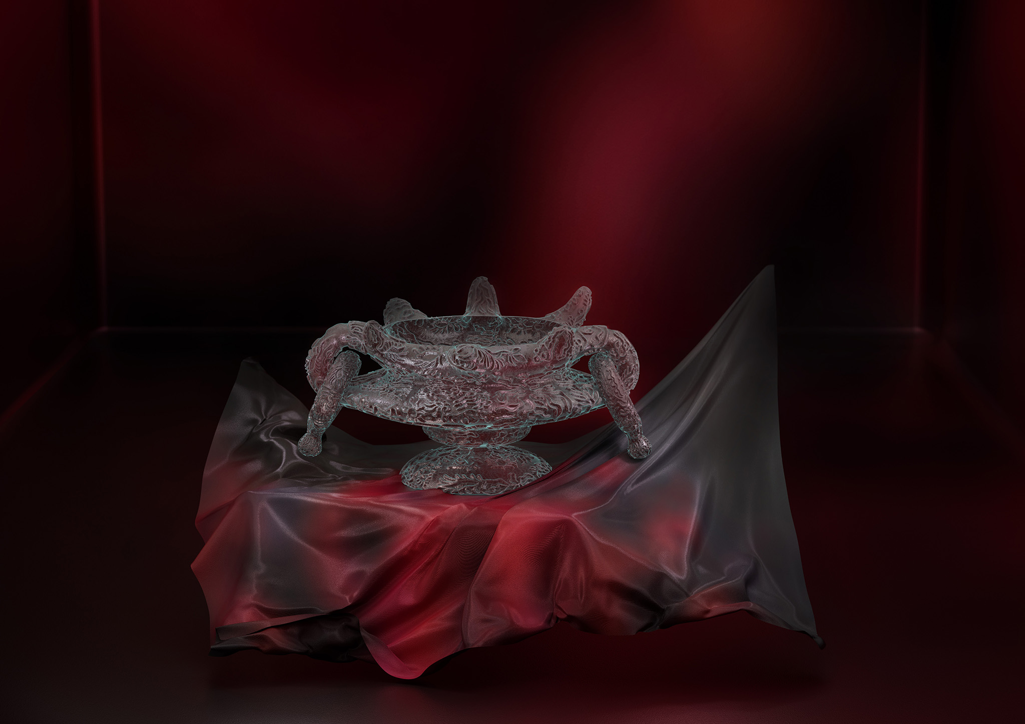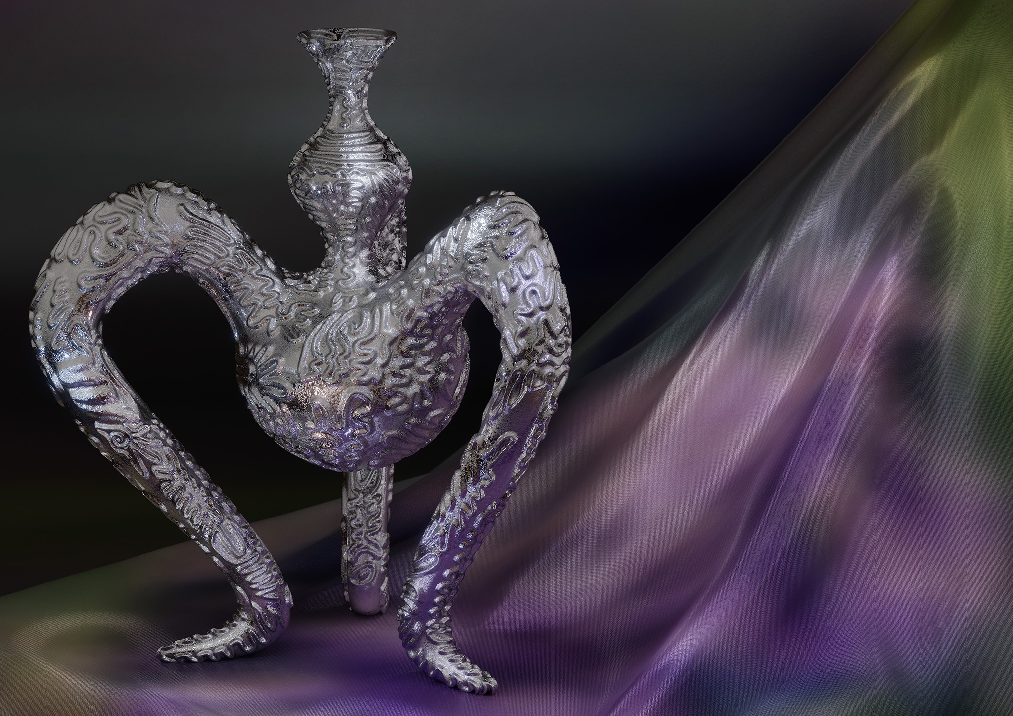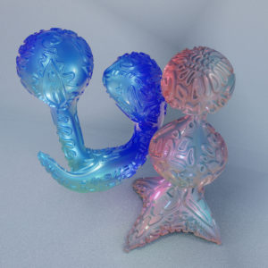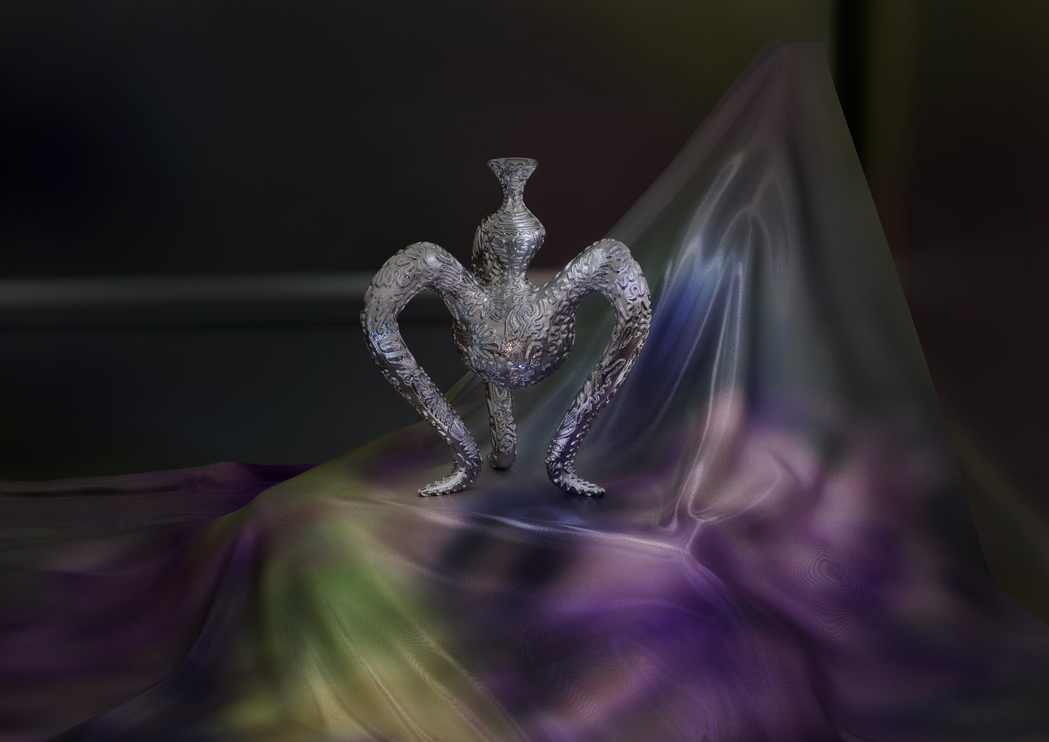 Because the meaning of functionality is always most apparent to us, we may pay just little attention to the richness of symbols that are inherent in our unconscious. Symbols arise from past events and are shaped by the emotions that these original events once triggered in us. But symbols can also rise from a collective origin. Those have been infiltrated into us by the society, culture, time and space, that we live in. Either way, a symbol is more than just the plane meaning of a thing. It’ s a feeling that we get touched by first and then, by the pull of power of our own interpretation, we get carried away. Once it’s manifested in the unconscious, we have to deal with it. In order to become aware of our own existence, we have to strive the understanding of symbolic meaning and its effectiveness. “The Elusiveness Of Objects And Worlds” explores the archetypal symbolism of objects that are born through a fusion of digital and analogue space. Analogue and digital chance and power of interpretation become instruments of creation to illustrate the unconscious power of imagination. The result is an intuitive way of designing unknown shapes and phygital artifacts that are carrying symbols from both worlds within them.