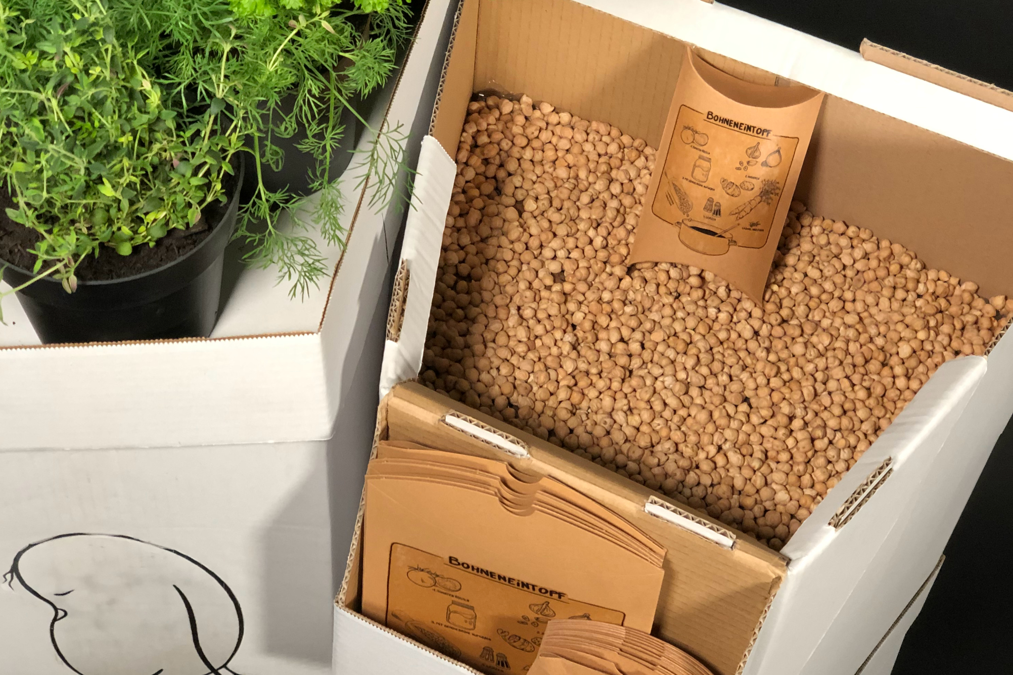 To create more inspiration, simple generalized recipes are printed on the pillow boxes made of recycled paper, which serve as packaging to avoid all aluminum or plastic packaging. They are meant to encourage you to try your way through the different peas, beans and lentils, which is why the exact variety is not mentioned in the recipe.Together with the Leguminous herbs and spices are exhibited. The direct affiliation should be unmistakable as they can clearly contribute to digestibility. The supermarket display is intended in the vegetable section, because it is a basic food, with incredibly positive heal.