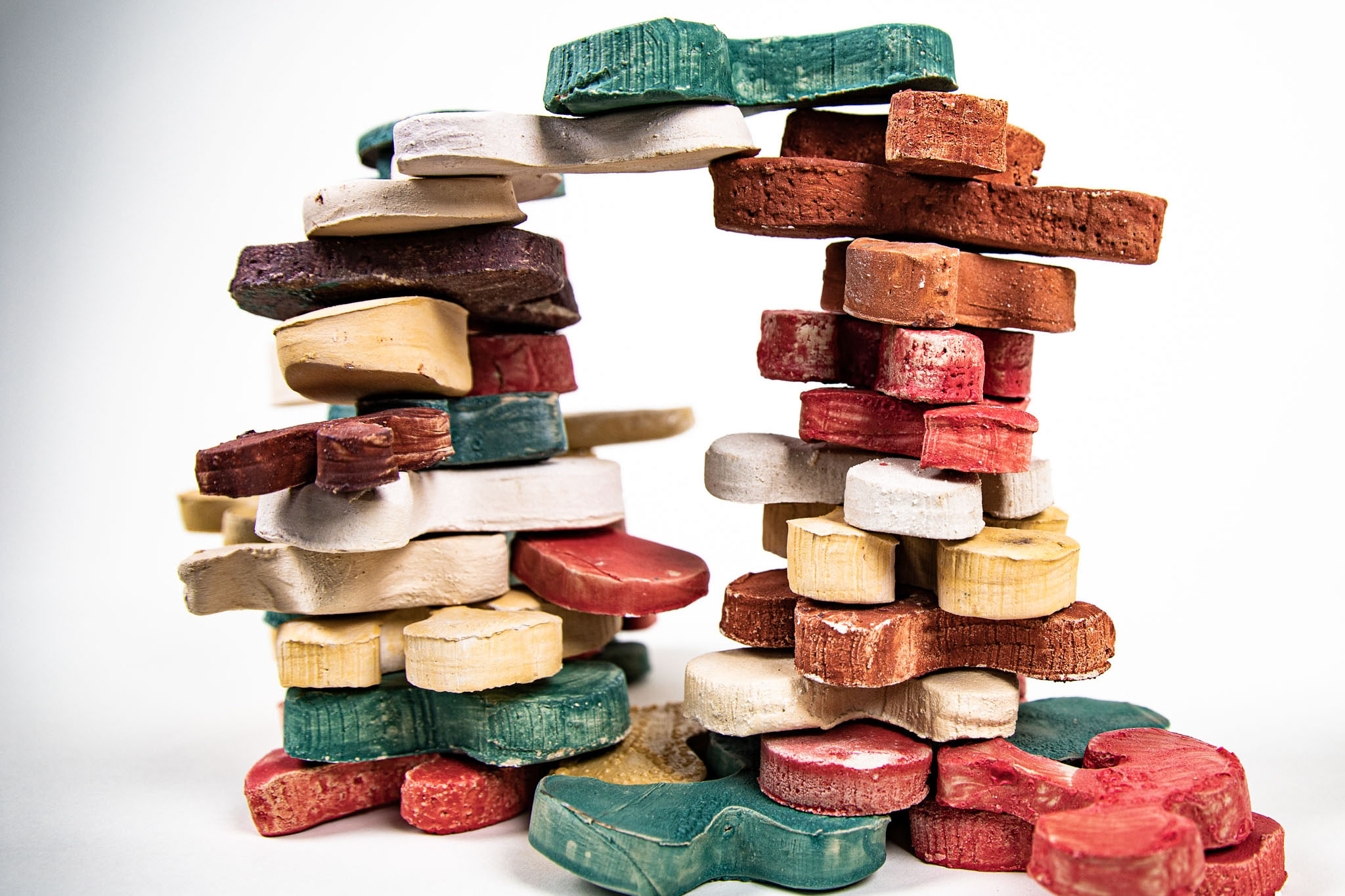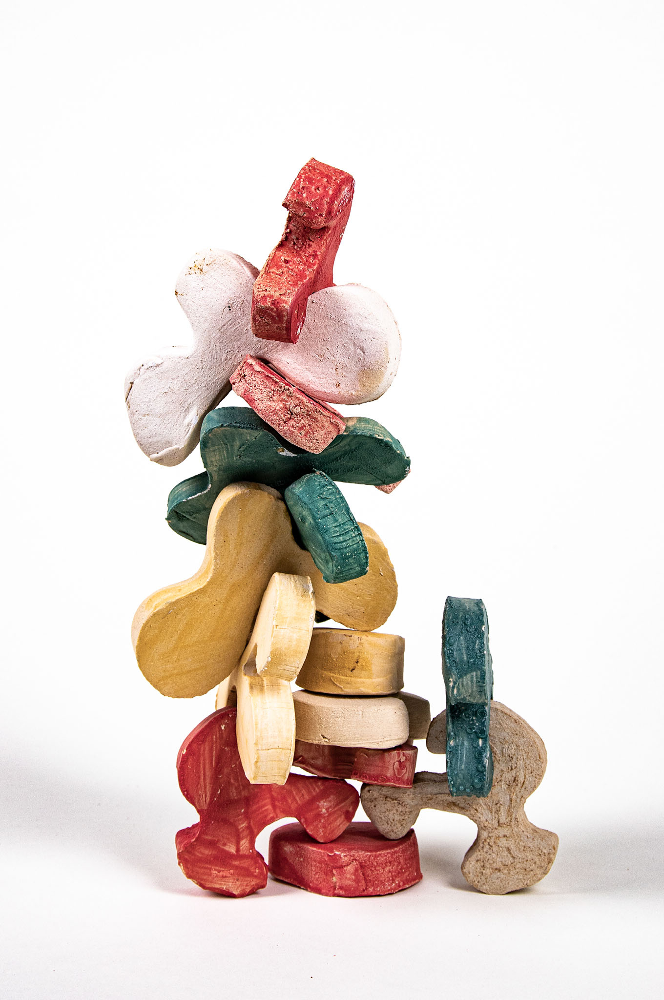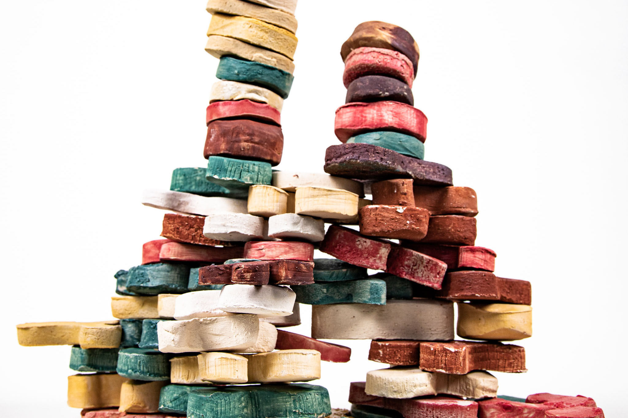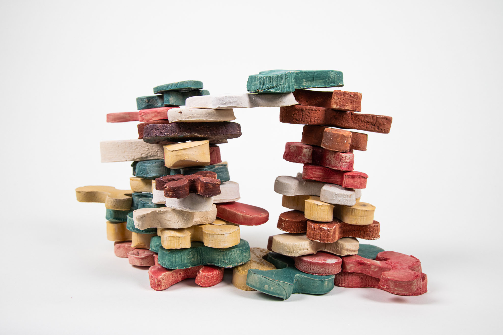 Flower Tower is a toy brick set for toddlers, whose lively shapes are designed to provide a different approach to the child’s imagination. Almost all children grew up and continue to grow up with rectangular building blocks: What can be easily stacked together to form small houses or towns, however, soon reaches its limits. It takes a lot of imagination to dissolve the architectural, cubic character – natural, organic shapes are difficult to reproduce with rectangular bodies. Flower Tower’s building blocks aim to fill this void and (if intentional) build a bridge. In their neutral but explicit shapes, everyone sees something different: sometimes a tree, sometimes an animal, sometimes an island in a broad sea.