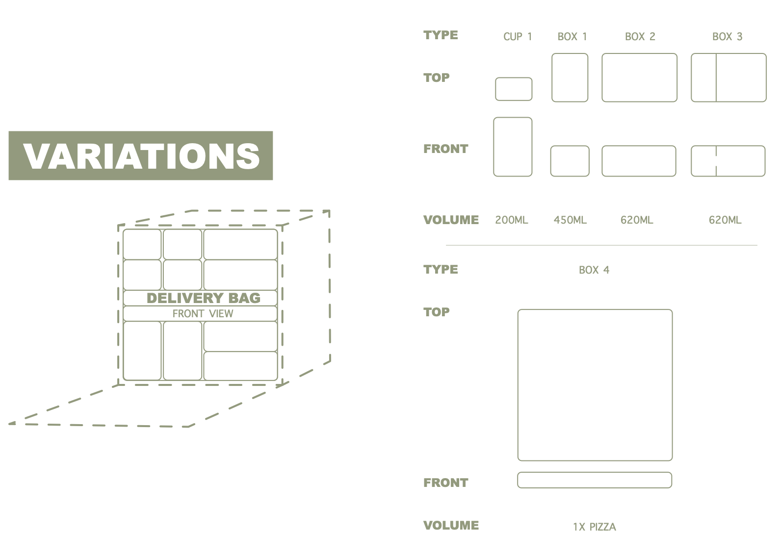 RE:ME can be developed into a wider system. The rectangular shape not only allows the most efficient use of volume, but also a wide range of food, from pasta to sushi, from burritos to soups. In addition, the concept can be thought further including different variations of boxes to include an even wider range of food varieties.