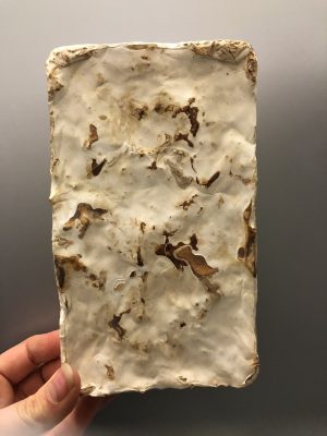 In MYCOTOPIA a symbiosis between fungi and humans permeates all areas of life: In design and architecture, humans have created space for hypermutations in the realm of fungi – starting with building blocks from which cities, roads and houses are grown, created by mycelium – fungi dissolve nutrients from their environment with the help of enzymes. As a food source, they can thus use cellulose, which can be obtained from various agricultural or forestry residues such as straw, hemp shives and wood chips. Functioning as a biological mortar this three-dimensional fungal network compresses the plant material into a solid composite material that can have different densities. Mycelium can be used as a base for composite materials, acting as insulation for thermal, acoustic or fire protection properties. MYCOMOULD can be used to produce a versatile building block with applications in design and architecture. Preparation of the biomass for a brick requires three weeks, completion another 10-15 days. Various plug-in options allow for building of large structures without additional connecting materials. For smaller parts such as furniture, the building blocks could be placed on top of each other before being killed by heatdrying. If the entire object is kept in a sterile environment, the individual parts will coalesce into one large one but retain their shape. On an architectural scale, neither sterile coalescence nor heating and killing the fungal elements is possible. However, by growing into concrete, cement, or wood, the fungus-plant composite can be firmly bonded to a third material that would be necessary to build large structures.