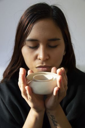 The Shabtu Objects are made out of stoneware and include one tall wine carafe and four rounded glasses. The Shabtu ritual is carrying the same principle as the Shabbat ritual-to distinguish between the weekend and the weekdays. The ritual starts when the carafe is filled with wine and all four glasses are placed upon the cylinder of the carafe. The wine needs to be poured into the glasses but in order to do so, all four glasses have to be placed first at the center of the table. The carafe is being passed among the participants and each participant puts one glass down. Then the carafe is being passed again and each participant is pouring the wine in a circular arm movement into the rounded hollow glass axis. After all glasses have been filled, the time comes for a personal moment of Shabtu. Each participant is holding the glass near to his mouth and nose, so he can smell and sense the wine, and takes a moment for pausing and reflecting.