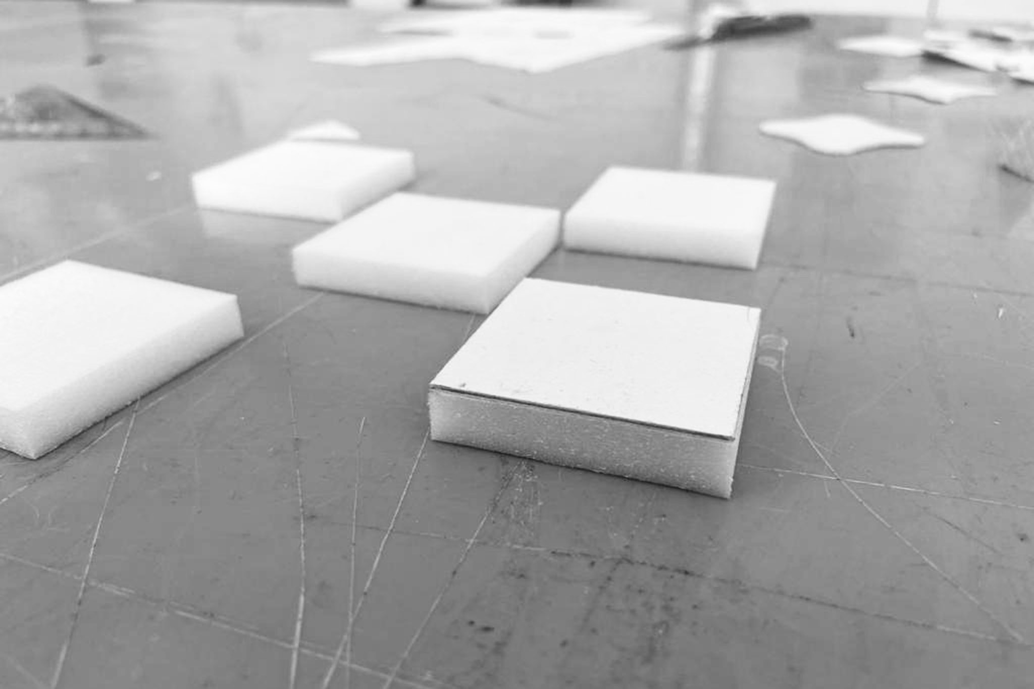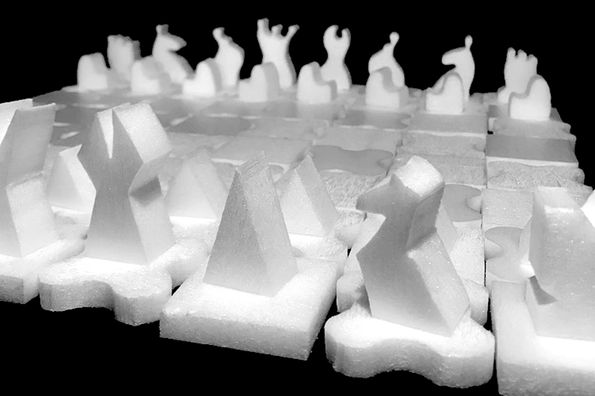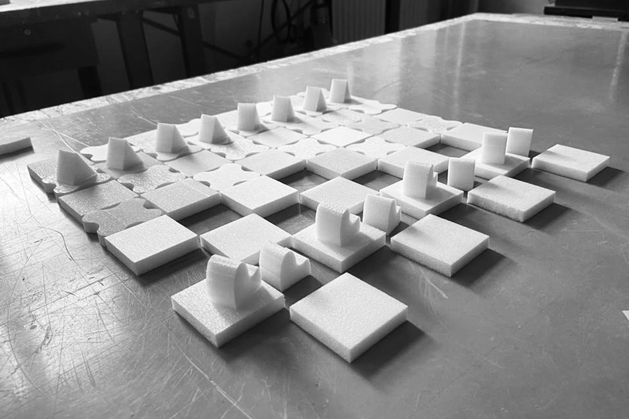 Also the playing field is not constructed as a closed surface, but is divided into seperate stones with a thickness of 10mm. Here the distinction is also not solved by colors, but the two formal languages are taken up again. The 25mm thick figures get their character by an optimal and material-saving use of the material. For example, King and Queen can be inserted into each other at their upper ends, so that no residual material is created. The first model made of polysterol gives a first glimpse of what the final design can look like in a 1:1 scale. The final prototype is to be made of solid wood, so that the figures are easy to handle with an optimal weight.