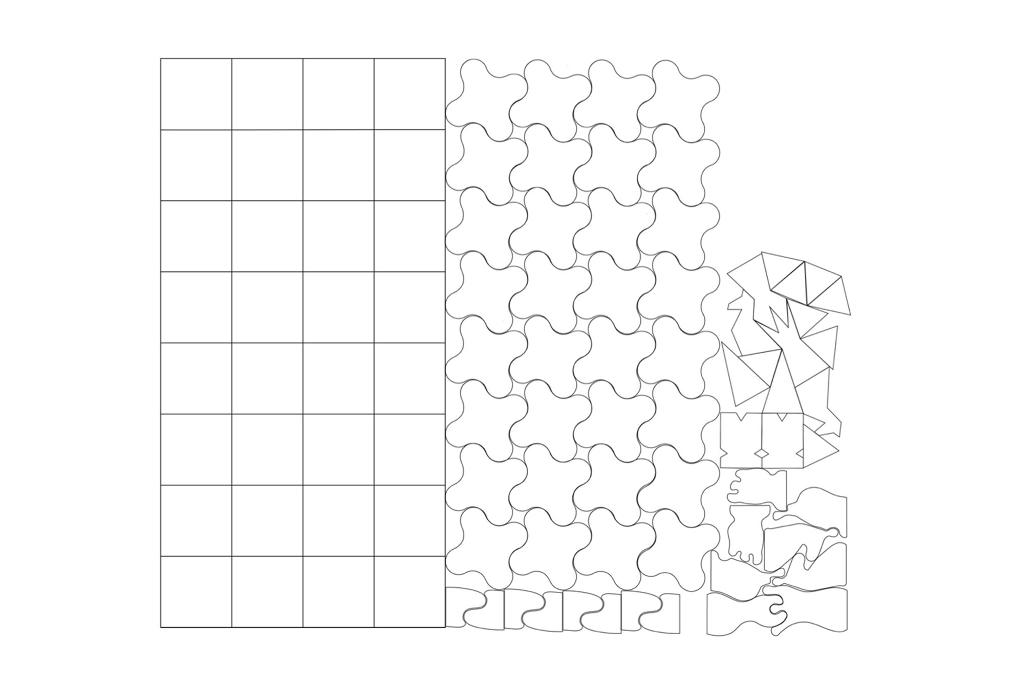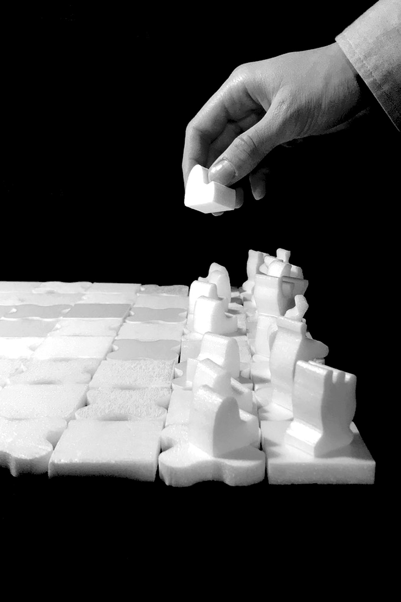96 is a chess game in which black and white aren’t opposed as usual, but round and edged pieces. Both sides have a different formal language and are nevertheless recognizable as belonging to each other. Thus, both sets have similar characteristics, such as the King’s crown and the Tower’s battlements. However, they are presented differently.