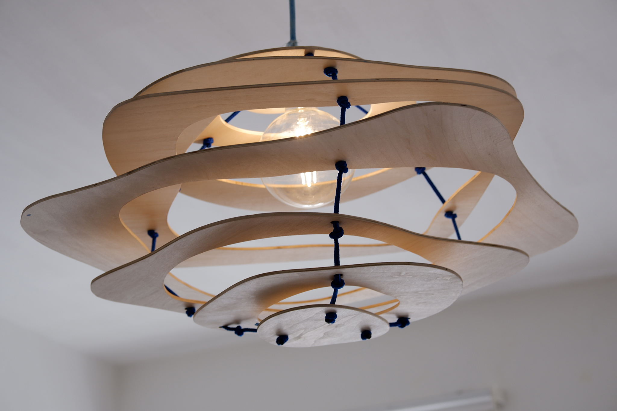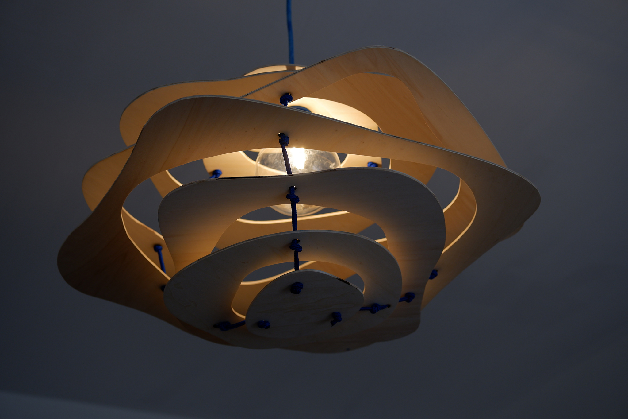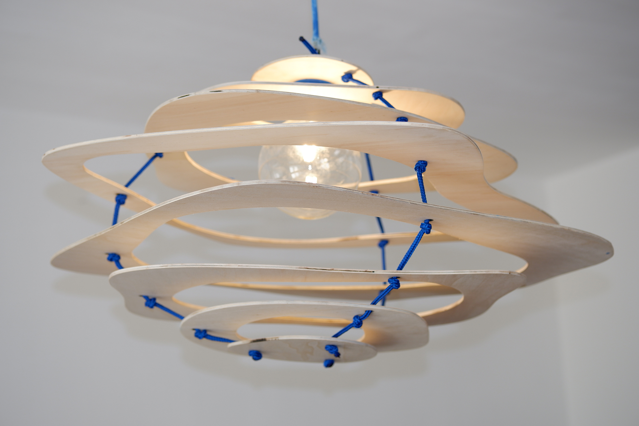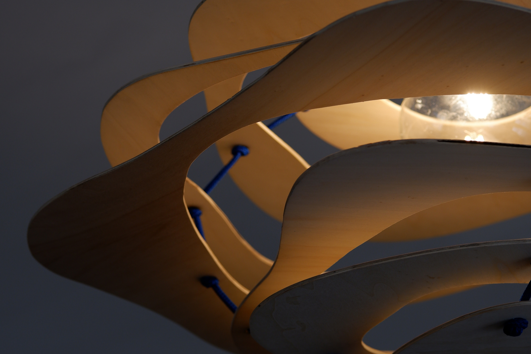 NEST is a pendant lamp made of wood, which consists of organically shaped wooden parts, which are held together by 3 ropes. The panels rest on nodes in the ropes. The shape of the individual wooden parts is ehr undefined. The ropes, by which the wooden parts are held together, however, together form a clear sphere, which additionally brings order to the construction. The warm light of the lamp is additionally enhanced by the light wood. Despite the open construction, the lamp has its own inner life and the layered construction creates an open and warm atmosphere in the room. In the manufacture of the lamp, there is also little waste, because the individual parts fit perfectly into each other. Thus, NEST is also efficient in its production and can also be delivered or stored space-efficiently.