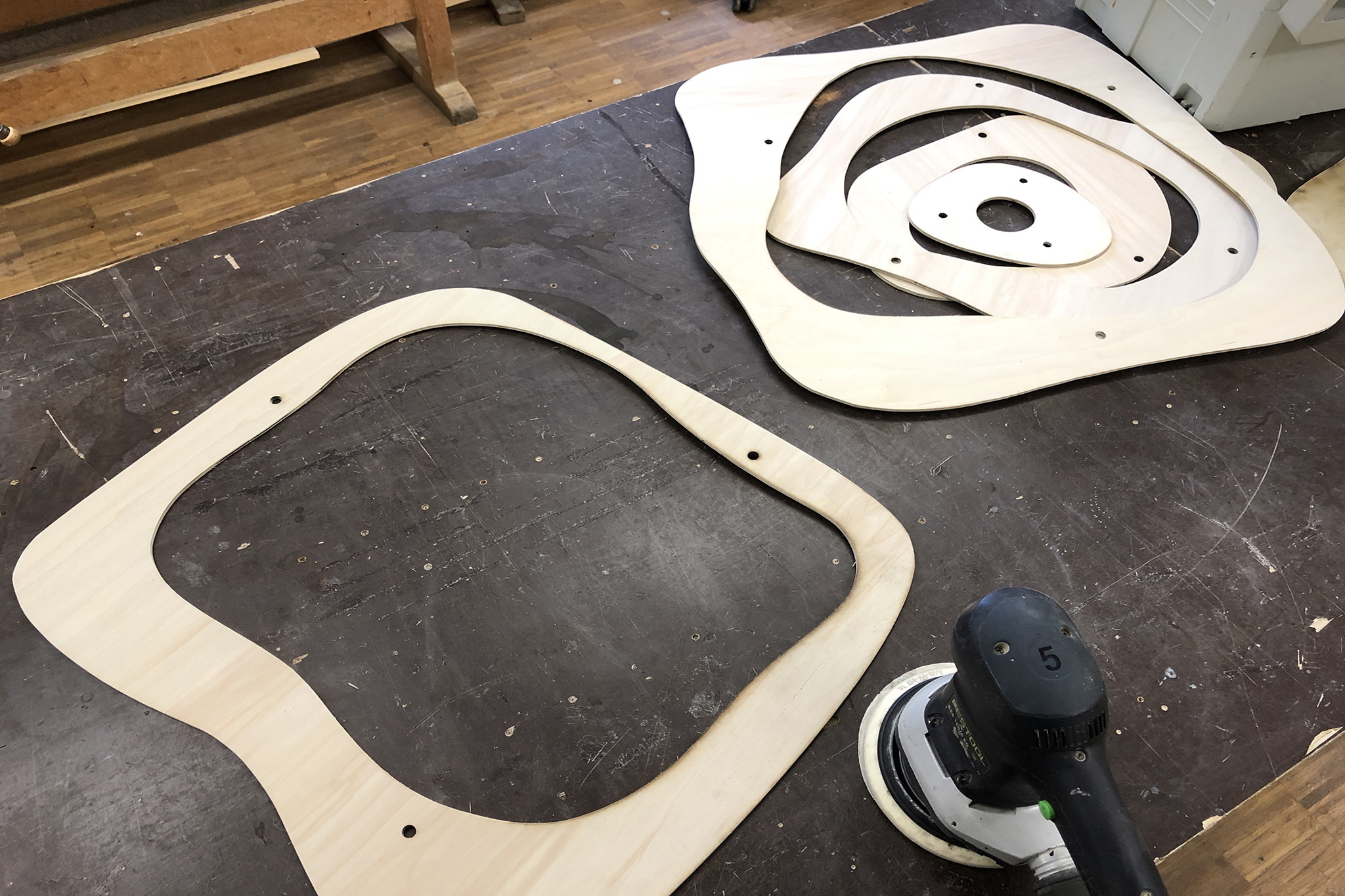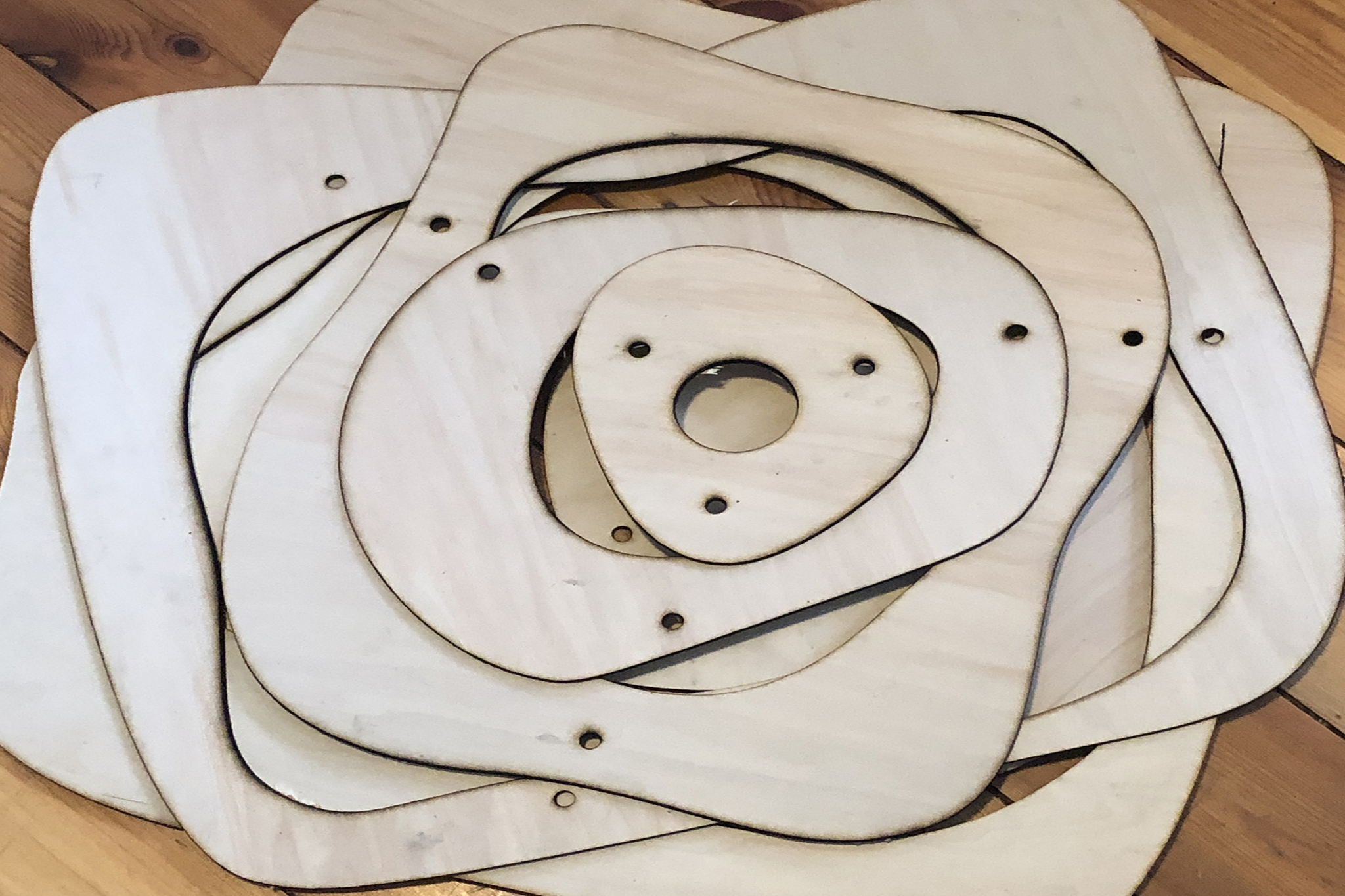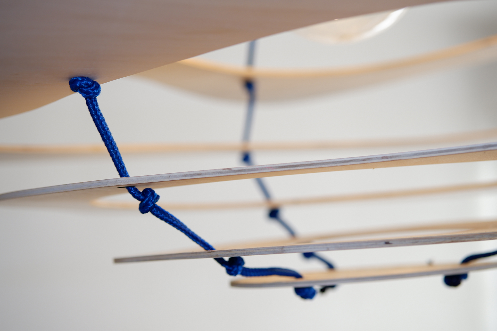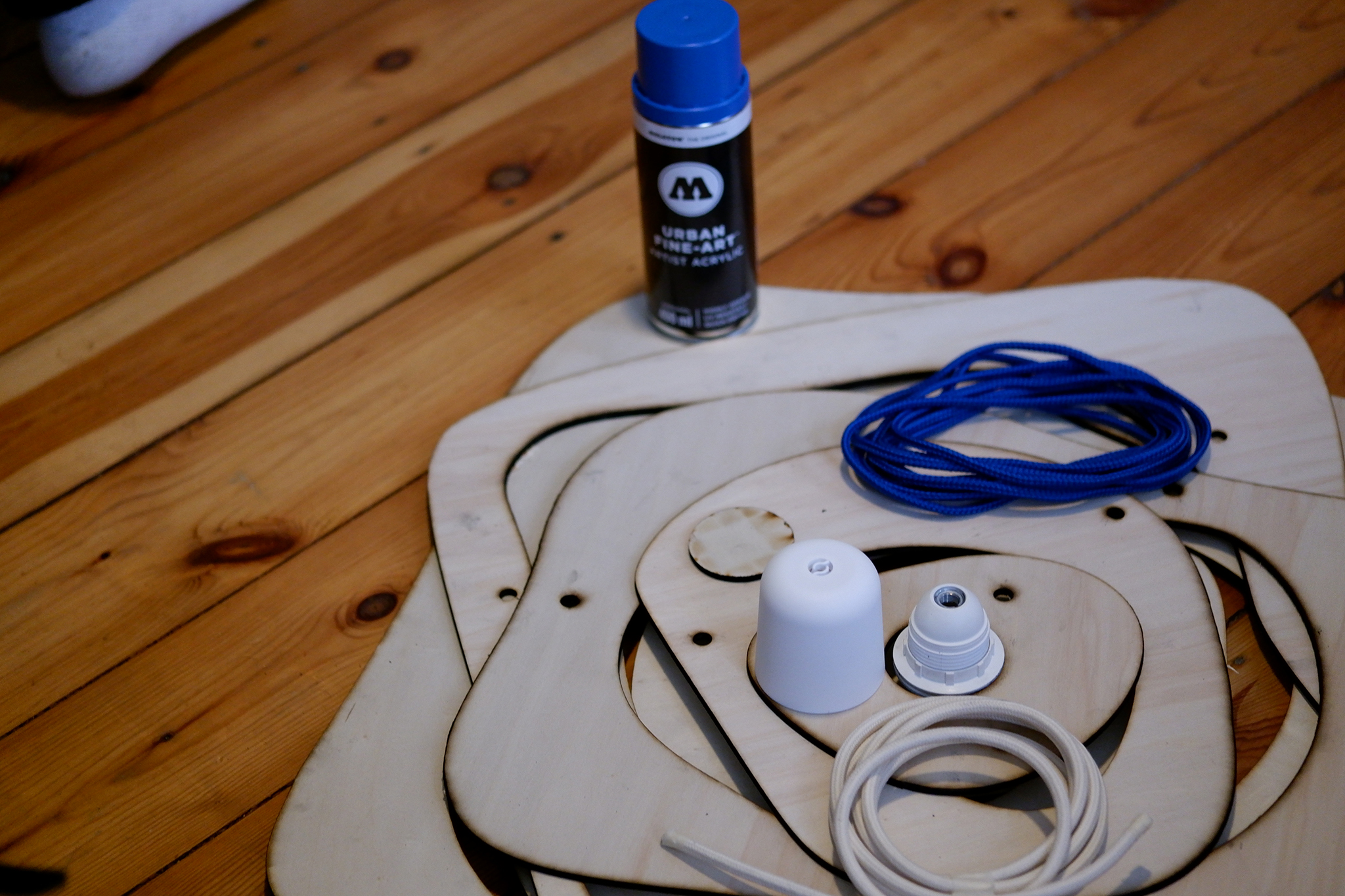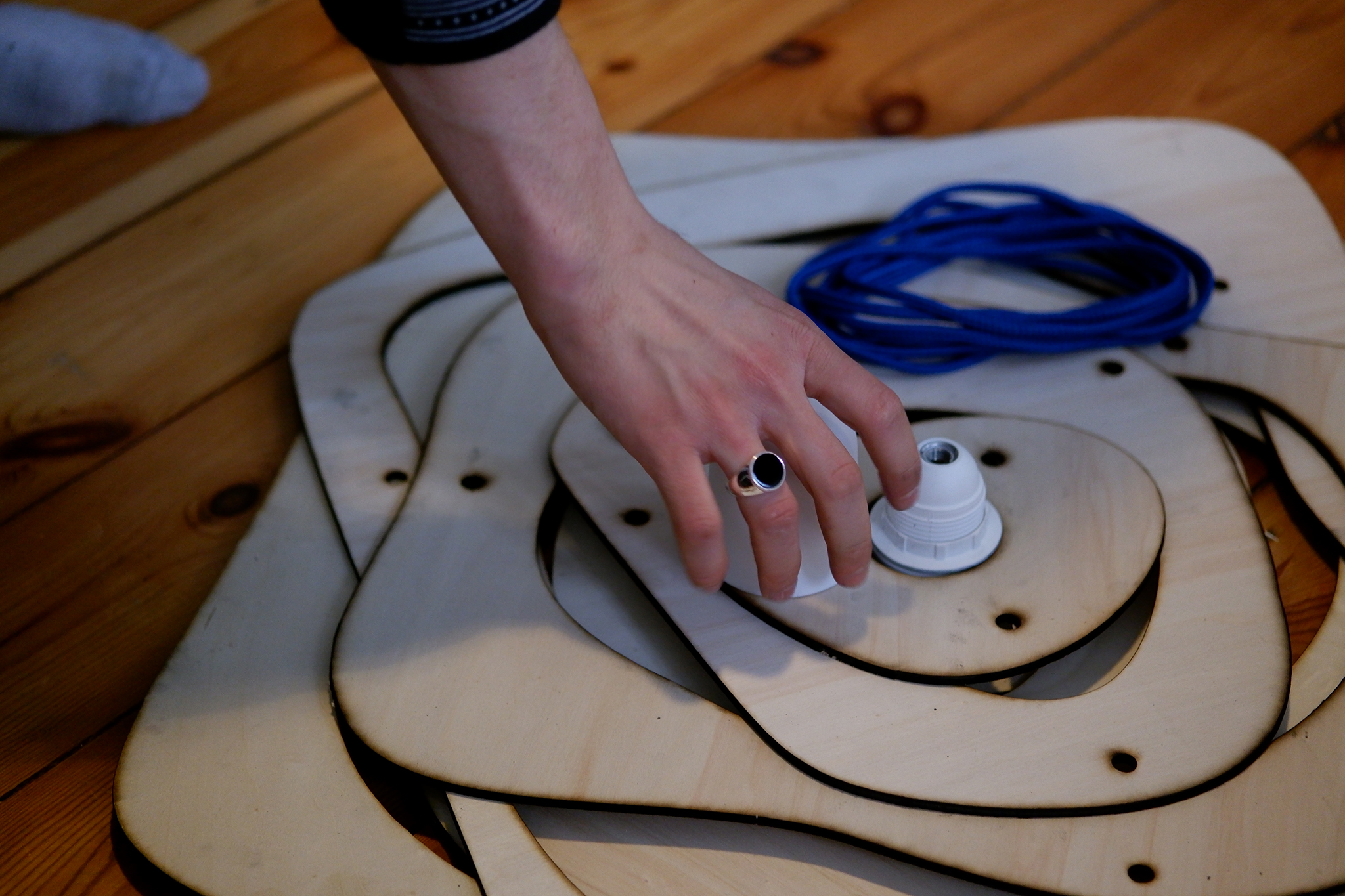NEST is a pendant lamp made of wood, which consists of organically shaped wooden parts, which are held together by 3 ropes. The panels rest on nodes in the ropes. The shape of the individual wooden parts is ehr undefined. The ropes, by which the wooden parts are held together, however, together form a clear sphere, which additionally brings order to the construction. The warm light of the lamp is additionally enhanced by the light wood. Despite the open construction, the lamp has its own inner life and the layered construction creates an open and warm atmosphere in the room. In the manufacture of the lamp, there is also little waste, because the individual parts fit perfectly into each other. Thus, NEST is also efficient in its production and can also be delivered or stored space-efficiently.