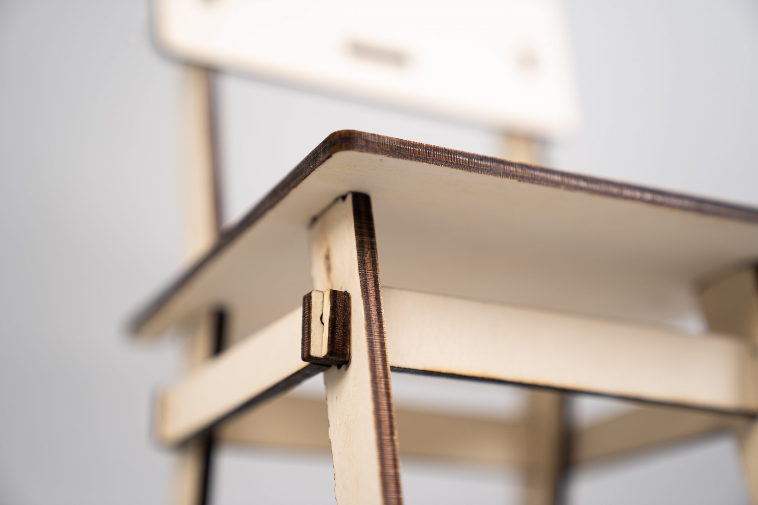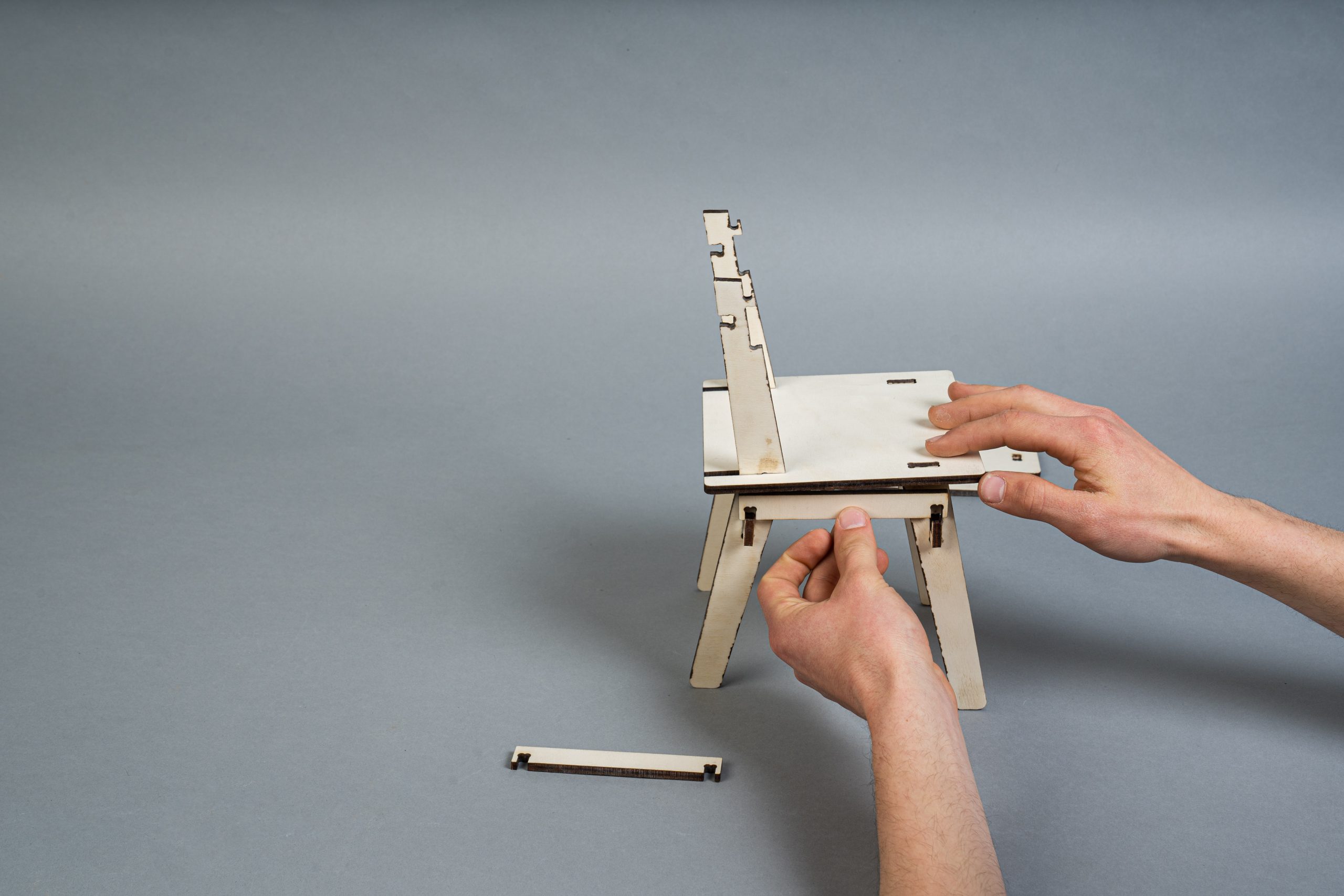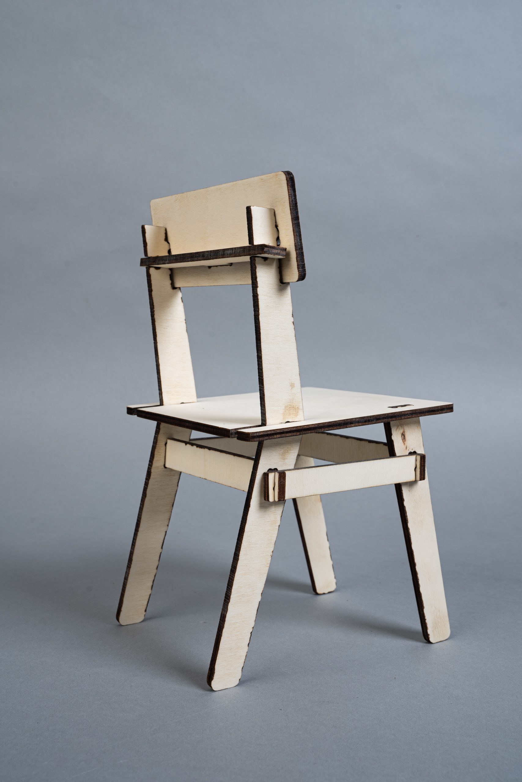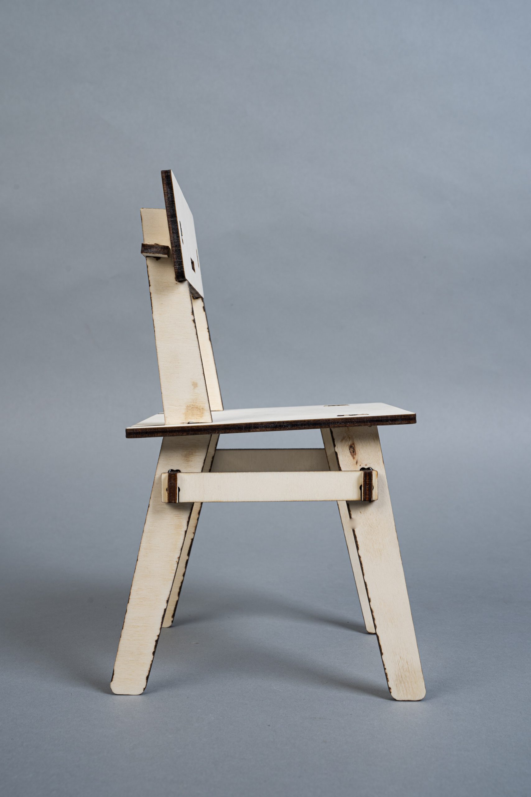 A minimalist chair CNC machined from a sheet of plywood. This project faces two challenges: maximum material efficiency through an optimized arrangement of the individual parts during the milling process and the elimination of connecting elements such as screws, dowels or glue. The design is based on a simple plug connection. This means that it can be quickly disassembled into all the individual parts and also reassembled without any tools. The arrangement of the individual parts for the milling process was optimized for a set consisting of four chairs. These can thus be produced from one plate (2,440mm x 1220mm) with minimal waste.
