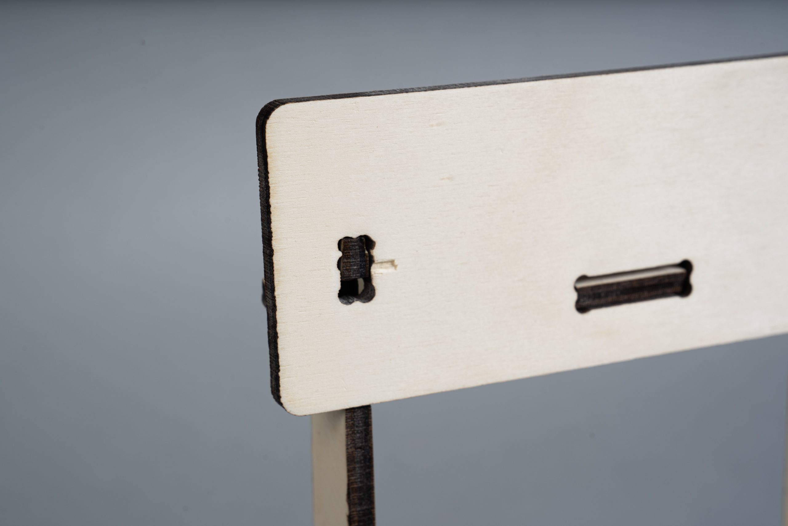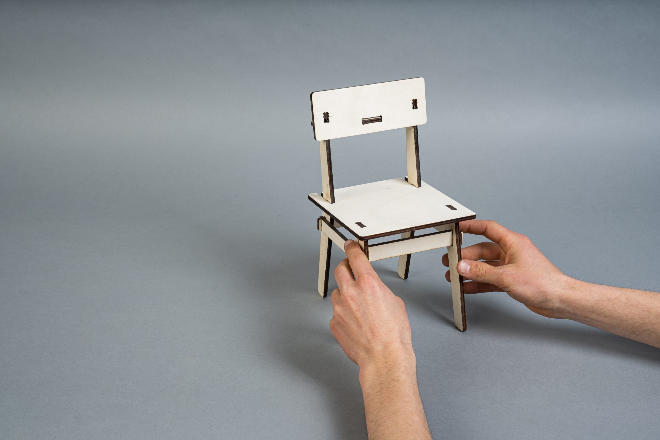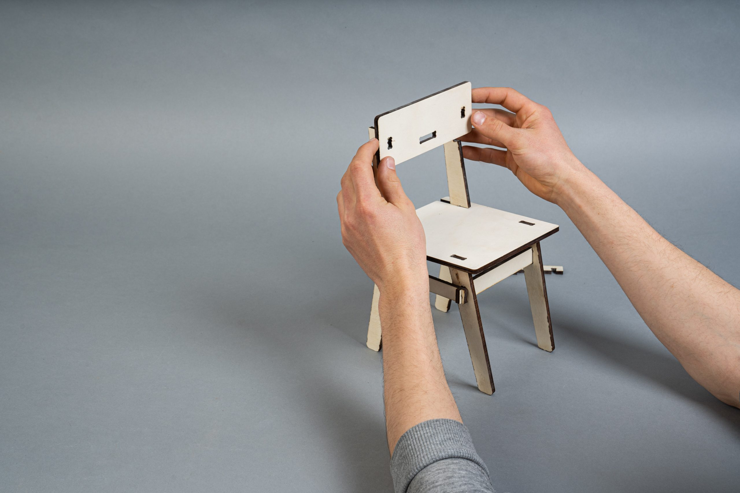 A minimalist chair CNC machined from a sheet of plywood. This project faces two challenges: maximum material efficiency through an optimized arrangement of the individual parts during the milling process and the elimination of connecting elements such as screws, dowels or glue. The design is based on a simple plug connection. This means that it can be quickly disassembled into all the individual parts and also reassembled without any tools. The arrangement of the individual parts for the milling process was optimized for a set consisting of four chairs. These can thus be produced from one plate (2,440mm x 1220mm) with minimal waste.