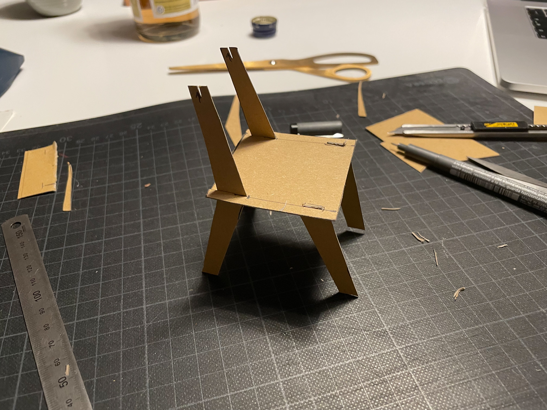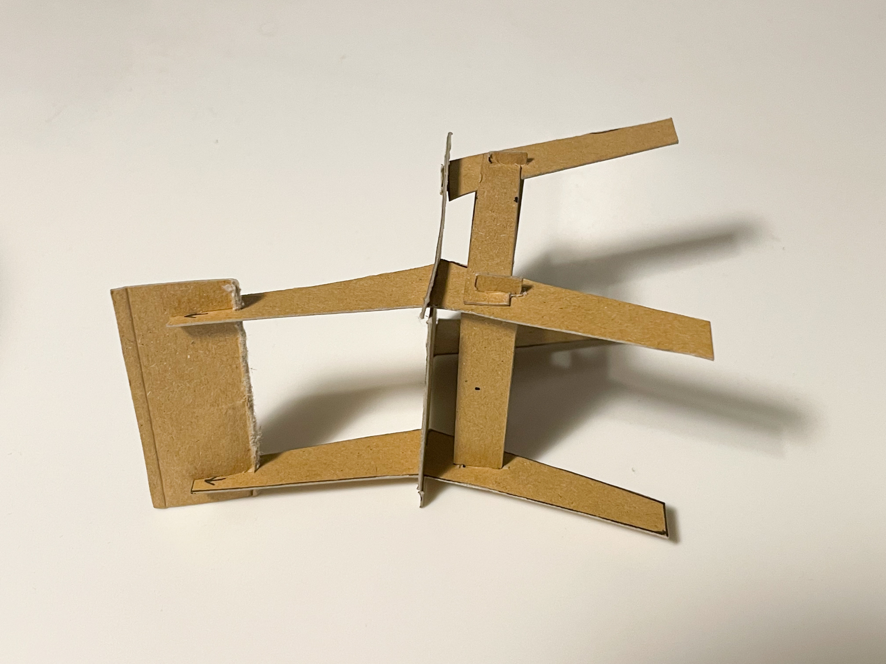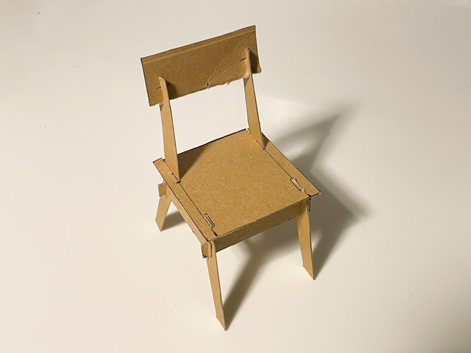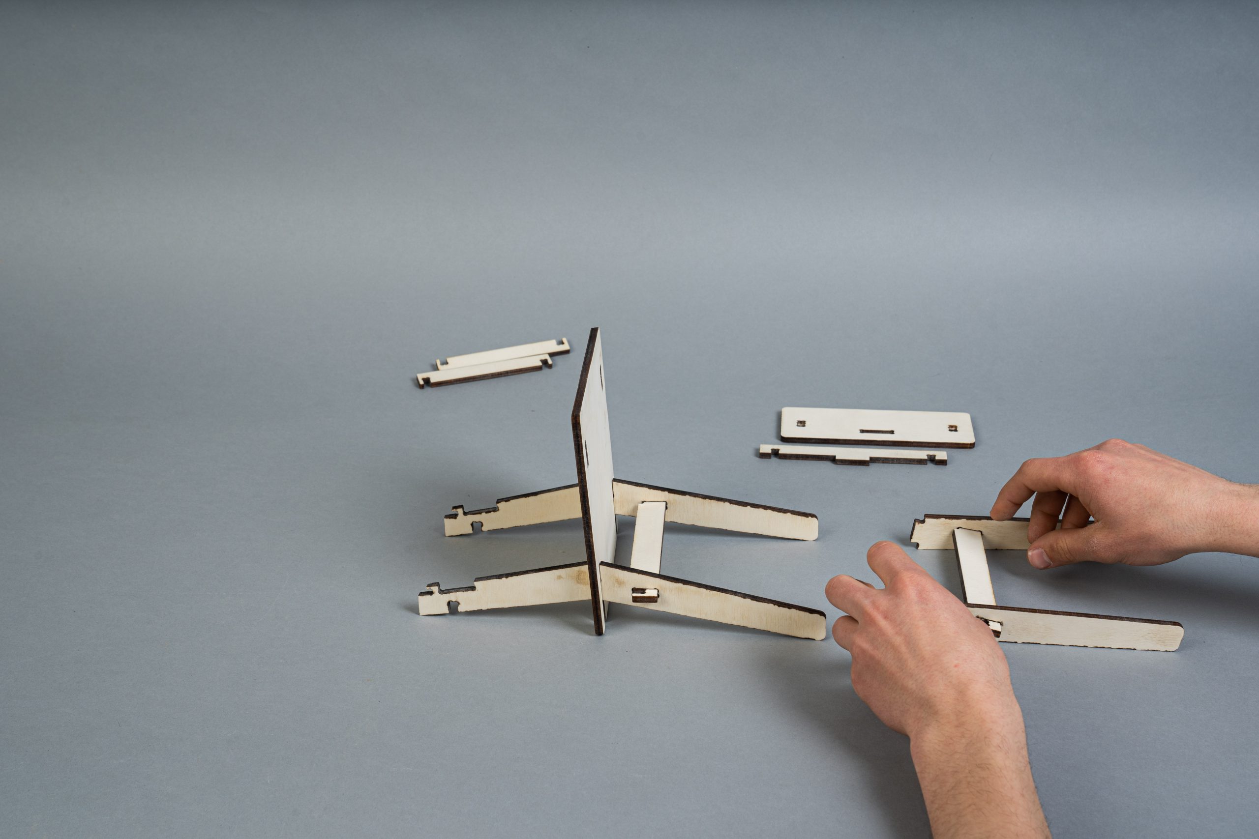 A minimalist chair CNC machined from a sheet of plywood. This project faces two challenges: maximum material efficiency through an optimized arrangement of the individual parts during the milling process and the elimination of connecting elements such as screws, dowels or glue. The design is based on a simple plug connection. This means that it can be quickly disassembled into all the individual parts and also reassembled without any tools. The arrangement of the individual parts for the milling process was optimized for a set consisting of four chairs. These can thus be produced from one plate (2,440mm x 1220mm) with minimal waste.